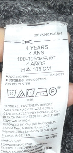 Keep your young one warm and comfortable with this charming Baby Gap grey cardigan, perfect for layering in cooler weather. Crafted from a soft and durable cotton blend, this knitted cardigan features a cosy ribbed texture, giving it a classic, timeless appeal. The cotton-rich fabric ensures breathability, while the added polyester enhances durability and shape retention. Designed in a versatile grey tone, it pairs effortlessly with any outfit — whether for everyday wear, outings, or family gatherings. This long-sleeve button-up cardigan includes two front patch pockets, providing handy storage for small essentials or simply a place for tiny hands to rest. It has a stylish shawl collar that adds a smart, snug look while keeping the neck area warm. With its regular fit and ribbed hem and cuffs, it delivers both comfort and a neat silhouette. Machine washable for easy care, this piece is both practical and cosy. Tailored for boys aged around four years, this Baby Gap cardigan is ideal for the autumn and winter seasons, offering warmth without bulk. The neutral tone makes it an adaptable staple for your child’s wardrobe and an easy gift option for birthdays or seasonal celebrations. Perfect for layering over shirts or tees, it maintains a clean and polished appearance ideal for casual or slightly dressy occasions. Choose this Baby Gap cardigan for a dependable, fashionable staple that balances comfort, quality, and style — a must-have addition to any young boy’s cold-weather wardrobe.