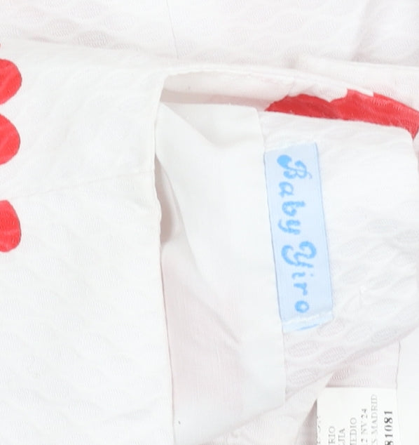 Brighten up her wardrobe with this charming Baby Giro girls’ dress, a perfect choice for special occasions or everyday play. Designed in a fresh white base with bold red floral prints, this delightful sleeveless dress captures a playful yet elegant style ideal for spring and summer wear. The A-line cut allows for comfortable movement, while the knee-length fit offers a sweet and traditional silhouette. Made from a soft polyester and cotton blended woven fabric, the dress achieves durability with a breathable lightweight feel, making it perfect for warmer weather. The lined interior adds a touch of quality and structure to the overall fit. Featuring a classic round neckline and a button fastening to the back, the dress combines practicality with charm, making it easy to wear and secure. The floral pattern truly stands out, providing a cheerful aesthetic that easily suits party settings, casual outings, or even family gatherings. Designed for girls aged 5 years, this dress provides a secure and comfortable fit with a chest measurement of approximately 26 inches and a waist size of 53 cm. Though gently pre-loved, the piece does show some light creasing and faint stains near the hemline, reflected in its condition grading of 'Good'. These small imperfections do not diminish the overall appeal or wearability of the dress. Its quality make ensures it retains charm and wear value for many more outings. Machine washable for easy care, this dress offers a combination of style and practicality parents will appreciate. Whether you’re planning for a party or simply seeking a comfortable yet stylish everyday piece, this Baby Giro dress is a beautiful addition. A bright, bold floral design paired with classic tailoring ensures it remains a timeless option for your little one’s wardrobe.