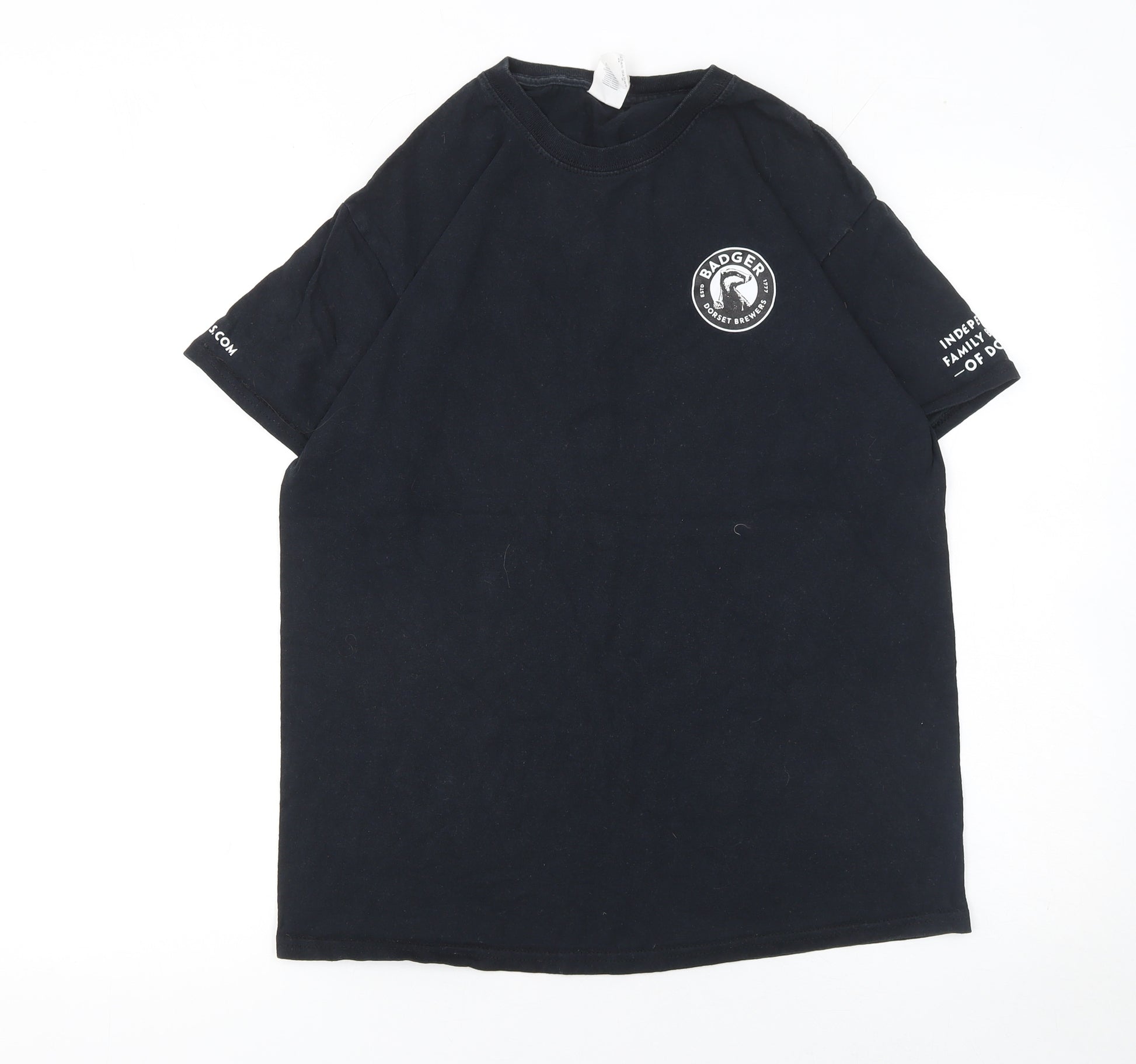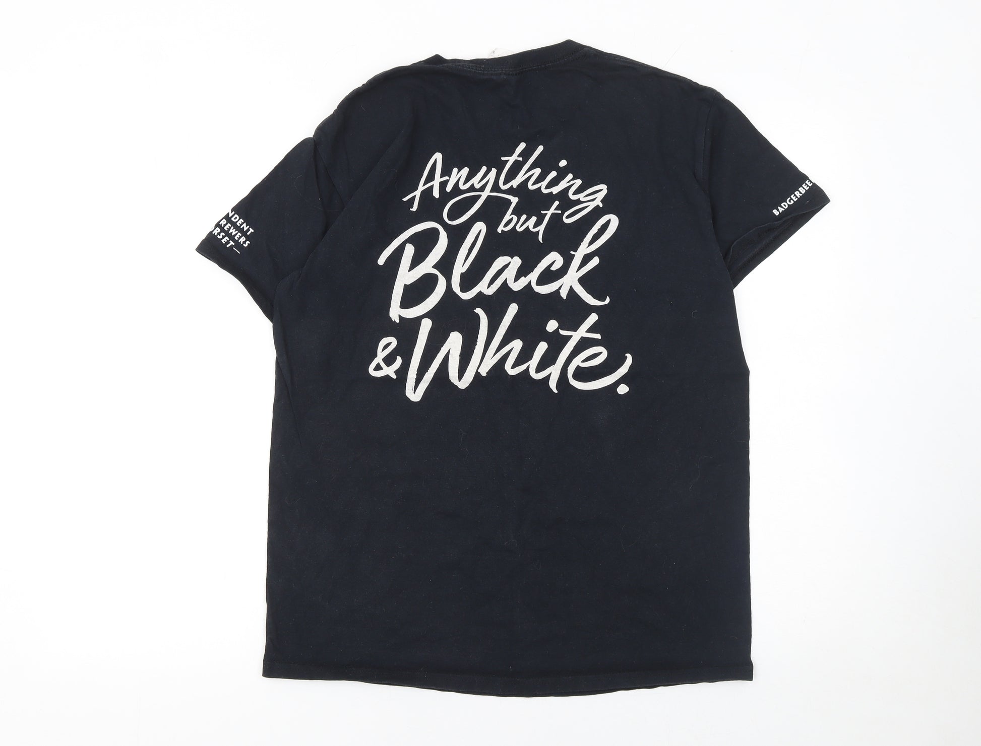 Celebrate classic British brewing heritage with this authentic Badger Dorset Brewers men's T-shirt. Crafted from 100% soft cotton, this black jersey tee offers breathable comfort and all-day wearability, making it perfect for casual outings or relaxed weekends. The front of the shirt features a crisp printed Badger Dorset Brewers logo, while the back showcases the bold slogan 'Anything but Black & White' in white script, giving it a fun and eye-catching design that appeals to beer enthusiasts and fans of distinctive brewery apparel alike. With its high-quality cotton fabric, this T-shirt is lightweight, easy to care for, and machine washable, ensuring simple maintenance and longevity. The short sleeves, crew neckline, and regular fit provide a classic silhouette suitable for men who appreciate effortless style with a playful twist. Whether layered under a jacket or worn on its own through spring and summer, this tee delivers understated charm with a strong hint of character. The black base ensures versatility, pairing easily with denim, chinos, or shorts for a laid-back, contemporary look. Perfect as a wardrobe staple, a collector's item for brewery fans, or a thoughtful gift for lovers of quality British ales, this T-shirt expresses individuality without compromising comfort. Though lightly worn, it remains in very good condition, with no noticeable fabric damage and strong graphic integrity. Ideal for casual occasions, pub nights, or lounging at home, the Badger Dorset Brewers T-shirt captures the spirit of independent brewing in a timelessly simple piece that blends humour, tradition, and comfort. A must-have addition for any discerning beer enthusiast’s casual rotation, this garment brings together craftsmanship, comfort, and charm in one effortlessly wearable design.