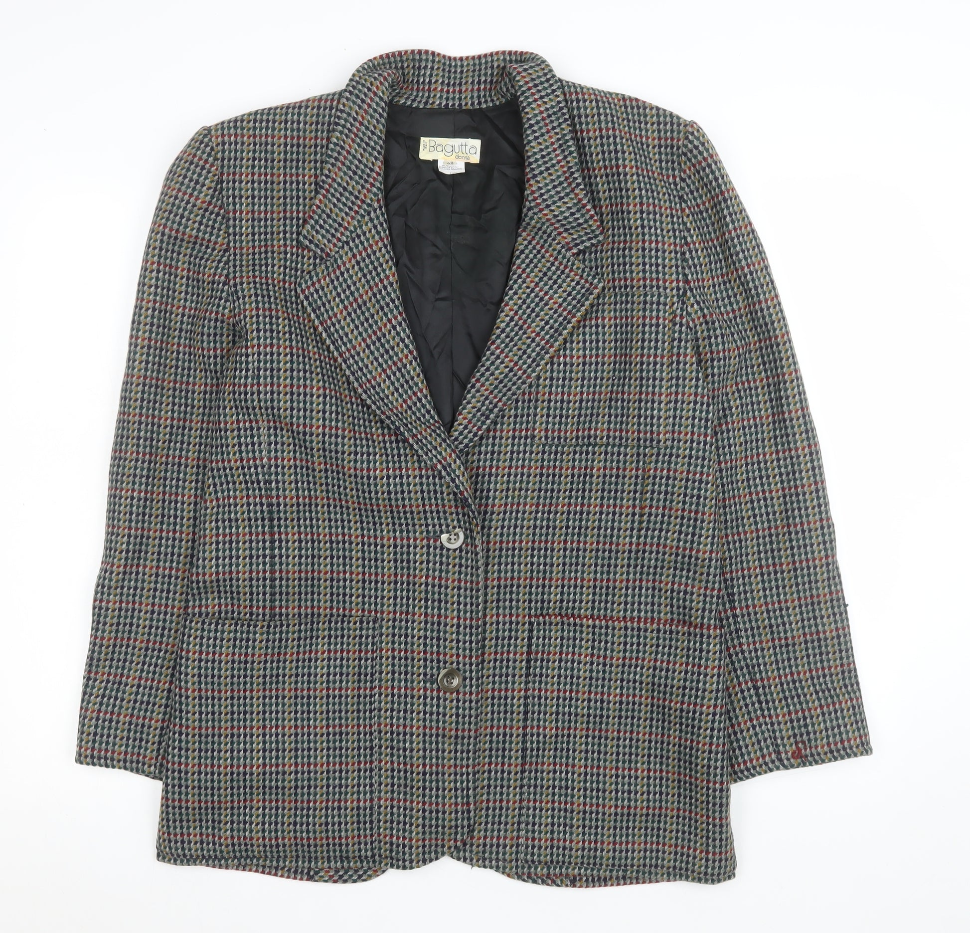 This stunning Bagutta women's blazer brings together Italian craftsmanship and timeless sophistication, perfect for those who appreciate classic tailoring with a vintage touch. Made in Italy from premium 100% wool tweed, this single-breasted blazer features a multicoloured houndstooth pattern that combines shades of green, red, yellow, and navy to create an eye-catching yet tasteful look. Ideal for autumn and winter wear, the jacket’s medium-weight wool fabric provides both comfort and structure. The smart notch lapels and two-button front closure emphasise its tailored silhouette, while the fully lined interior in smooth viscose enhances comfort and durability. Functional front pockets and a vent at the back ensure practicality without compromising elegance. The long sleeves and regular length make it a versatile piece that pairs beautifully with trousers, skirts, or even jeans for a smart-casual touch. Designed for business, casual, or workwear occasions, this blazer reflects a blend of professionalism and vintage style, suitable for any wardrobe. The quality of construction and the traditional houndstooth pattern make it an enduring fashion statement that transcends seasonal trends. In excellent pre-owned condition with only minor signs of wear, this Bagutta blazer is an elegant addition to any collection. Perfect for layering over blouses or lightweight knitwear, offering both warmth and sophistication in cooler seasons. A must-have for style-savvy women who appreciate fine Italian tailoring and versatile fashion that feels both classic and current.