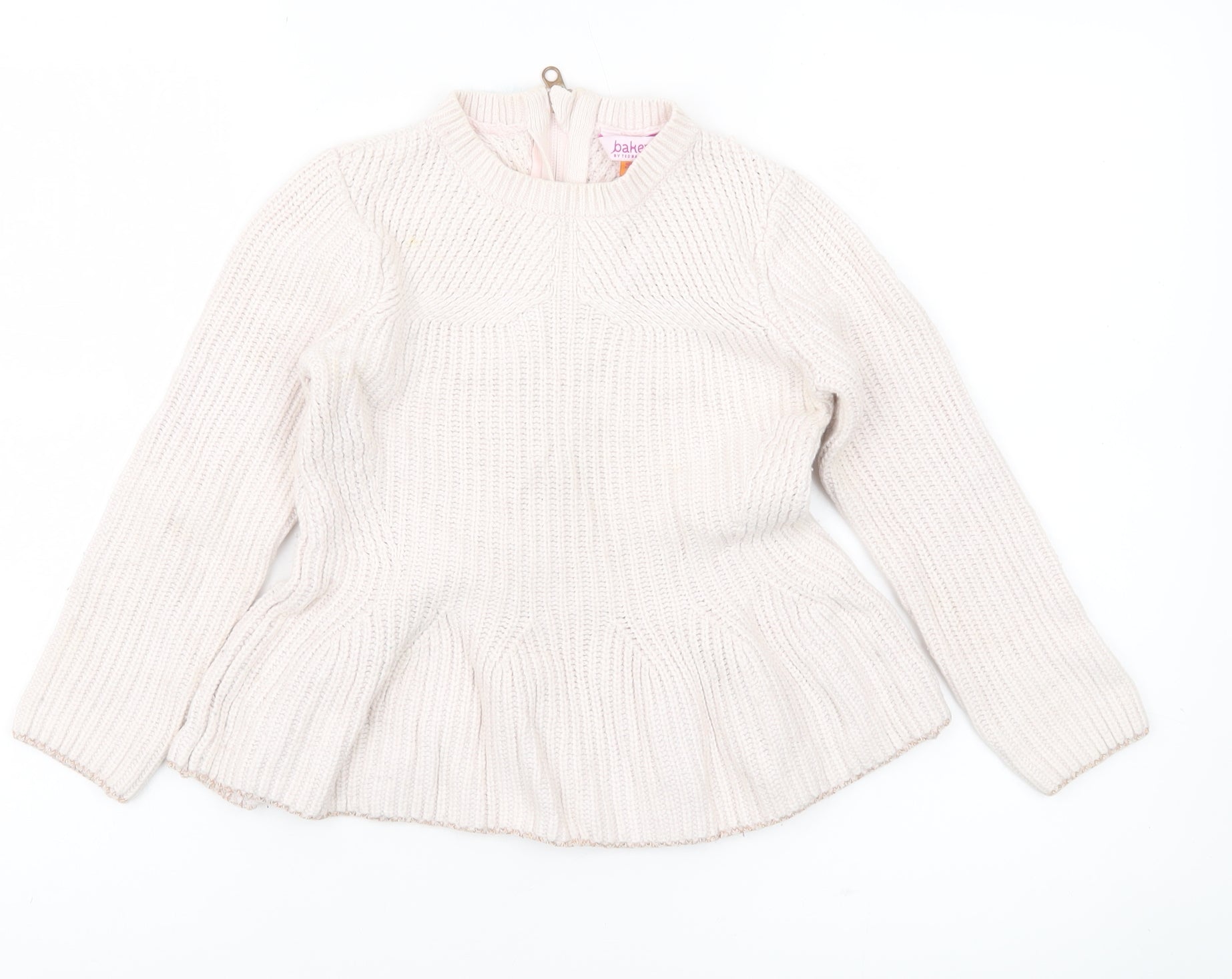 This lovely girls’ jumper from Baker by Ted Baker offers a perfect combination of warmth, comfort, and classic design. Crafted from a soft, warm blended knit of cotton, viscose, nylon, and a touch of wool, this jumper provides both durability and a premium feel. The fabric blend ensures breathability, softness against the skin, and flexibility that makes it comfortable enough for everyday wear while also being stylish for special occasions.Designed in a chic ivory shade, this jumper is versatile enough to pair with skirts, dresses, jeans, or leggings, making it a wardrobe essential. The ribbed knit construction adds subtle detail while offering extra warmth during the colder seasons. Featuring a crew neckline and long sleeves, it has a timeless silhouette that is both elegant and practical. The fitted ribbed body and flared hemline create a beautiful peplum-like effect, giving the piece a stylish feminine shape.The back zip closure makes dressing easy, providing both practicality and a neat fit. Perfect for autumn and winter, this jumper will keep your little one cosy without compromising on fashion. Whether worn casually for everyday adventures, or dressed up for a party or family gathering, it works well for multiple occasions.This jumper is in very good pre-loved condition, with only light wear noted and no major flaws. It does not have the original sales tags, but it remains in excellent wearable condition. Sized for 6 years, it makes a wonderful choice for parents seeking a high-quality designer knit at an affordable price.Overall, this Baker by Ted Baker ivory knit jumper is a stylish, practical, and high-quality addition to any young girl’s wardrobe. Combining everyday comfort with a premium branded design, it is certain to be a much-loved piece for the colder months ahead.