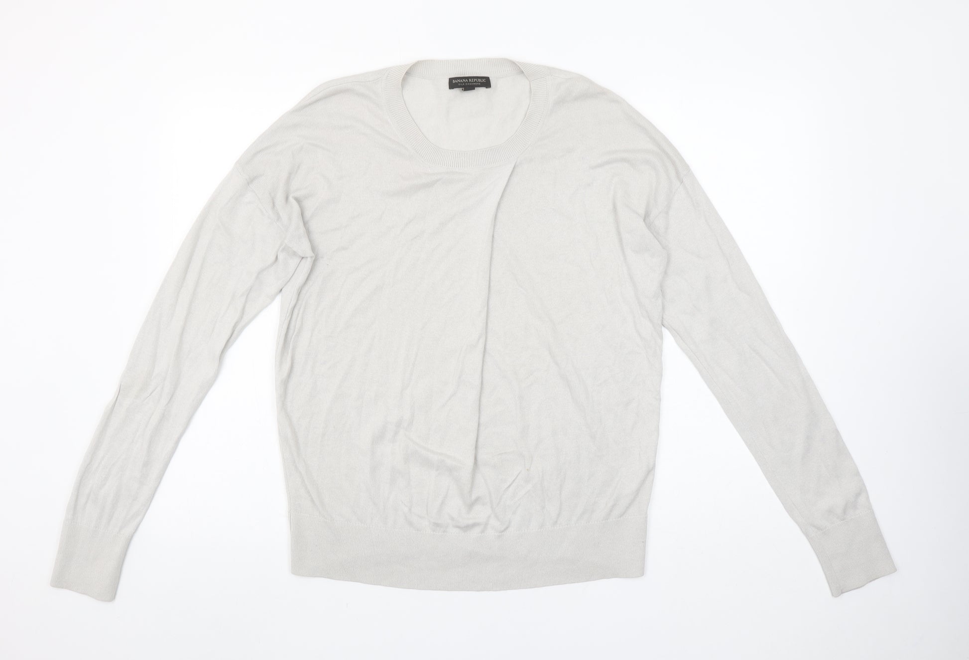 Elevate your knitwear collection with this luxurious Banana Republic women’s jumper, crafted from a premium blend of silk and cashmere for a soft, lightweight feel. Designed in a timeless beige tone, this classic pullover offers effortless sophistication while providing versatile styling options suitable for both casual and business settings. The fine tight-knit construction and smooth fabric ensure comfort, breathability, and a graceful drape that flatters every silhouette. Featuring a simple crew neckline and long sleeves, it’s the perfect layering piece for all seasons—ideal for pairing with tailored trousers, jeans, or a sleek skirt. The jumper’s delicate texture makes it exceptionally comfortable, lending an understated elegance for everyday wear or smart-casual occasions. Hand wash only to maintain its quality and softness over time. Although pre-loved, this piece remains in excellent condition with only light signs of wear and minimal creasing. Discover effortless style and comfort with this Banana Republic silk-cashmere jumper, a wardrobe staple that seamlessly transitions between workwear and leisurewear. Whether for autumn layering, crisp spring days, or cool winter evenings, this finely made piece offers versatile luxury with enduring appeal—an ideal choice for those seeking refined simplicity and timeless quality.