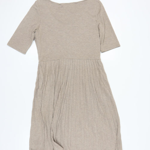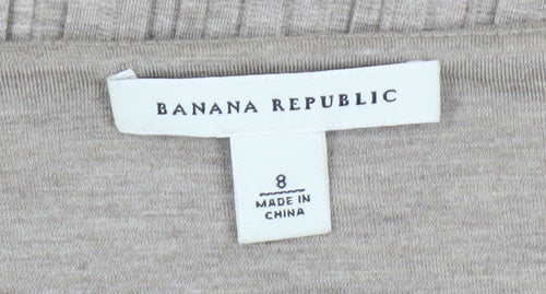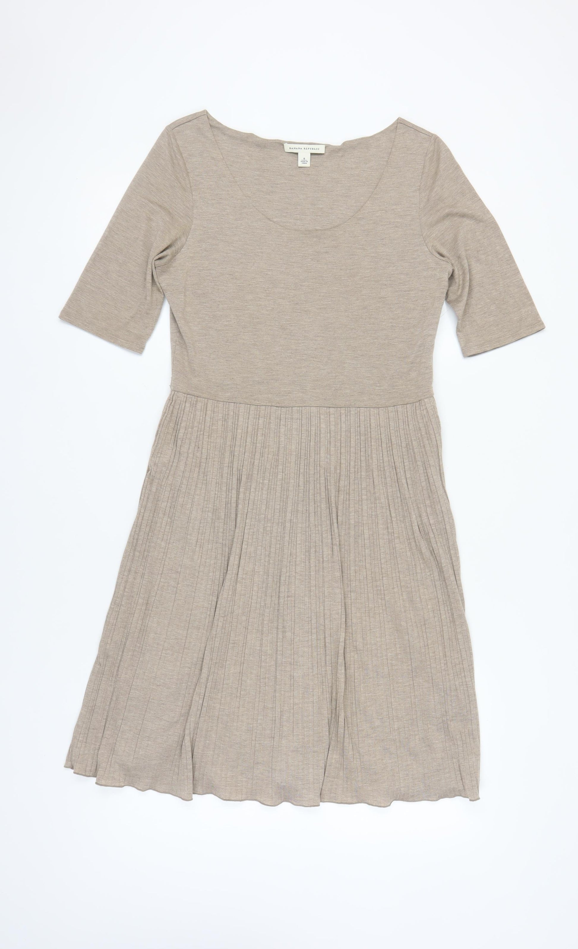 Embrace elegance and simplicity with this delightful Banana Republic dress, tailored for the modern woman. Crafted in a versatile beige hue, this A-Line dress offers both comfort and style. Made from a blend of cotton and modal, it features a supremely soft texture and a hint of elastane for added flexibility, ensuring that you look and feel your best throughout the day.Perfect for casual outings or seasonal celebrations, this dress boasts a scoop neckline and half sleeves, providing a flattering silhouette suitable for spring and summer. The jersey fabric offers excellent breathability and a graceful drape, while the subtle pleated design adds a touch of sophistication without overwhelming the minimalist aesthetic.Enjoy the effortless charm and ease of wear with its pullover closure, making it a practical choice for women on the go. Designed with the modern wardrobe in mind, this dress is machine washable, ensuring convenience and durability over time.Whether paired with stylish flats for a relaxed outing or dressed up with heels for a chic brunch, this dress is a versatile addition to any wardrobe, awaiting your personal touch. Its condition is excellent, showing only mild wear from previous enjoyment. Indulge in the timeless allure and fantastic quality offered by Banana Republic in this stylish piece.