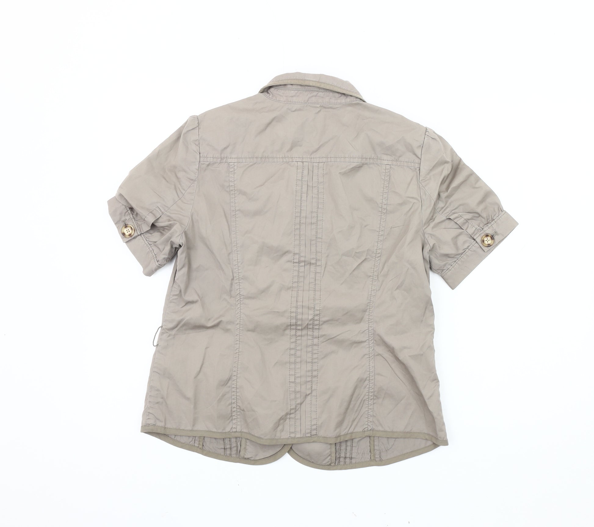 Elevate your wardrobe with this versatile Banana Republic blazer, ideal for both casual outings and professional settings. Tailored for women, this beige blazer adds a touch of elegance and sophistication to your ensemble. Crafted from a comfortable cotton blend with a hint of elastane, it ensures you move with ease, making it perfect for spring and summer. The regular fit provides a flattering silhouette, while the short sleeves keep you cool and stylish. Featuring a classic notch lapel and three-button front, this single-breasted piece is both timeless and chic. With subtle accents like the single button on the sleeves, it's sure to make a subtle yet impactful statement. Despite being pre-loved, this blazer remains in excellent condition, showing minimal signs of wear. Perfect for day-to-day activities or dressing up for the office, this Banana Republic blazer is a must-have addition to any fashion-forward wardrobe.