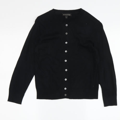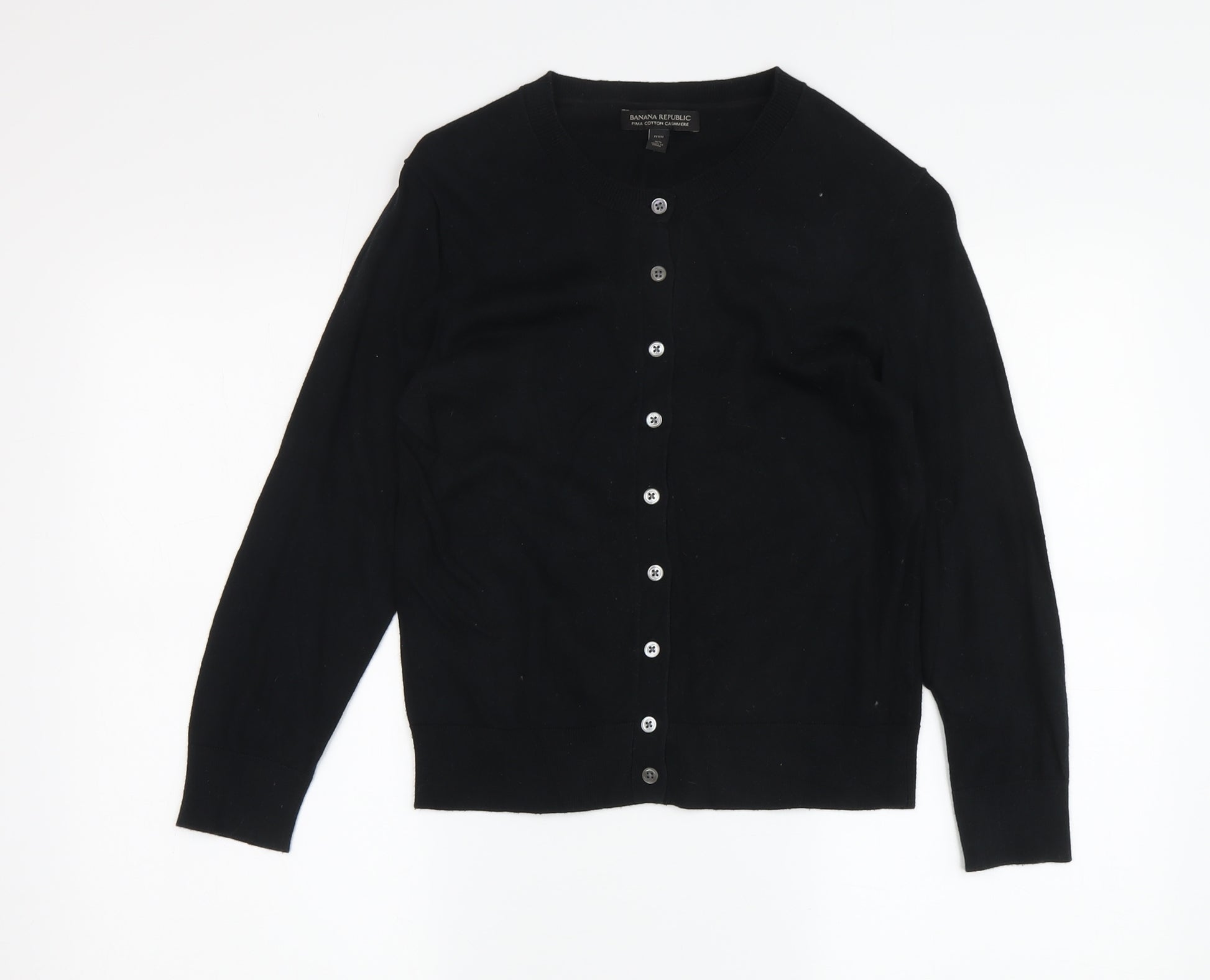 Step out in style with this classic Banana Republic cardigan in a timeless black hue. Designed for casual occasions, it features a crew neckline, long sleeves, and a tight-knit fabric that tends to your comfort throughout the cooler seasons. The blend of high-quality cotton and luxurious cashmere ensures a soft touch and adds a dash of elegance to your ensembles. Touting a regular fit suitable for petite figures, this wardrobe essential meets both fashion and practicality. Versatile and easy to match with a variety of outfits, it is adorned with buttons for a sophisticated finish. Careful attention to detail characterizes the construction of this cardigan, making it a durable choice for this season and beyond. Perfect for layering during the transitional months of autumn and spring, this piece is both lightweight and cozy. Give your outfit a boost of chic simplicity with this Banana Republic cardigan. In excellent condition, it promises to be a valuable addition to your collection. Hand washable for easy care, this piece is not only stylish but also convenient to maintain. Acquire this elegant cardigan today and embrace a classic look that effortlessly complements your wardrobe.