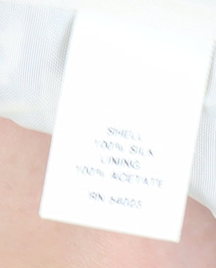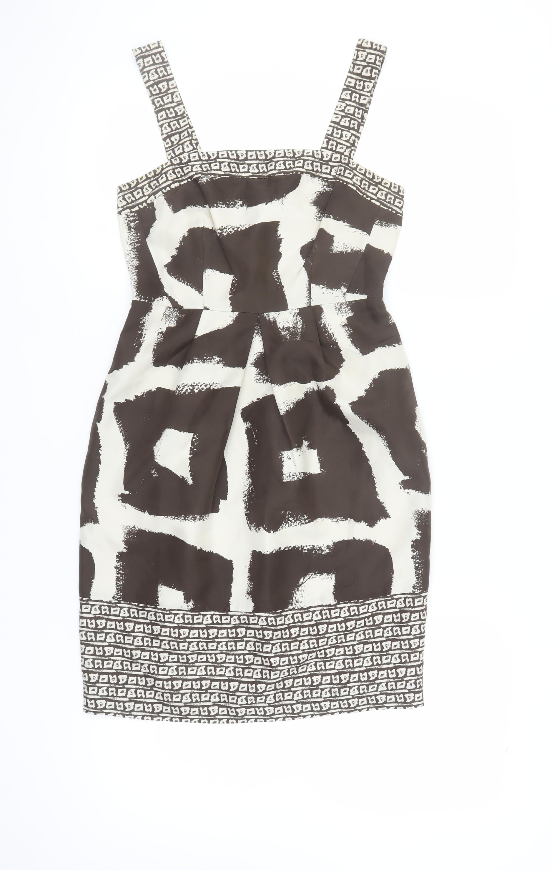 Step into elegance with this Banana Republic women's sheath dress, crafted from luxurious 100% silk in a chic brown geometric pattern. Featuring a flattering knee-length cut, this dress is perfect for summer occasions. Designed with a square neckline and strappy sleeves, it offers a sophisticated silhouette that suits casual gatherings or stylish outings. The zip closure ensures a snug fit, while the woven silk fabric adds a touch of opulence and comfort. Embrace a polished, yet effortless look with this versatile piece that pairs beautifully with your favourite accessories. In excellent condition, it offers a sleek and fashionable choice for your wardrobe.