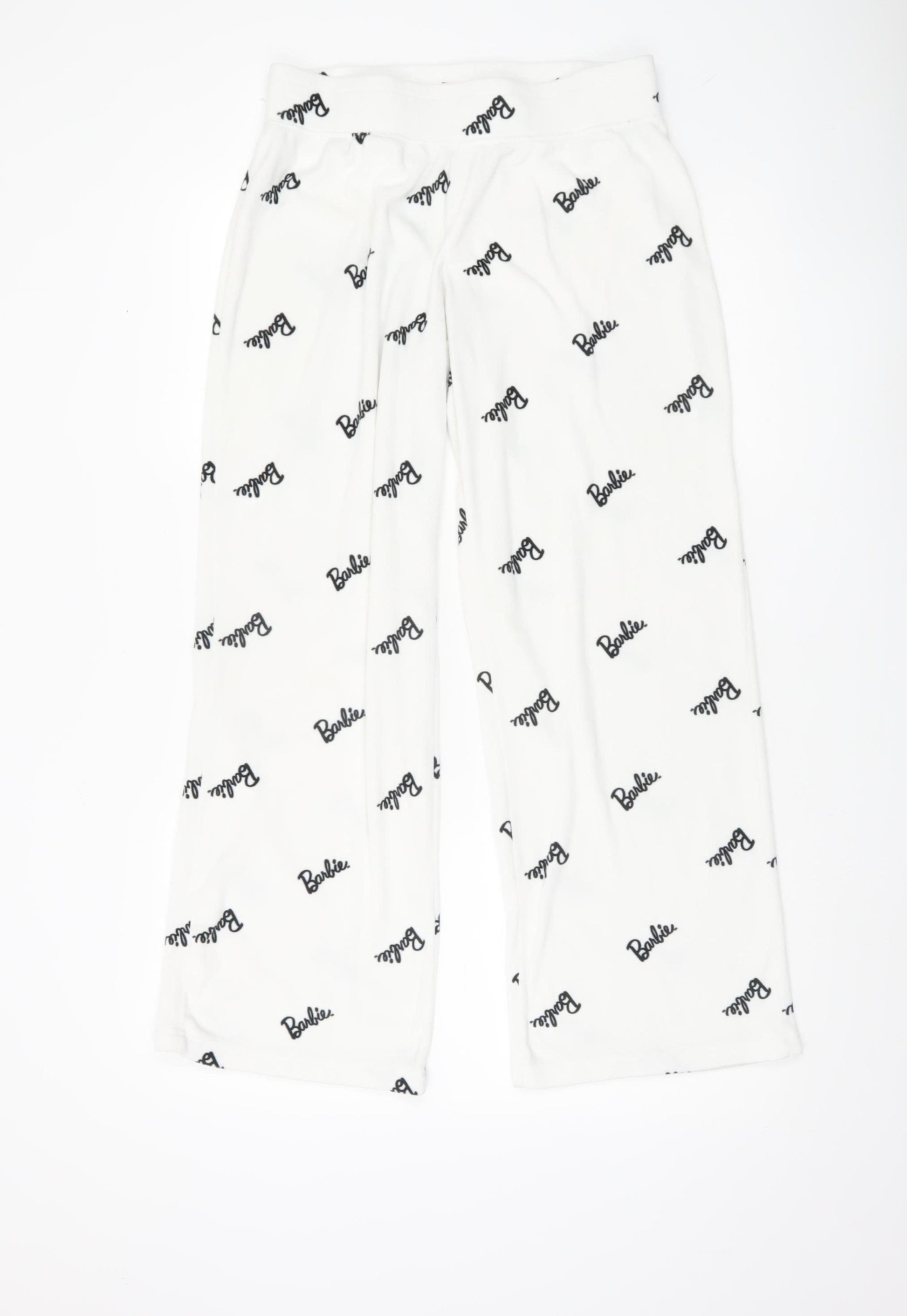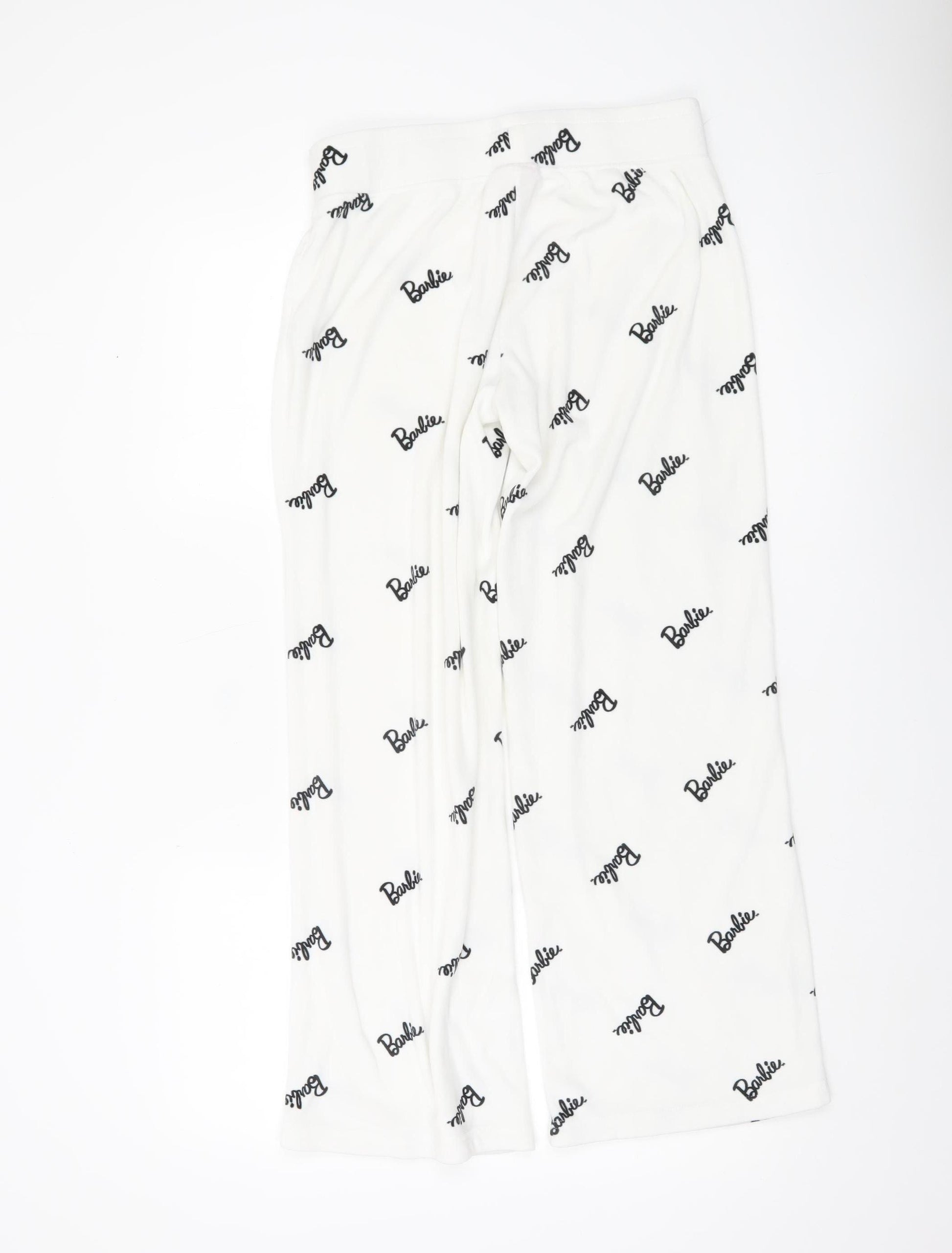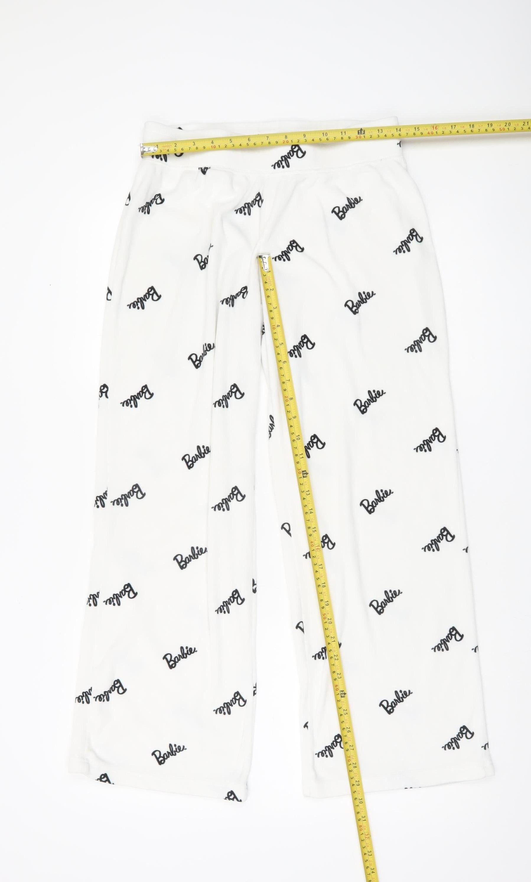 Add a cosy touch of fun to your nightwear collection with these officially branded Barbie women's pyjama pants. Finished in a crisp white fleece fabric with a playful all-over Barbie logo print in contrasting black, these trousers combine comfort and style perfectly for bedtime or lounging at home. Designed in a soft fleece fabric made from 98% polyester and 2% elastane, they offer slight stretch for ease of movement while providing warmth and softness against the skin. The elasticated waistband with drawstring closure adds adjustability and ensures a comfortable fit throughout the day or night.This pair comes in a UK size 10-12, making it an ideal choice for women who prefer a relaxed but flattering fit. The straight-leg trouser style gives them a casual loungewear silhouette, while the lightweight fleece fabric makes them perfect for cooler nights in autumn and winter. Machine washable, they are easy to care for and built for regular wear without losing shape or softness.Accented with the iconic Barbie logo throughout, this piece carries a fun cartoon-inspired theme that will appeal to fans of the brand. Versatile and stylish, they can be worn for bedtime, casual home wear, or teamed with other Barbie sleepwear items to complete the look. With their excellent condition and no visible flaws or damage, these trousers provide plenty of wear left for their next owner.Whether purchased as a gift for a Barbie enthusiast or as a personal upgrade to your loungewear wardrobe, these pyjama pants deliver a blend of playful nostalgia and practical comfort. Priced affordably, they offer a great value option for stylish branded nightwear. Treat yourself to comfort and character with this must-have sleepwear essential, perfect for relaxing evenings or lazy mornings.