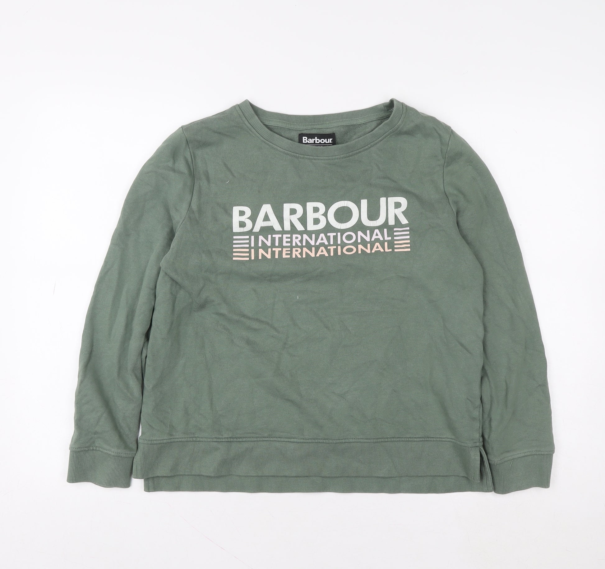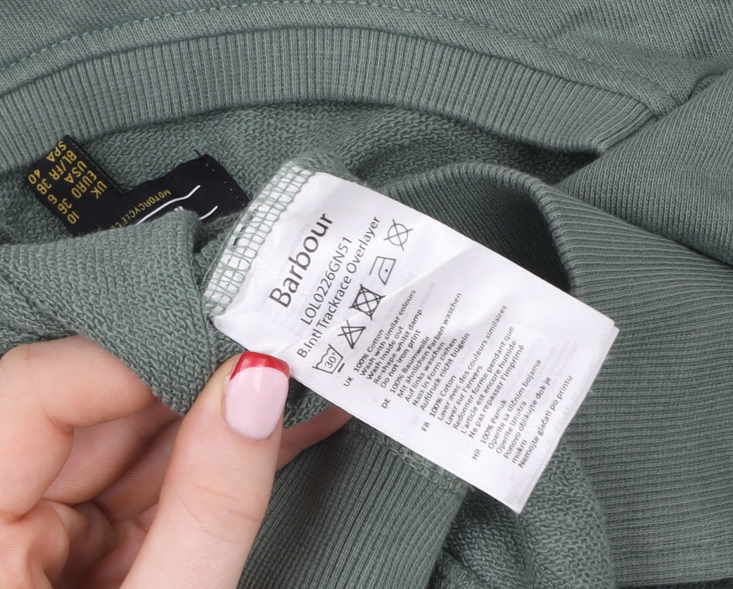 Upgrade your casual wardrobe with this stylish Barbour International women’s sweatshirt, designed to combine comfort, quality, and effortless style. Crafted from soft 100% cotton, this premium pullover offers a breathable and comfortable wear, perfect for all seasons. The gentle green hue gives a fresh and versatile look that pairs beautifully with jeans, leggings, or joggers for a relaxed, laid-back outfit. Featuring the iconic Barbour International logo boldly printed on the chest, this sweatshirt celebrates the brand’s rich heritage in classic motorcycling fashion while maintaining a modern, feminine appeal. The ribbed cuffs, neckline, and hem ensure a snug and flattering fit, while side vents provide ease of movement. The crew neck design adds timeless simplicity, making this piece a wardrobe staple you can layer over shirts or under jackets for extra warmth. Designed for women who appreciate quality craftsmanship and practical style, this sweatshirt is ideal for casual days, weekend outings, or relaxed work-from-home wear. The premium cotton fabric is sure to provide durability and softness wash after wash. This gently used piece remains in excellent condition with only light signs of wear, offering you high-end style at a fraction of the original retail price. A must-have for any fan of heritage British brands, this Barbour International sweatshirt is both functional and fashionable. Its minimalist yet eye-catching design makes it the perfect piece to transition from lounging to errands in comfort and confidence. Add this versatile pullover to your collection and enjoy the blend of quality, comfort, and iconic design that only Barbour can deliver.