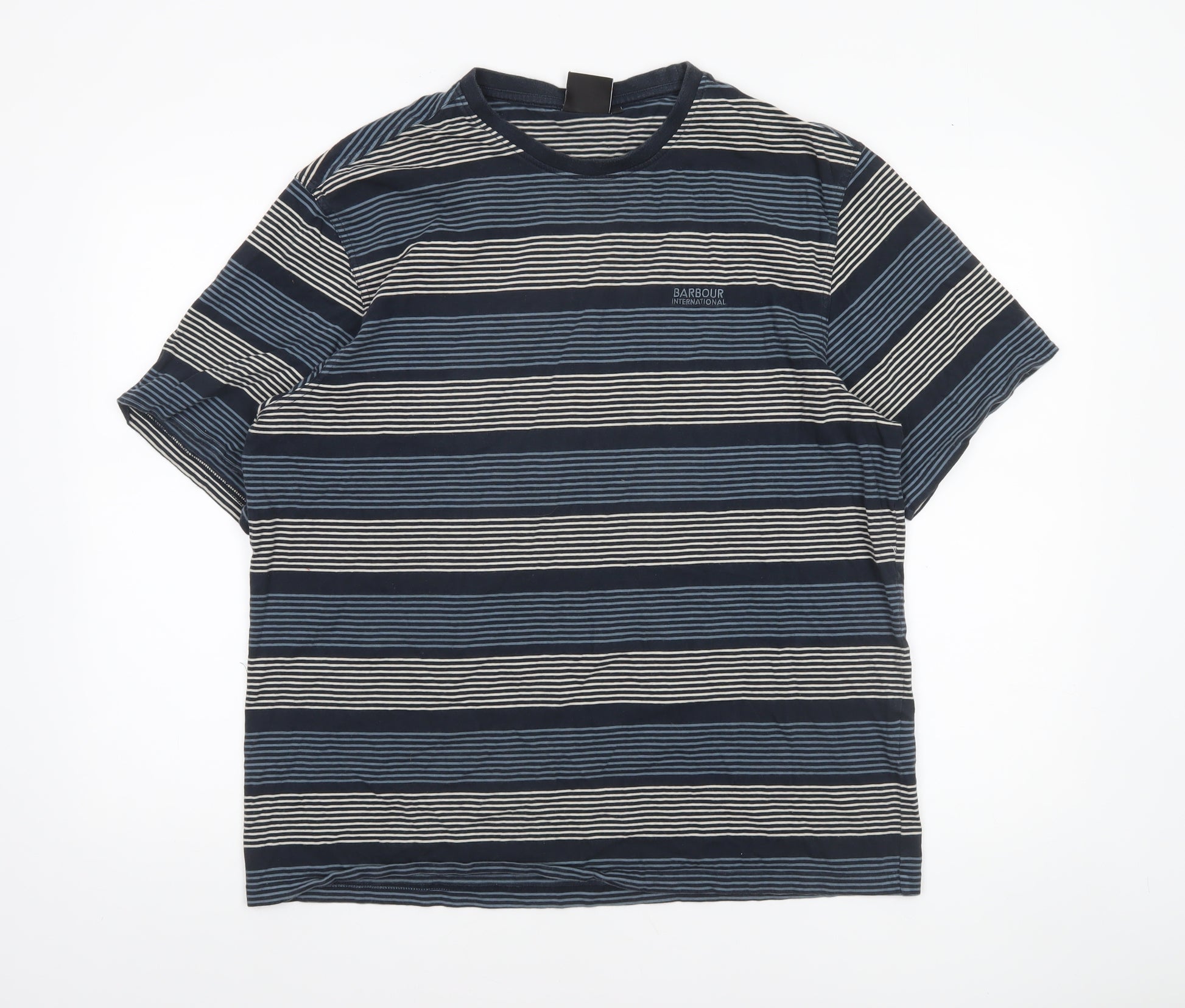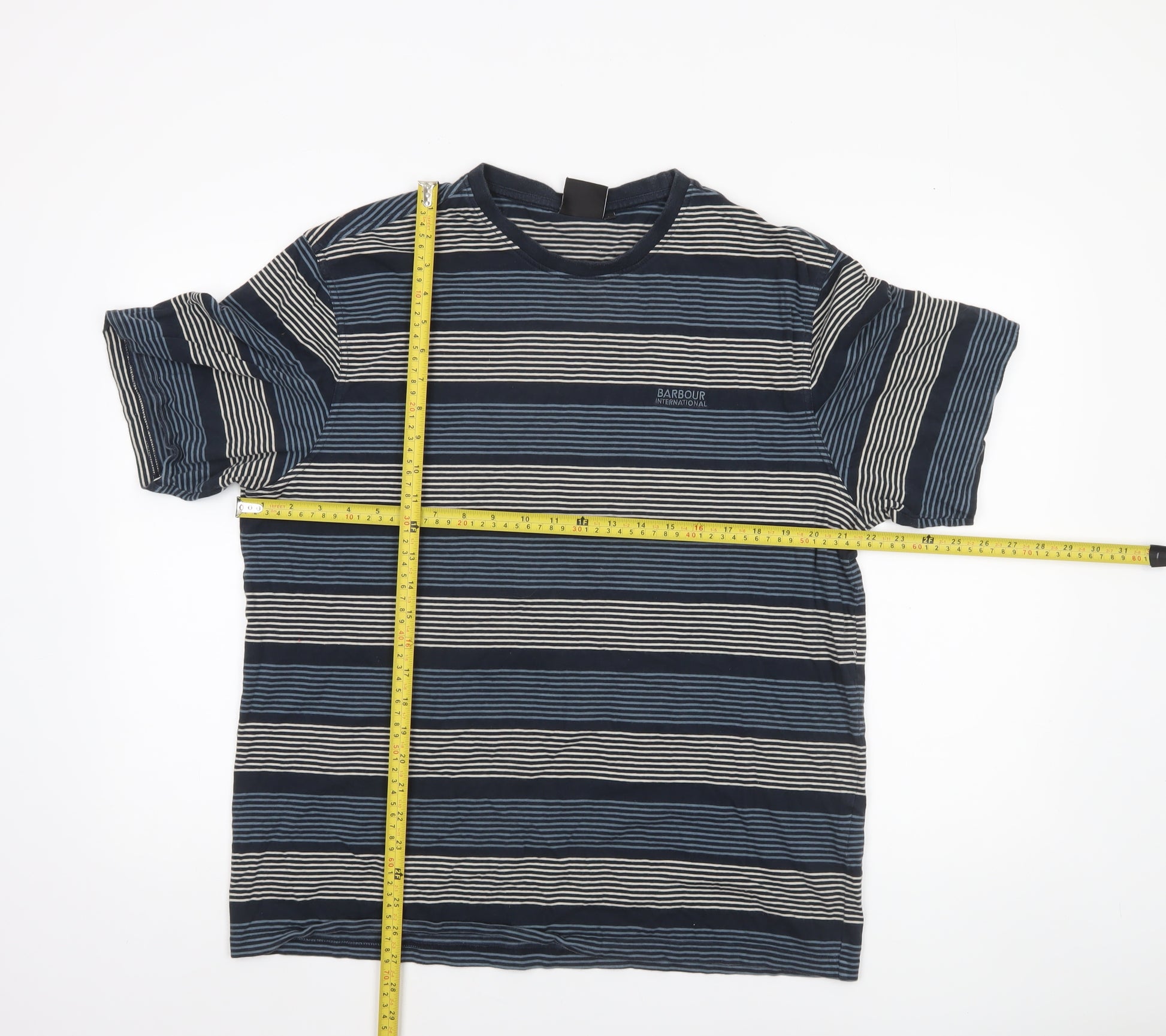 This Barbour International Men's Blue Striped T-Shirt combines timeless style with everyday comfort, making it a great addition to any casual wardrobe. Designed in a relaxed fit, it provides ease of movement and a laid-back silhouette perfect for all-day wear. The shirt features a classic crew neckline and short sleeves, offering a comfortable, breathable design ideal for warmer months or layering under casual jackets. Its blue and cream horizontal stripe pattern delivers a clean, nautical-inspired look that remains stylish season after season. Crafted from soft and durable jersey fabric composed of 97% cotton and 3% elastane, this T-shirt ensures comfort with a slight stretch for flexibility. The cotton base makes it breathable and easy to care for—machine washable for convenience—while the touch of elastane maintains shape and fit after wash and wear. The subtle Barbour International logo is embroidered on the chest, lending a refined accent that reflects the brand’s heritage of quality and craftsmanship dating back to 1936. Perfect for pairing with jeans, chinos, or casual shorts, this T-shirt transitions effortlessly from relaxed weekends to casual outings. Its striped design adds a fresh touch to everyday looks while preserving Barbour International’s signature understated sophistication. With its excellent pre-owned condition and minimal signs of wear, it’s a fantastic value option for anyone who appreciates dependable quality and timeless style in their wardrobe. Ideal for spring, summer, and autumn wear, this versatile tee easily becomes a go-to essential for any casual ensemble.