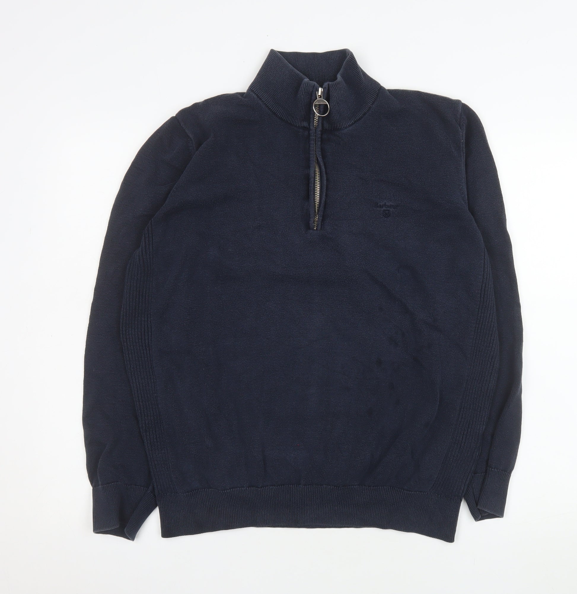 Step into refined comfort with this Barbour men’s navy blue half zip sweatshirt. Crafted from 100% breathable cotton, it offers the perfect balance between warmth and wearability, making it an excellent choice for layering throughout spring, autumn, and winter. The classic knit construction and comfortable high neck design embody Barbour’s heritage of British craftsmanship, providing both practicality and timeless appeal. Designed in a regular fit, this sweatshirt ensures a relaxed yet polished silhouette suitable for a wide range of occasions — from country walks to casual evenings out. The half zip detail with a metal ring pull adds a fashionable yet understated accent, while the ribbed cuffs and hem guarantee a neat, secure fit that maintains shape wear after wear. Subtle Barbour logo embroidery at the chest adds a touch of brand authenticity without overshadowing the minimalist aesthetic. Whether paired with jeans for a weekend look or chinos for a smarter outfit, this versatile piece effortlessly adapts to your style. Durable, easy to care for, and machine washable, it’s a wardrobe essential designed for long-term use. Ideal for men who appreciate quality knitwear with a traditional yet modern edge, this sweatshirt provides effortless sophistication with the comfort of premium cotton. A must-have for those who value both heritage and contemporary design, the Barbour half zip jumper captures the spirit of everyday refinement with understated charm. In excellent pre-owned condition with only light signs of wear, it remains a reliable and stylish choice for all seasons.