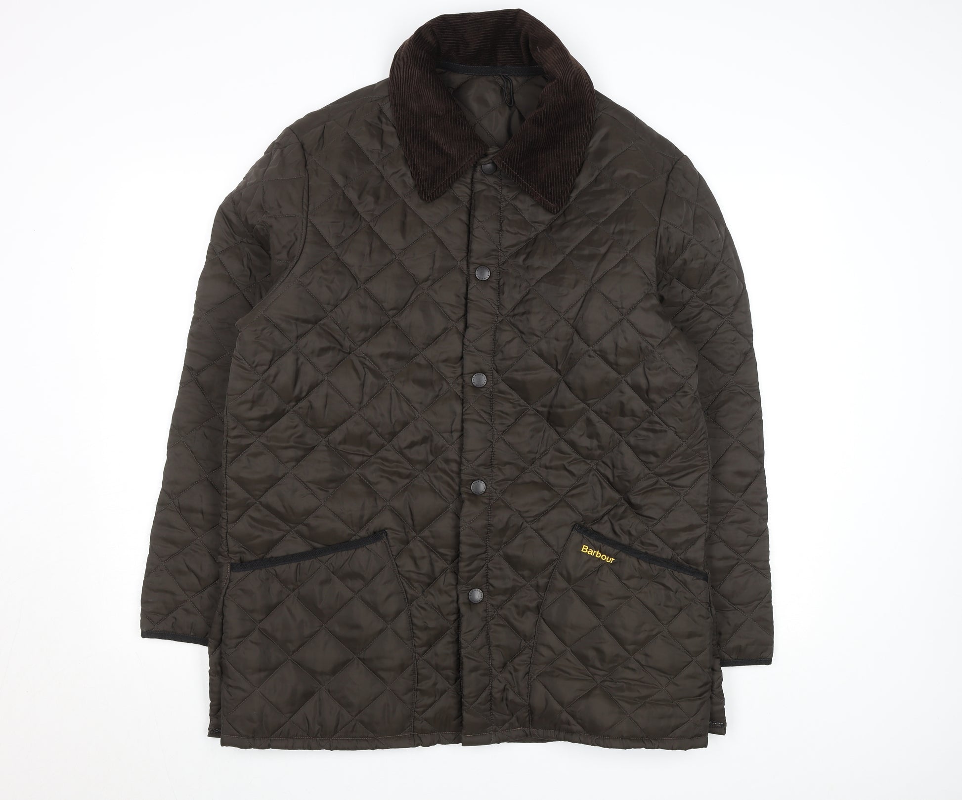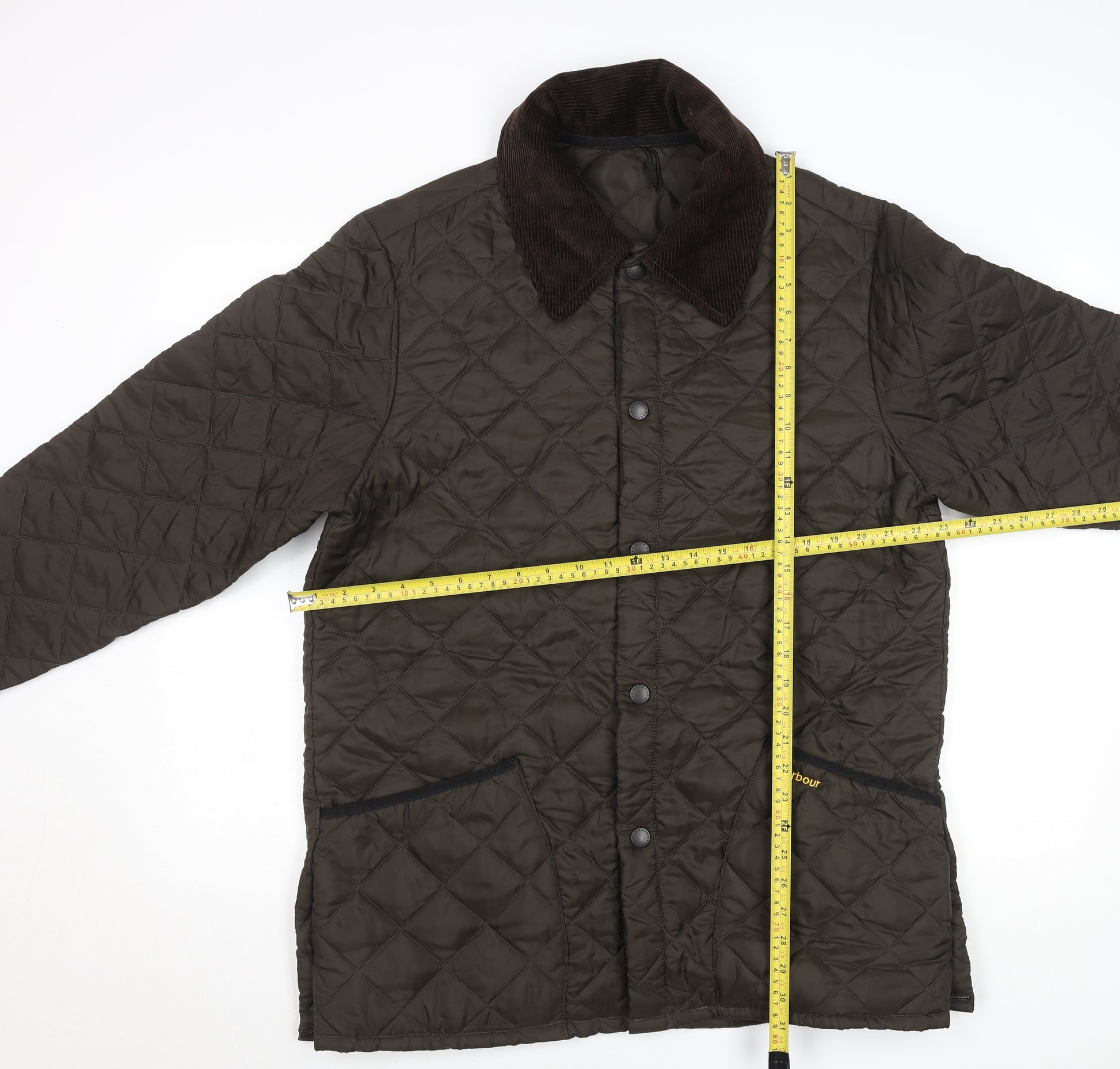 This Barbour men’s brown quilted jacket combines timeless British country style with reliable everyday performance. Crafted from a durable polyamide outer shell and lined with matching material for added comfort, it provides lightweight insulation that’s ideal for the colder months of autumn and winter. The design includes Barbour’s signature diamond quilting and contrast corduroy collar in deep brown for a heritage-inspired look. Featuring a snap fastening front, two spacious patch pockets with embroidered Barbour branding, and a comfortable mid-length cut, this jacket is both practical and stylish for daily wear. The regular fit allows for layering over knitwear or shirts, maintaining a relaxed yet structured silhouette. Designed for walking, outdoor pursuits, or casual travel, this coat offers an excellent balance between warmth and mobility. The smooth finish and classic detailing make it equally at home in both rural and urban settings. Crafted with attention to quality and longevity, this Barbour jacket shows light overall wear but remains in very good condition, clean and ready to wear. Ideal for those who appreciate traditional style and functionality, it’s the perfect outerwear piece for country walks, commuting, or weekend outings. This garment embodies Barbour’s trusted craftsmanship with durable stitching, branded detail, and weather-resistant quilting. A fine example of enduring British design, it makes a smart and practical addition to any man’s wardrobe. Don’t miss the chance to own this essential outerwear classic, blending comfort, versatility, and authenticity in one all-season garment that reflects understated sophistication and longevity.