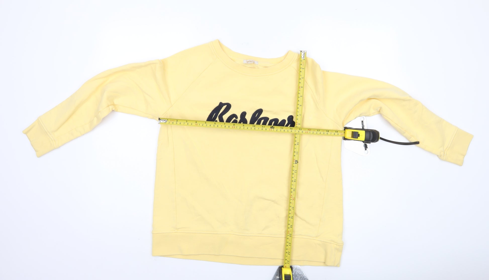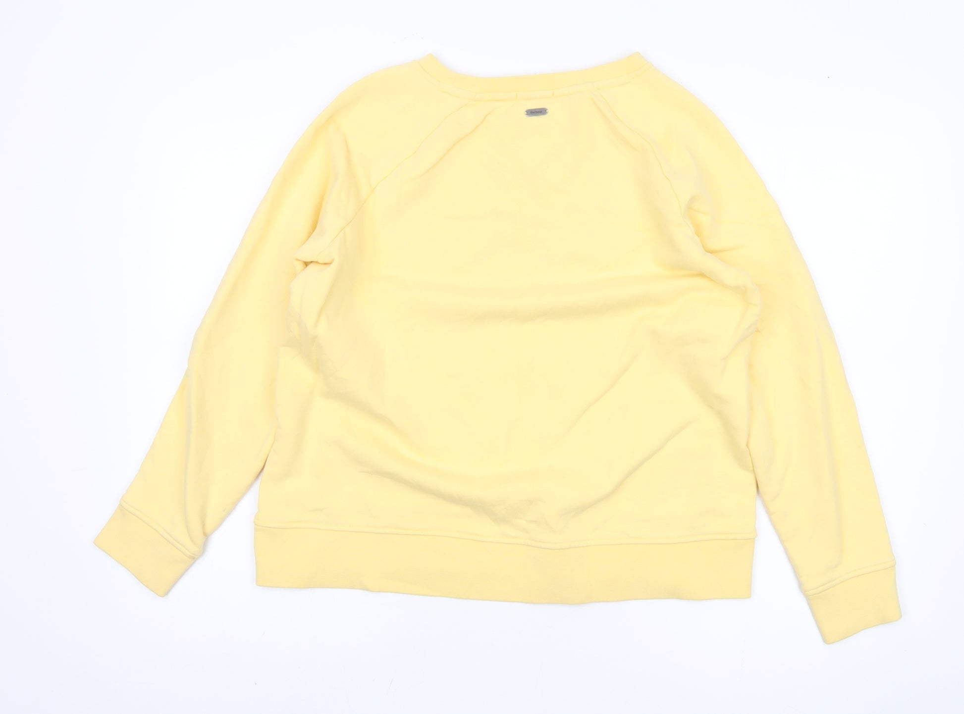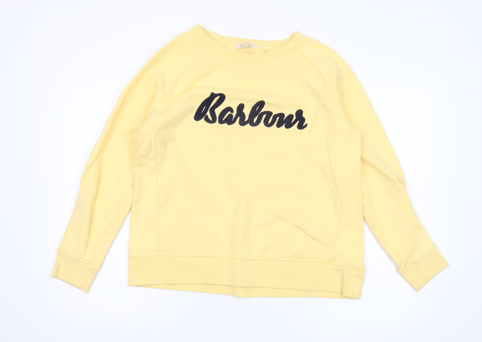 Elevate your casual wardrobe with this Barbour Women's Sweatshirt in a charming yellow hue. Designed with a classic round neck and raglan long sleeves, this sweatshirt embodies effortless style and comfort, perfect for cozy autumn and spring days. Crafted from 100% cotton, it offers a soft touch against your skin, ensuring all-day comfort. The Barbour logo accent adds a touch of elegance to this simple yet stylish piece. This regular fit sweatshirt is versatile, making it suitable for casual outings or a relaxed day at home. Pair it with your favourite jeans or casual trousers for a chic, laid-back look. Despite slight wear, it remains in excellent condition, ready to be a staple in your wardrobe. Don't miss out on this opportunity to own a piece of Barbour's iconic fashion heritage.