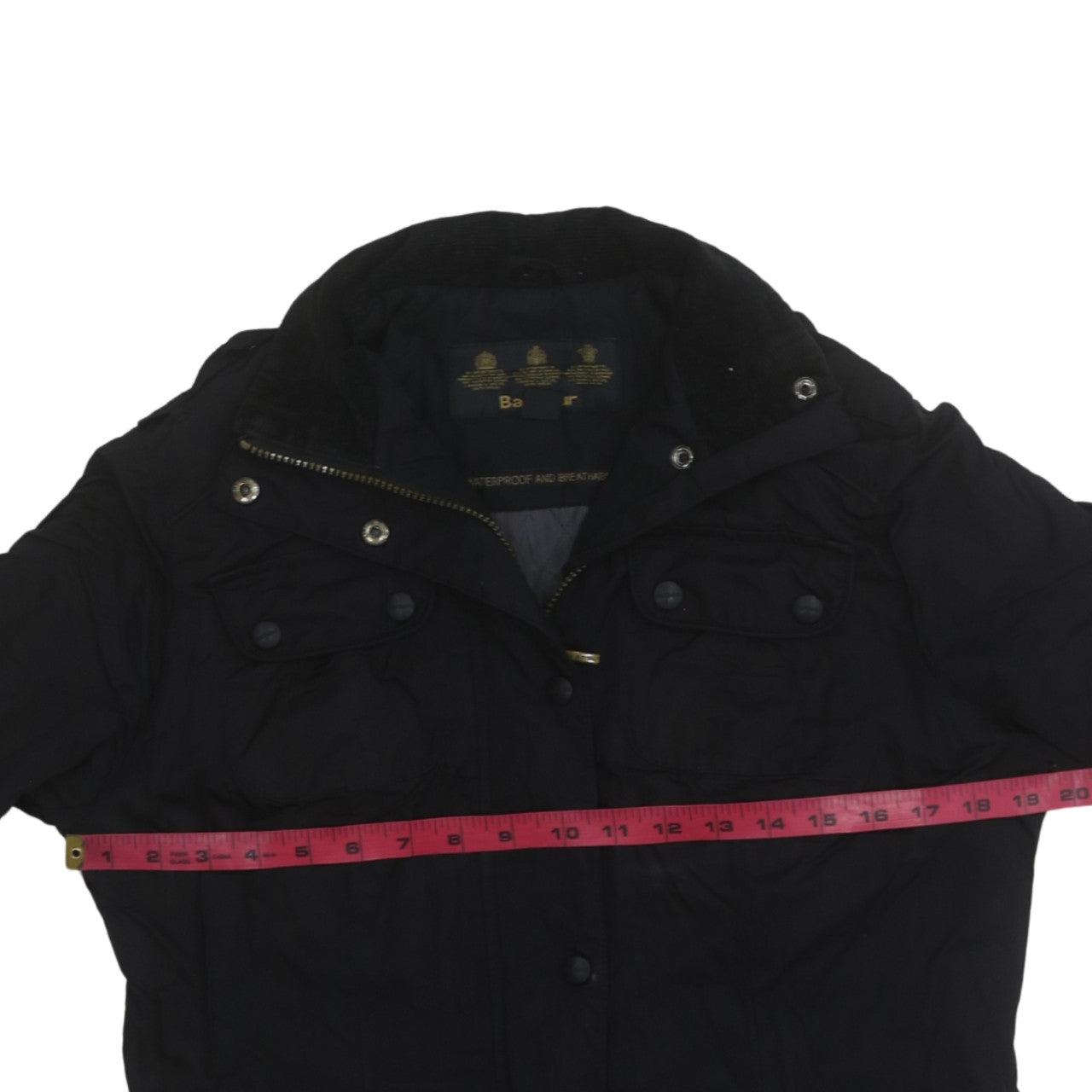 Stay stylish and protected from the elements with this Barbour Women's Waterproof Parka Coat in classic black. Crafted from durable polyester, this coat combines functionality and timeless British design for everyday wear. Designed for the modern woman, it features a long cut for extra coverage and warmth, making it ideal for both countryside walks and city commutes. The fully lined interior with quilted polyester provides additional comfort and insulation, keeping you snug on chilly autumn and winter days. The Barbour craftsmanship ensures a highly waterproof and breathable finish, giving reliable protection against rain while allowing airflow for all-day comfort. The coat includes a detachable hood for versatility, a secure zip and button fastening front, and multiple functional pockets — perfect for carrying your essentials while maintaining a sleek silhouette. Classic Barbour detailing like the logo embroidery, metal hardware, and structured seams add to its refined appeal. Finished with a traditional twill-like texture and a tailored regular fit, this coat balances practicality with understated elegance. Ideal for casual, travel, or workwear occasions, it pairs effortlessly with jeans and boots for a polished off-duty look. In excellent used condition, showing minimal signs of wear and meticulously maintained, this coat is ready to become a wardrobe staple for many seasons to come. Embrace Barbour’s heritage and functional elegance in this contemporary waterproof essential that blends style, durability, and comfort for everyday adventures.