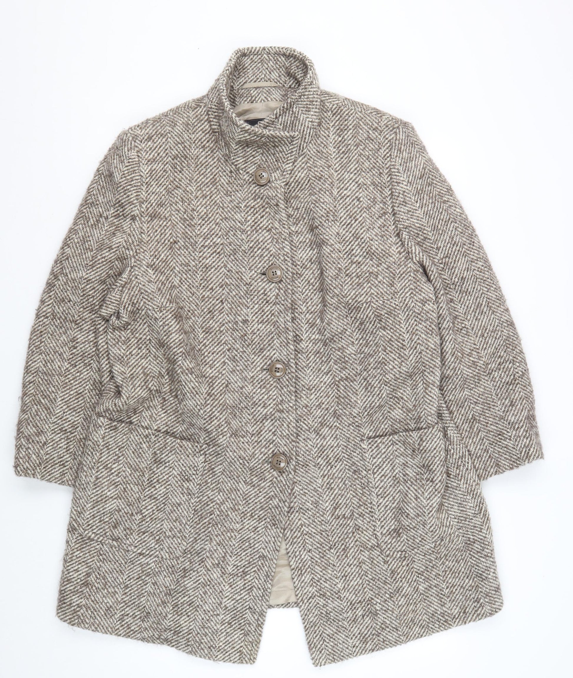 Elevate your autumn and winter wardrobe with this stylish Basler coat in a timeless brown herringbone pattern. Crafted from a luxurious blend of wool and polyester, this coat offers warmth and sophistication, perfect for formal occasions or adding a touch of elegance to your everyday ensemble. With a regular fit and mid-length cut, it's designed for comfort and style, featuring a classic button closure and long sleeves. The coat's tweed fabric and distinctive pattern make it a standout piece, while the viscose and polyester lining ensures a smooth and comfortable wear. In excellent condition, with no visible wear or damage, this coat is an essential addition to any fashion-forward woman's collection. Make a chic statement this season with Basler.
