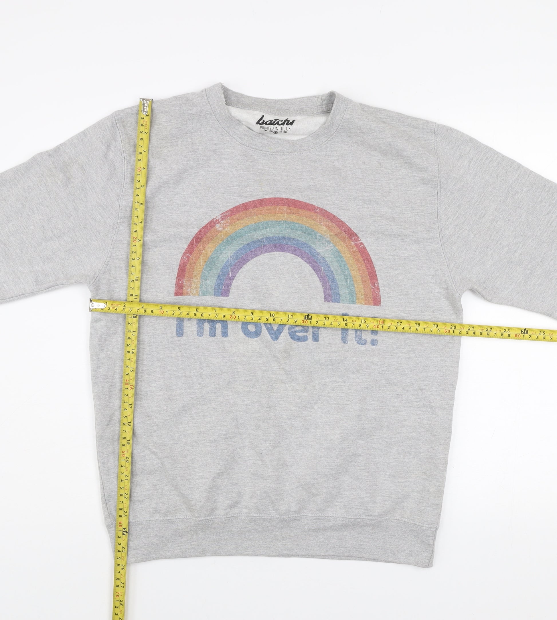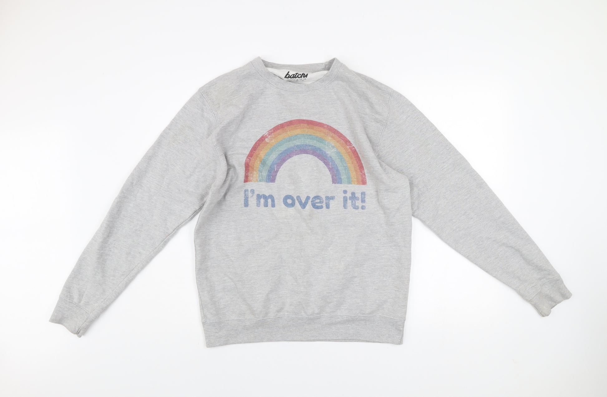 Add a splash of positivity and humour to your casual wardrobe with this Batch1 men’s grey sweatshirt. Crafted from a soft and cosy cotton blend, this pullover has a comfortable fleece interior that keeps you warm while offering breathability for everyday wear. The sweatshirt features a fun 'I'm over it!' rainbow graphic printed across the chest, expressing an easy-going, humorous personality. Its classic crew neck and regular fit make it a versatile choice for layering or wearing on its own. The long sleeves and ribbed cuffs provide a snug, secure finish, and the neutral grey shade pairs effortlessly with jeans, joggers, or shorts for relaxed styling. Made from 80% cotton and 20% polyester, it balances durability and softness, ensuring long-lasting comfort through seasons of wear. Perfect for autumn, spring, and winter, this sweatshirt is easy to care for with simple machine washing. While pre-loved, it remains in very good condition with only one faint mark on the shoulder and no significant wear or damage. Designed for men but suited to unisex styles, this piece embodies casual comfort and playful charm. Whether you’re heading out for a casual meetup, lounging at home, or layering for a relaxed street look, this Batch1 sweatshirt infuses cheer into your outfit. Capture effortless style, comfort, and a dash of humour in one go with this unique piece, printed proudly in the UK and thoughtfully designed for comfort and individuality.