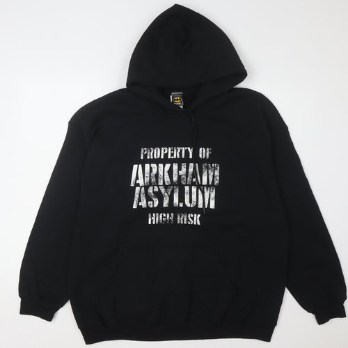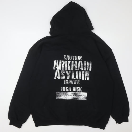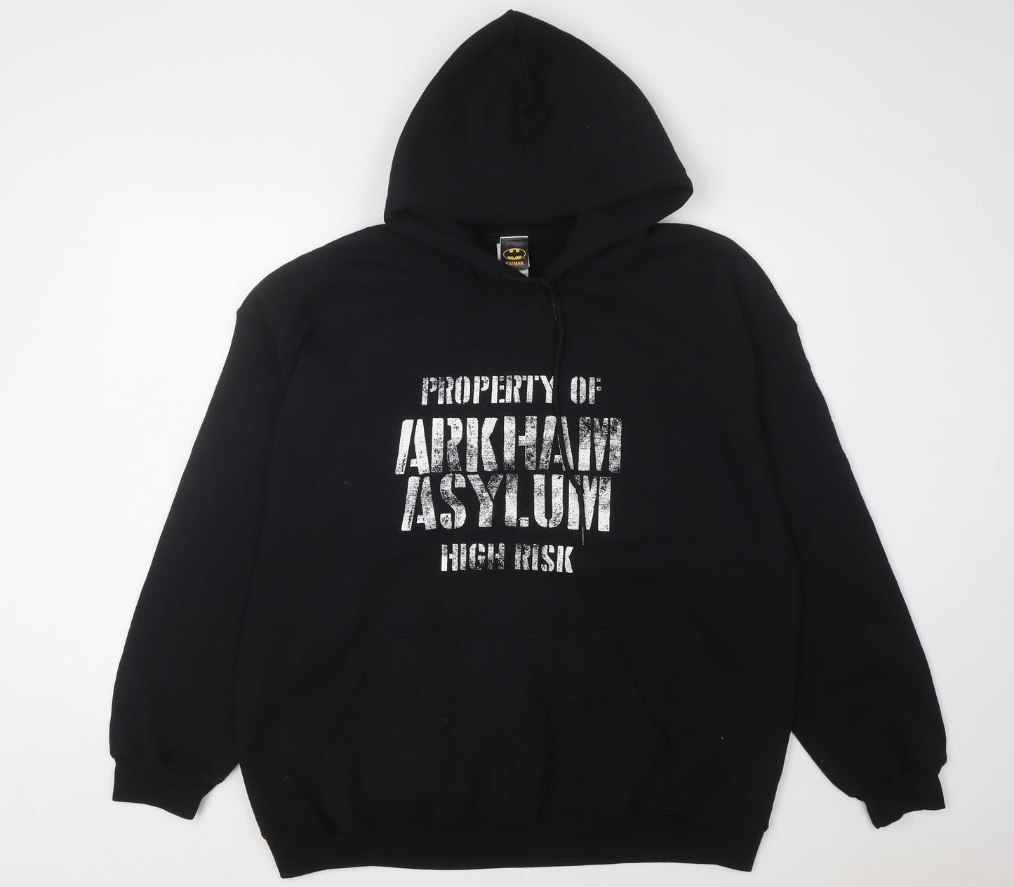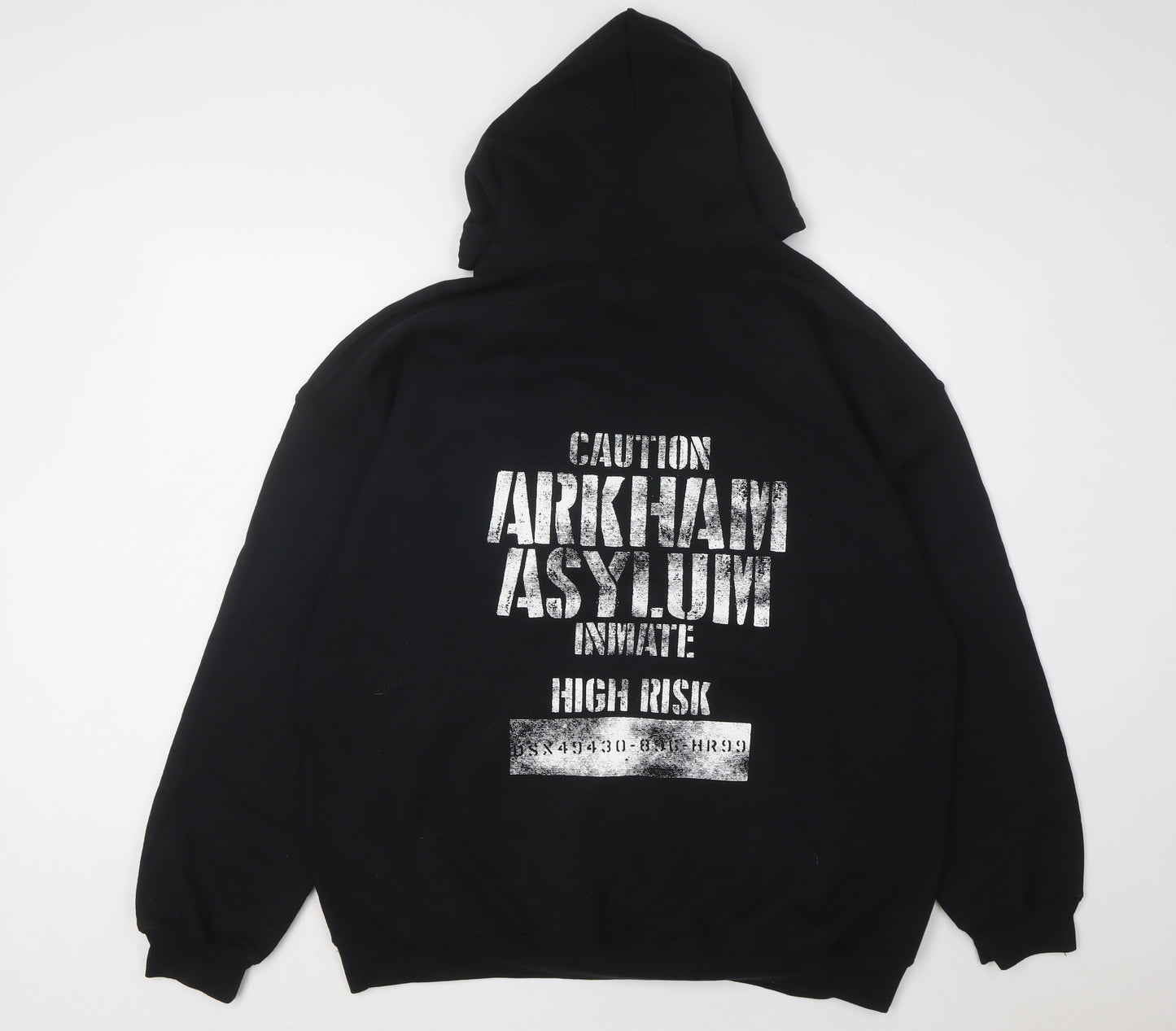 Embrace your inner superhero with this Batman 'Arkham Asylum' hoodie. Crafted for the true fan, this pullover hoodie combines comfort with iconic design. Made from a soft fleece blend, this black hoodie features a bold graphic logo of the infamous Arkham Asylum on both the front and back. Designed for men, its XL size offers a regular fit, ensuring ample room for layering in cooler seasons like autumn and winter. The hoodie comes with a hooded style featuring drawstrings for adjustable comfort and long sleeves to keep you warm. Whether you're lounging at home or out with friends, this hoodie makes a statement. A perfect tribute to the comics you love, bring a piece of Gotham City into your wardrobe today!