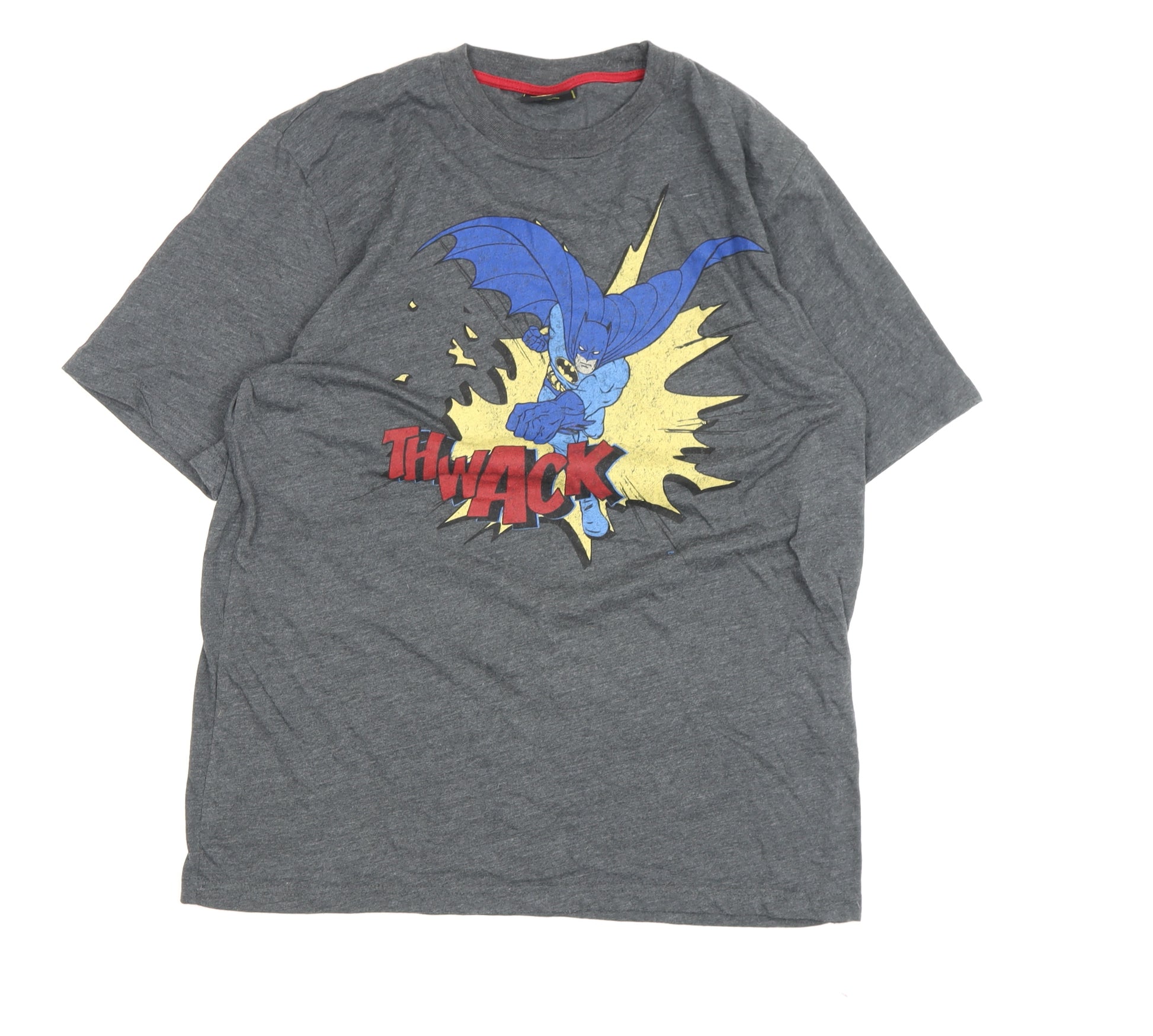 Embrace your love for superheroes with this striking men's Batman T-shirt. Crafted from a comfortable blend of cotton and polyester, this grey graphic print tee features the iconic Batman in action, making it a must-have for any DC Universe fan. The short sleeves and crew neckline provide a classic look, ideal for casual outings or relaxing at home. With its regular fit and jersey fabric, you'll enjoy both style and comfort. Highlighting Batman's signature logo, this T-shirt is perfect for showcasing your fandom. Machine washable for easy care, it's a practical and stylish addition to any wardrobe. In excellent condition with no tags, this tee presents some light wear indicative of gentle use. Add a touch of superhero flair to your everyday attire and enjoy the compliments that come your way. Whether you're a seasoned collector or simply want to infuse your style with a bit of comic flair, this Batman T-shirt is just what you need.