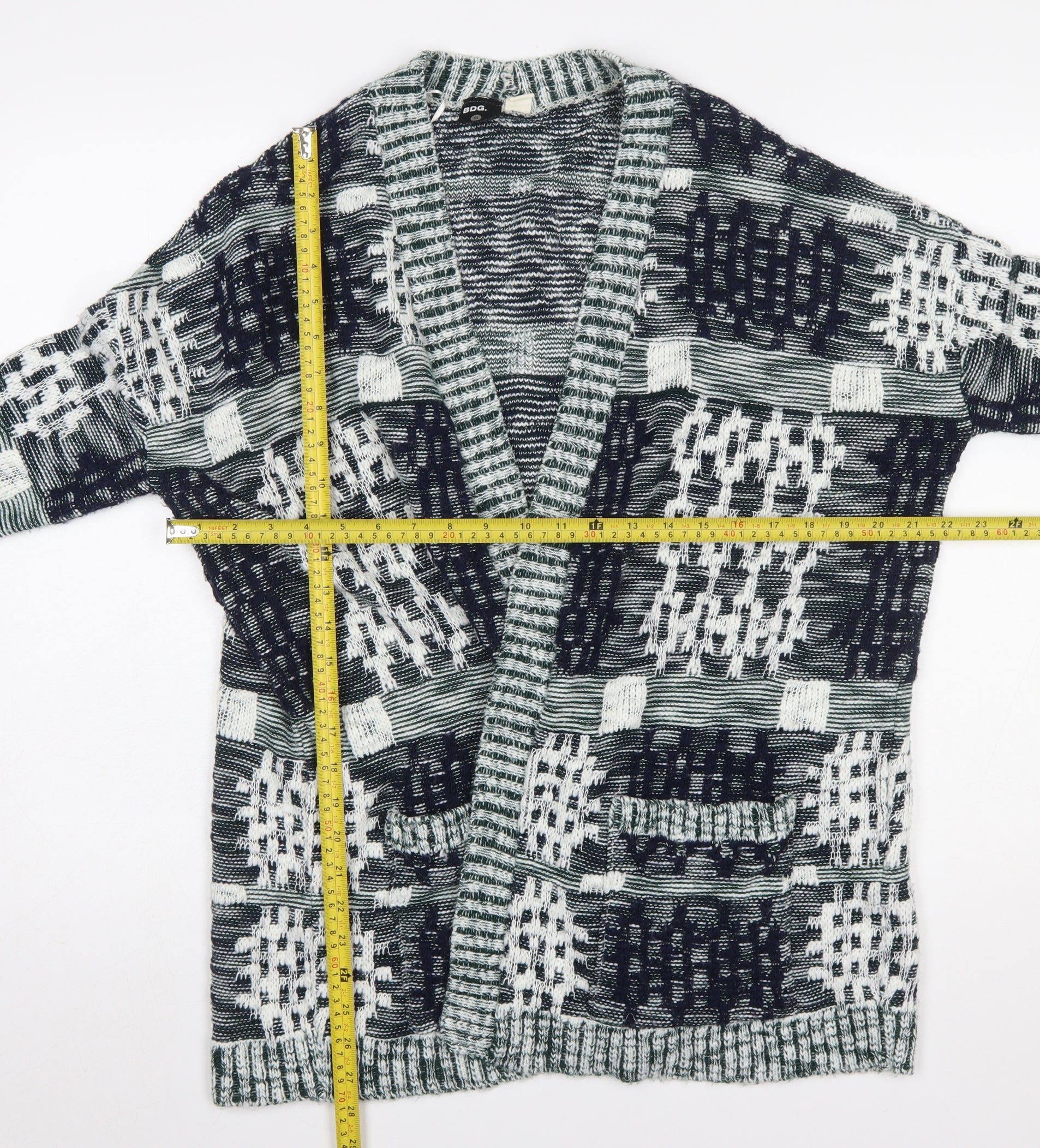 This BDG women's multicoloured knit cardigan is the perfect blend of comfort, warmth, and casual style. Designed with a relaxed, open front and crafted entirely from soft acrylic fibres, this stylish cardigan provides lightweight comfort that’s ideal for layering during the cooler months. The geometric knit pattern in shades of black, white, and grey gives it a distinctive, modern feel, while the ribbed cuffs and hem add a neat, cosy finish. Featuring two front pockets, this piece is both practical and fashionable, perfect for everyday wear. The chunky-knit texture gives the garment a premium look, while the machine washable acrylic construction ensures easy maintenance. With a flattering V-neck and relaxed fit design, it suits a variety of looks from laid-back weekends to smart-casual office wear. Perfect for autumn and winter, it pairs effortlessly with jeans, leggings, or dresses. The BDG women's cardigan combines softness, durability, and timeless appeal—ideal for anyone seeking versatile outerwear that never goes out of style. Lightly worn with no visible damage, this garment remains in excellent condition, offering plenty of wear ahead. Ideal for adding a touch of texture and pattern to your wardrobe, it’s a statement piece that brings comfort and quality together in one effortlessly stylish design.