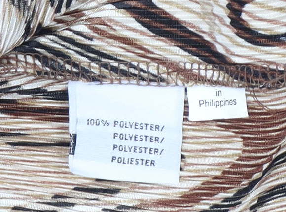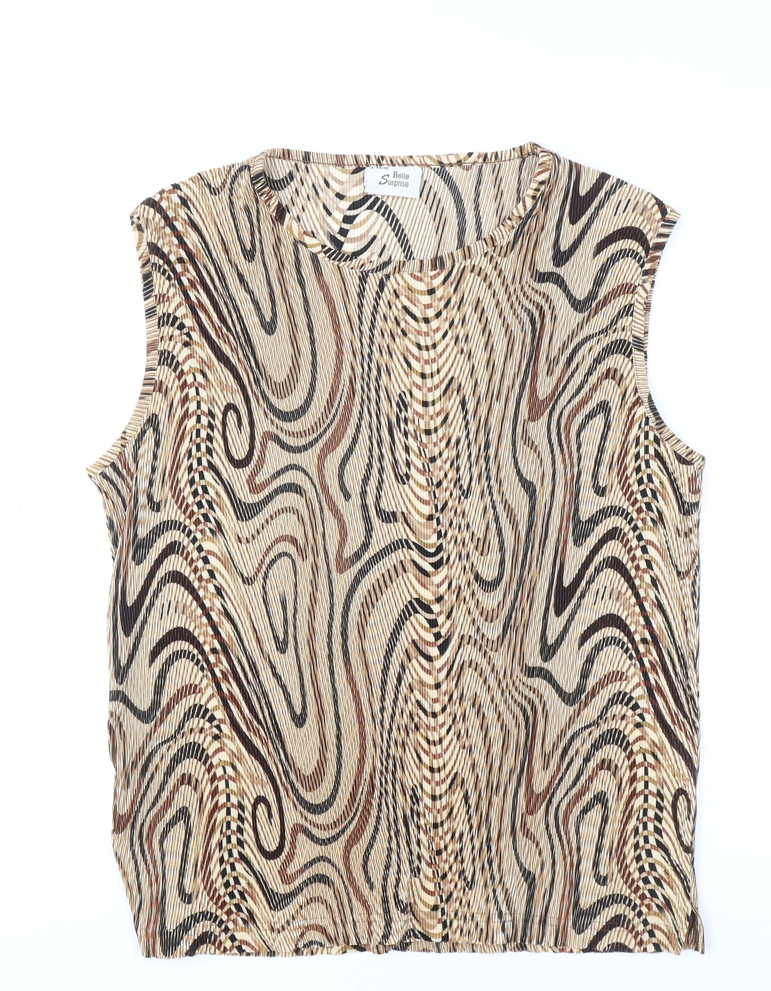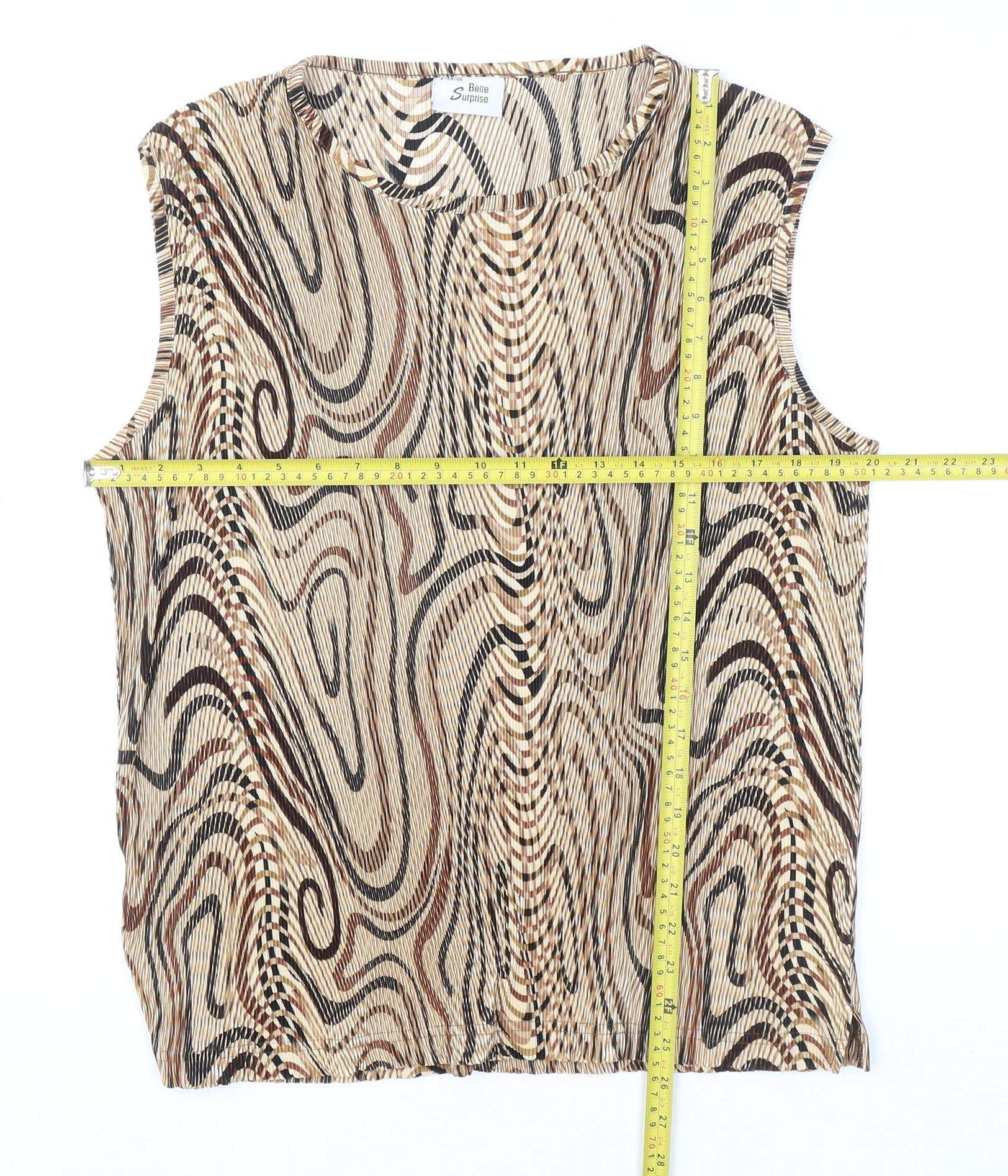 Elevate your everyday wardrobe with this elegant Belle Surprise women’s sleeveless blouse in a distinctive geometric pattern. The beautiful blend of beige, brown, and black tones creates a flowing, modern design that adds sophistication and a touch of artistic flair to any outfit. Crafted from 100% polyester, the fabric is lightweight, soft, and comfortable, ensuring an effortlessly flattering fit that drapes beautifully on the body. The sleeveless cut and crew neckline make it ideal for warmer days or layering under a smart jacket for transitional seasons. Its regular fit offers ease of movement while maintaining shape and structure, perfect for both casual and smart-casual wear. The pullover style allows for simple, fuss-free dressing, and its woven polyester texture gives it a silky, refined finish. Pair it with tailored trousers for a polished office look, or style it with jeans and flats for relaxed weekend wear. This blouse is machine washable, making it easy to care for, while the abstract geometric design ensures you stand out with minimal effort. Suitable for summer and layered looks alike, it channels a timeless yet contemporary appeal. In excellent pre-owned condition with no defects or flaws visible, this Belle Surprise blouse represents both durability and effortless style. A versatile must-have piece for any woman seeking comfort without compromising on fashion-forward charm, this top provides a perfect balance between subtle elegance and eye-catching detail. Add this distinctive piece to your wardrobe today and enjoy endless styling possibilities that transition seamlessly from day to night and work to weekend.
