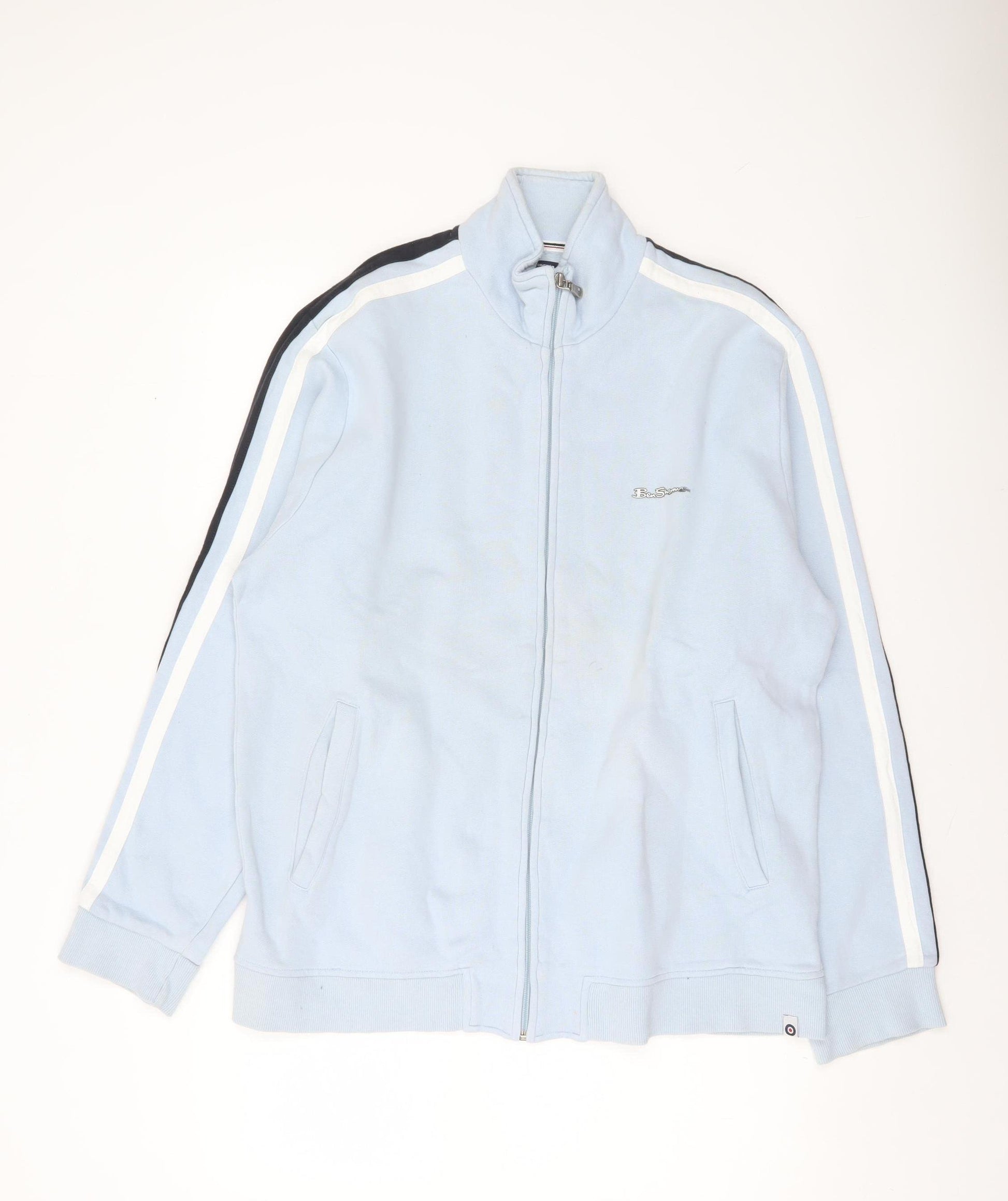 This Ben Sherman men’s light blue track jacket combines timeless retro appeal with everyday comfort. Crafted from a soft blend of 80% cotton and 20% polyester, it offers a lightweight and breathable feel suitable for layering during spring or autumn. The jacket features a full zip fastening, ribbed cuffs and hem for a secure fit, and practical front pockets ideal for keeping hands warm or holding small essentials. The design is sleek and classic, highlighted by bold contrast stripes running along the sleeves in white and navy, paired with an embroidered Ben Sherman logo on the chest for subtle branding. The stand-up collar adds a sporty touch, while the soft fleece fabric type ensures warmth without weight. The jacket’s mid-length cut and regular fit make it versatile for casual wear, travel, or light outdoor activity. Finished in a refreshing blue hue that complements most wardrobe staples, this piece embodies relaxed style with quality construction typical of Ben Sherman garments. Ideal for men seeking a fashionable yet comfortable jacket for everyday use, this easy-care piece is machine washable. Though lightly worn, it remains in very good condition with only faint signs of previous use. Whether paired with jeans for a laid-back look or joggers for a sportier outfit, it’s the perfect addition to your casual rotation. The blend of soft cotton comfort and durable polyester provides both practicality and lasting wear. Classic British style meets relaxed streetwear chic in this dependable, retro-inspired piece by Ben Sherman – a must-have for any fan of understated fashion and classic menswear icons.