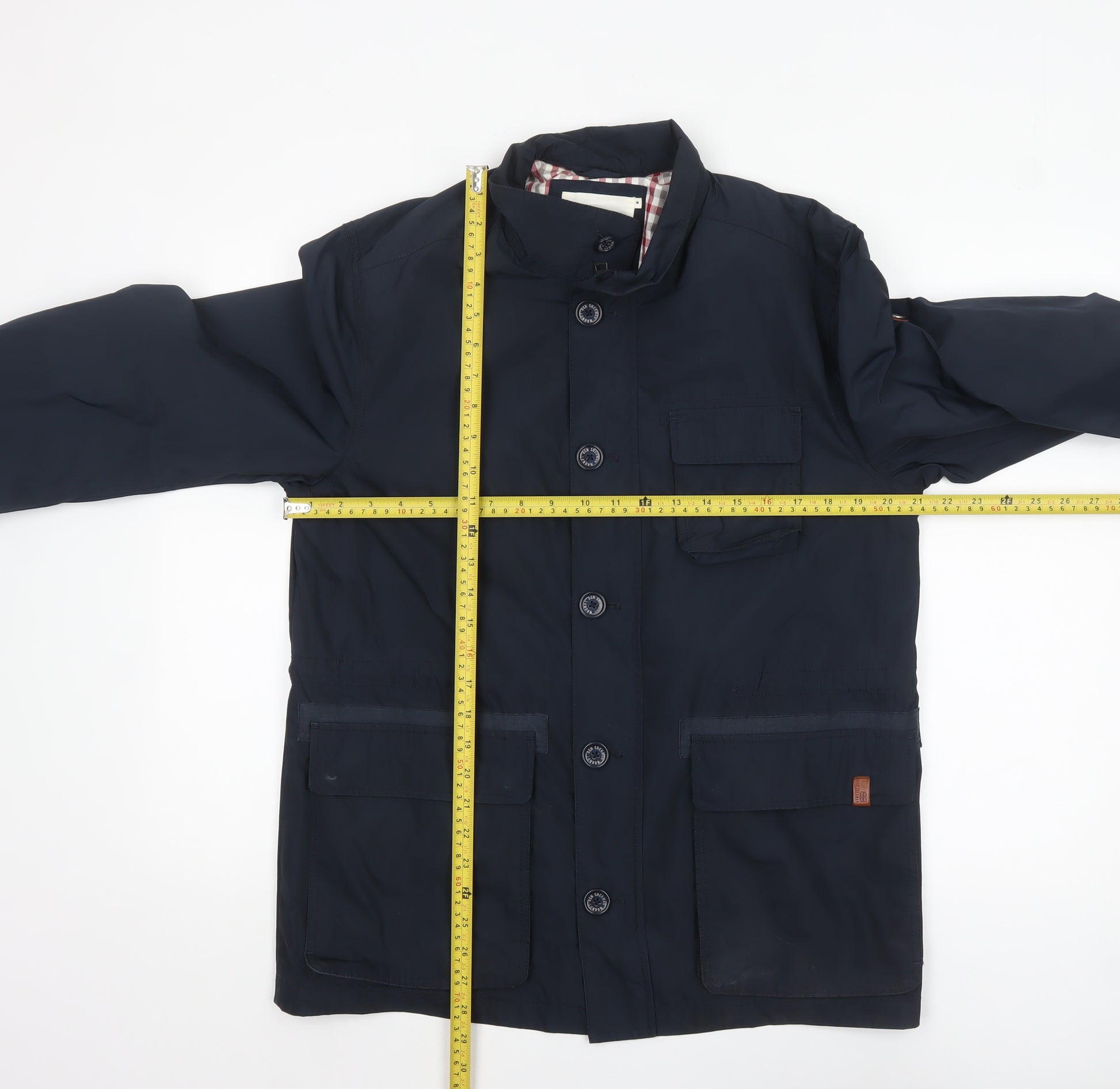 Step out in iconic British style with this Ben Sherman men’s mid-length jacket in classic navy blue. Crafted from durable polyester, this piece combines utility and everyday refinement for a versatile outerwear essential. The jacket features a practical button fastening front with multiple external pockets, adding both function and understated charm. Its softshell construction provides lightweight protection against mild weather, making it ideal for the changeable British climate in spring or autumn. The interior is fully lined in polyester, showcasing the brand’s signature red and grey check pattern, a touch of distinctive Ben Sherman flair. Designed in a regular fit, this jacket offers everyday comfort and layering ease, perfect for commuting, casual weekends, or smart-casual gatherings. The stand-up collar adds a refined edge, whilst the classic Ben Sherman logo detail enhances its authenticity. Machine washable for simple care, it’s a reliable go-to piece that balances practicality and timeless appeal. With minimal signs of previous use and no visible defects, this jacket remains in excellent condition, reflecting its quality construction. Whether teamed with chinos, denim, or tailored trousers, this navy jacket delivers effortless sophistication with versatile styling potential. Ideal for men who appreciate modern British design and comfort-driven craftsmanship. A wardrobe staple for those seeking style, functionality, and enduring wearability.