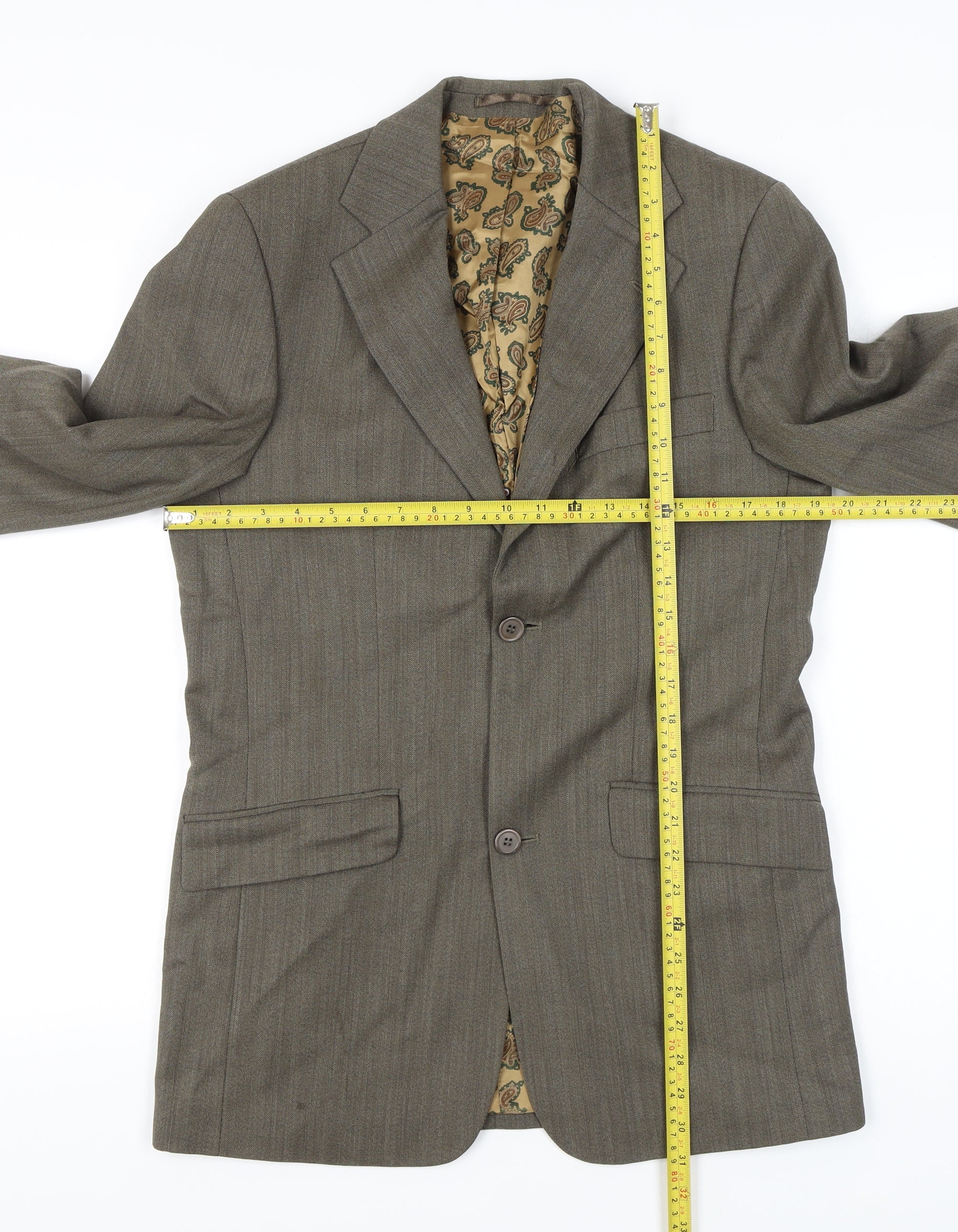 Elevate your smart wardrobe with this impeccably tailored Ben Sherman men's blazer in a versatile brown shade. Designed from a quality wool blend, this single-breasted jacket showcases a timeless two-button front and classic notch lapels for an understated yet refined look. The subtle brown tone pairs effortlessly with formal trousers or dark denim, making it suitable for business meetings, weddings, or smart evening occasions. Inside, the blazer is fully lined with a distinctive patterned polyester lining, adding a pop of British flair characteristic of Ben Sherman’s heritage style. With a regular fit that strikes the perfect balance between comfort and structure, it offers clean lines and a flattering silhouette ideal for any body shape. Practicality hasn’t been overlooked either, featuring inner pockets for safe storage of small essentials along with three-button cuffs for a sharp finish. Crafted primarily from 70% wool and 30% polyester, this blazer guarantees both warmth and durability, ideal for cooler autumn and winter seasons. The texture has a subtle tweed-like finish that complements its gently tailored cut, exuding classic sophistication. The single back vent ensures ease of movement and a comfortable wear whether you're sitting at your desk or on the move. In excellent overall condition with light creasing from storage, it presents beautifully and remains ready to wear immediately. Perfect for those who appreciate traditional British tailoring with a modern edge, this Ben Sherman blazer embodies understated class and versatility. Pair it with a crisp shirt and chinos for smart-casual outings or dress trousers and a tie for more formal occasions. Priced competitively, this jacket is an ideal investment for building a well-rounded wardrobe that never goes out of style.