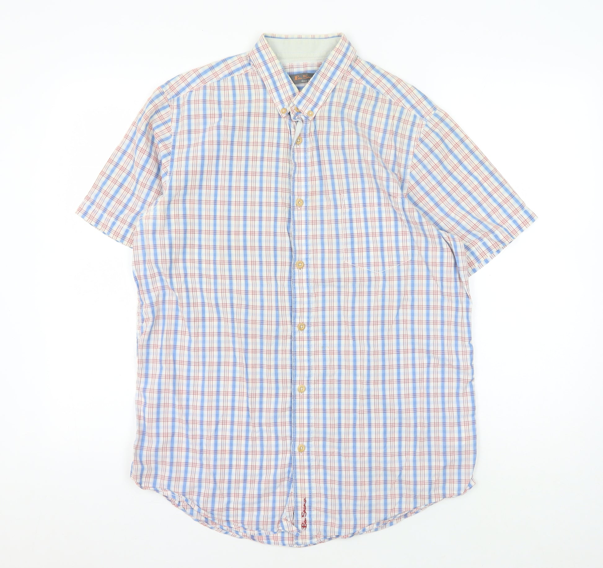 This Ben Sherman men's short sleeve shirt embodies classic style with its vibrant multicoloured plaid pattern, perfect for casual outings or adding a splash of colour to any ensemble. Crafted from 100% cotton, the shirt ensures a soft, comfortable fit that remains breathable through any season. The button-up design, complemented by a traditional button-down collar, offers a timeless aesthetic that makes it ideal for both casual and semi-formal occasions. Despite minor stains on the front, which are hardly noticeable when styled, this shirt remains a practical choice for everyday wear. Suitable for machine washing, maintenance is a breeze. Elevate your wardrobe with this quintessential Ben Sherman piece, expertly bridging comfort with style.
