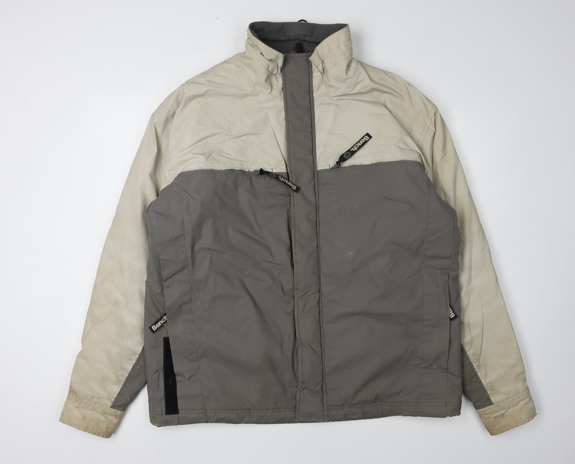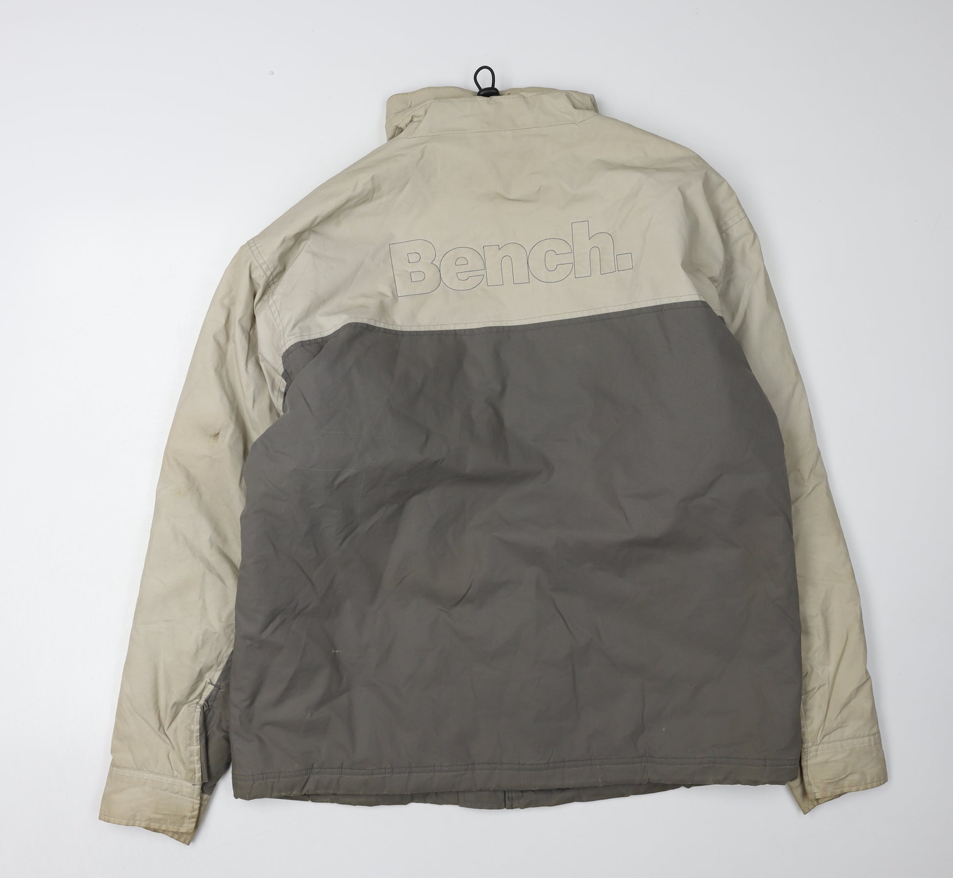 Step out in style with this Bench Men's Parka Jacket, perfect for keeping you comfortable and trendy in casual settings. Tailored in a regular fit for a relaxed feel, this jacket comes in a modish beige hue that complements virtually any outfit. Made from a high-quality blend of 65% polyester and 35% cotton, it offers durability and comfort. The jacket includes convenient zipped pockets for securing small essentials and features a prominent Bench logo accentuating its stylish look. Despite minor imperfections like slight stains and a small tear, it maintains its appeal and usability. Lined with cosy nylon, this jacket ensures warmth and comfort, making it an ideal choice for chilly days. The robust zipper closure adds a layer of protection against cold winds, making it a reliable companion for your urban adventures. Easy to care for, it's machine washable, allowing for effortless maintenance. A perfect pick for everyday wear, this mid-length parka reflects both practicality and style, rendering it a staple in any wardrobe looking for a touch of laid-back sophistication.