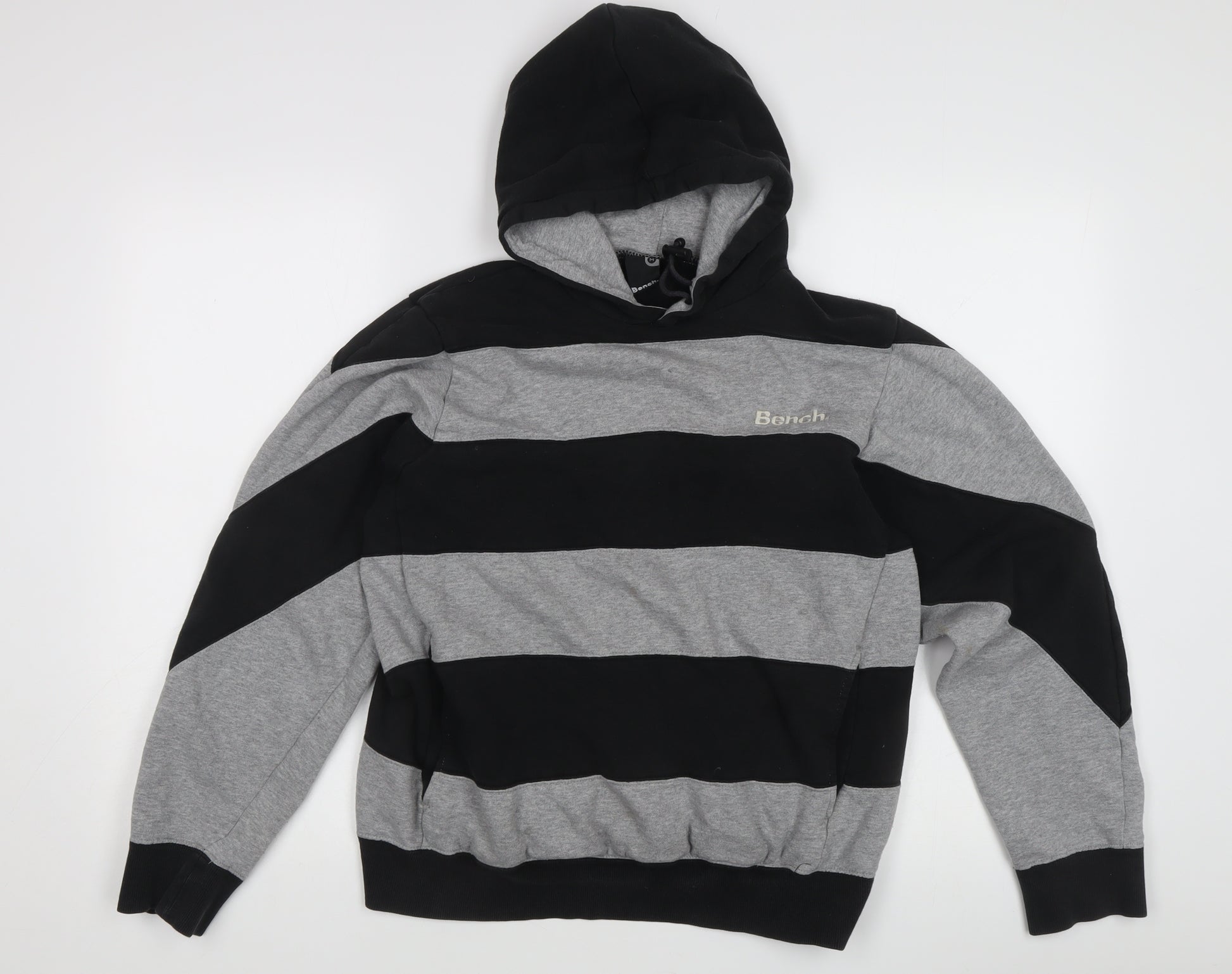 Elevate your casual wardrobe with this stylish Bench Men's Hoodie, perfectly blending comfort and fashion. Crafted with a neat blend of cotton and polyester, this hoodie offers durability and breathability, ensuring you stay comfortable throughout the day. Ideal for the contemporary man, its regular fit and long sleeves make it a reliable choice for both autumn and winter seasons.The design features an eye-catching black and grey striped pattern, amplifying its aesthetic appeal. A logo accent adds a subtle branded touch, boosting its stylish allure. This pullover hoodie includes a drawstring closure, allowing for easy adjustments and added convenience. The hooded design and graphic print detail combine functionality with flair, keeping you warm and trendy during those colder months.Despite being preloved, this hoodie remains in good overall condition, with only a minor stain noted, making it a special find for any fashion-savvy individual looking for quality and style at an accessible price. It's machine washable, promising easy care, and maintenance.Don't miss out on this versatile Bench hoodie that effortlessly complements various casual outfits, ensuring you stay chic and cosy throughout your day. Whether you're heading out for a casual meet-up or lounging at home, this hoodie is your go-to piece for understated elegance and practical comfort.