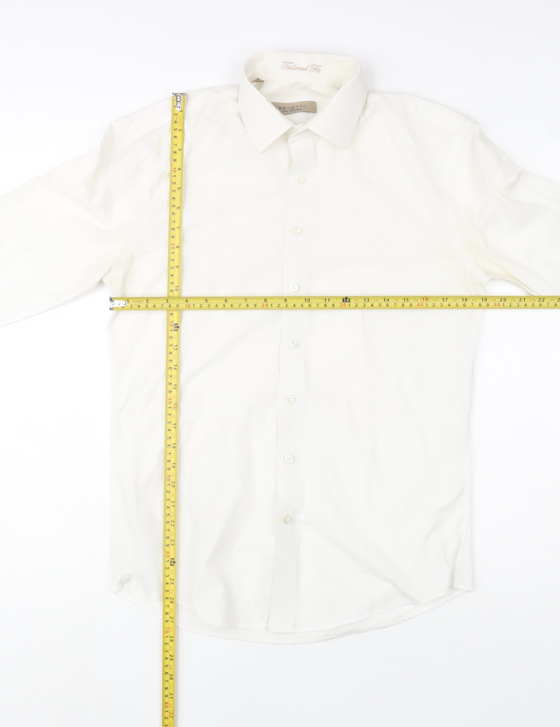 Enhance your wardrobe with this timeless Benetti men’s formal dress shirt, designed with a refined tailored fit that offers modern sophistication and all-day comfort. Crafted from a practical 65% polyester and 35% cotton blend, this shirt provides an ideal balance of softness and durability, ensuring a crisp, smooth appearance wear after wear. The lightweight, breathable touch of the fabric keeps you comfortable during long days at the office or stylish evenings out. Presented in a clean white shade, this shirt boasts a solid pattern that makes it incredibly versatile — perfect for pairing with tailored suits, smart trousers, or chinos. The design features a classic collared neckline, barrel cuffs, and a full button-down closure, maintaining the traditional elegance that complements both formal and semi-formal occasions. Details such as its neat pointed collar, fine stitching, and quality Benetti tailoring reflect premium craftsmanship synonymous with modern menswear refinement.This shirt’s slim fit silhouette flatters without compromising comfort, offering a sleek shape that works effortlessly under blazers and jackets. Ideal for weddings, business meetings, or evening functions, it delivers understated luxury with practicality due to its low-maintenance, machine-washable material and non-iron fabric qualities. Condition remains excellent with no visible marks or damage — only gentle creasing from storage. A versatile essential for the discerning gentleman, this Benetti dress shirt is a wardrobe cornerstone you can rely on for any event requiring polish and sophistication.Invest in sartorial excellence and elevate your formalwear collection with this Benetti tailored white dress shirt — where comfort, craftsmanship, and timeless style come together in one modern essential.