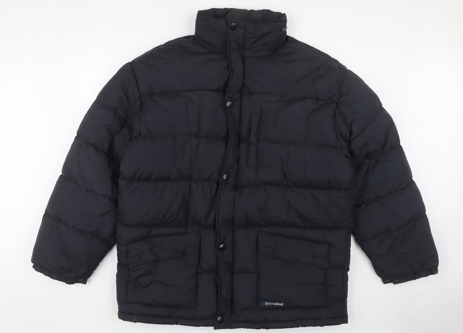 Stay warm and stylish with the Benzini Men's Puffer Jacket in sophisticated black. Designed for the colder months, this jacket features a padded design that offers both comfort and insulation, making it perfect for winter outings. The exterior is crafted from durable 100% nylon, ensuring longevity and resistance against the elements, while the inner lining is made from soft polyester for added warmth. Its regular fit provides a comfortable wearing experience, complemented by a mid-length cut that enhances movement while keeping you protected from the chill.The jacket's practical features include a convenient zip closure and secure zipped pockets, allowing you to carry essentials safely. The stand-up collar adds additional protection from windy conditions, making this jacket ideal for casual winter wear. Pair this versatile piece with your favourite jeans and boots for a fashionable winter look.This Benzini jacket is in excellent condition with no visible wear or damage, ensuring you can enjoy its practicality and style for seasons to come. Priced competitively, it offers great value, combining quality craftsmanship and functional design.