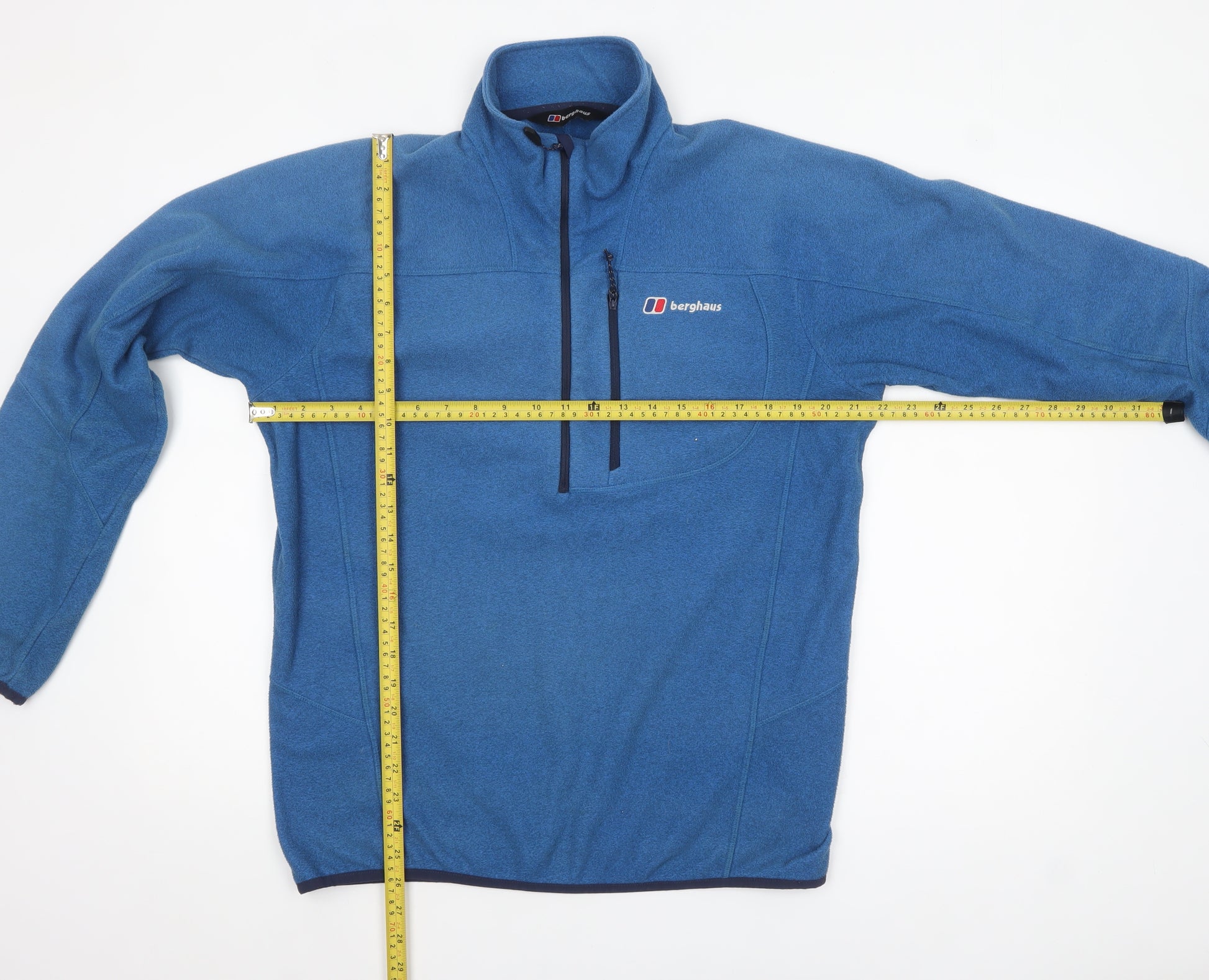 Stay comfortable and protected on outdoor adventures with this Berghaus men's blue fleece pullover sweatshirt. Designed for versatility and performance, it features a breathable, moisture-wicking fleece fabric that keeps you warm without bulk, making it perfect for layering in cool weather. The classic half-zip design ensures easy ventilation and quick temperature adjustment, while the high neckline provides extra coverage against wind and cold. The Berghaus logo accents the chest, adding a touch of trusted outdoor quality and style. This regular fit fleece is cut for comfort and movement, suitable for hiking, walking, running, and general outdoor wear. The lightweight construction allows for year-round use in autumn, winter, and spring conditions. Durable stitching and a soft, insulated texture ensure lasting comfort during every wear. The practical design includes an easy-access chest zip pocket for small essentials. Machine washable for easy care, it’s ideal for anyone who values function, comfort, and reliability. In excellent pre-owned condition with only light wear, this versatile blue fleece retains its shape and texture with no visible damage. Perfect for daily wear or outdoor adventures, this Berghaus fleece delivers the dependable warmth and quality synonymous with the brand—ideal for layering during cold-weather activities or casual use. Step into comfort and style with this essential Berghaus men's quarter zip pullover.