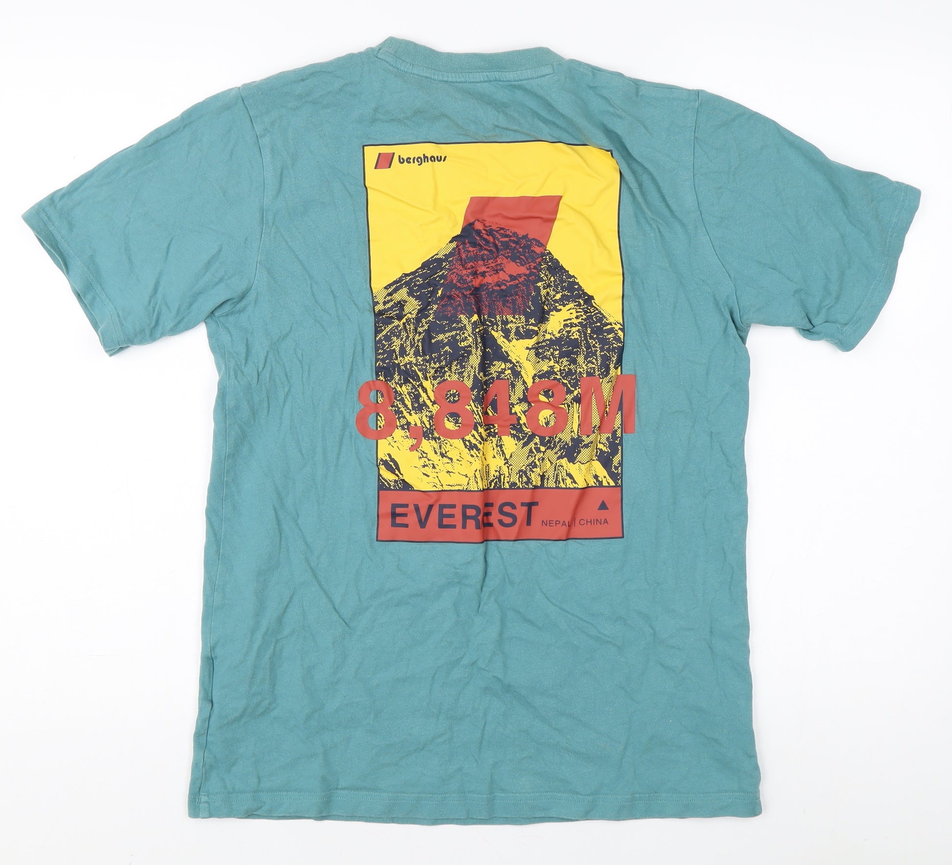 Discover the Berghaus Men's Blue T-Shirt, a perfect blend of comfort and style for outdoor enthusiasts. Crafted from a soft cotton blend with a touch of elastane, this medium-sized T-shirt offers a breathable, flexible fit. The crew neck and short sleeves provide classic style, while the graphic print of Mount Everest gives it an adventurous touch. Ideal for everyday wear or outdoor adventures, this versatile T-shirt features a subtle brand logo accent on the front, exuding a rugged yet sophisticated look. Easy to care for, machine washable, and suitable for all seasons, it's a staple piece for any wardrobe. Though no sales tags are attached, it remains in excellent condition with minimal wrinkles, ready to accompany you on your next journey.