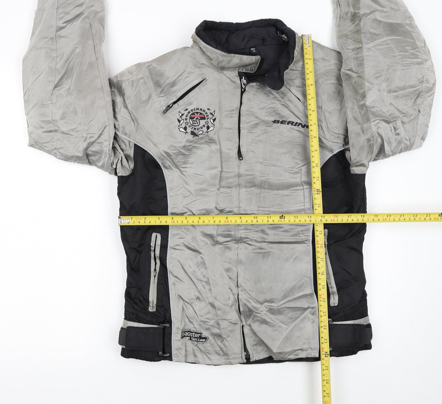 Stay protected and ride in style with this Bering men's motorcycle jacket in size L. Designed with practicality and comfort in mind, this grey and black biker jacket features a durable outer shell made from 63% nylon, 37% polyester with a 100% polyurethane coating, ensuring both windproof and waterproof performance. The jacket has a full zip closure with hook-and-loop fastening and a belted waist for a secure, adjustable fit. Practical zipped pockets on the front and sleeves make it easy to store essentials, while reflective detailing enhances visibility during night rides or low-light conditions. The interior is lined with a soft and breathable combination of nylon and polyester, adding extra warmth and comfort. Built for riding performance, this jacket features padded areas for added protection and durability, ideal for commuting or long-distance touring. Its stand-up collar shields the neck from wind chill, while the reinforced construction provides a protective barrier against weather and abrasion. The Bering and Roadster branding adds a distinctive premium biker aesthetic. Perfect for autumn, spring, and winter, this jacket combines functionality with sleek style. Its regular fit and mid-length design make it versatile enough for casual wear, travel, or workwear use when you’re off the bike too. The overall condition is very good, showing light marks and minor creasing from normal use but with plenty of life left. If you value protective riding gear that merges durability, comfort, and style, this Bering motorcycle jacket is ideal. Pair it with your riding trousers for a cohesive protective outfit or wear it casually with jeans for a rugged street look.