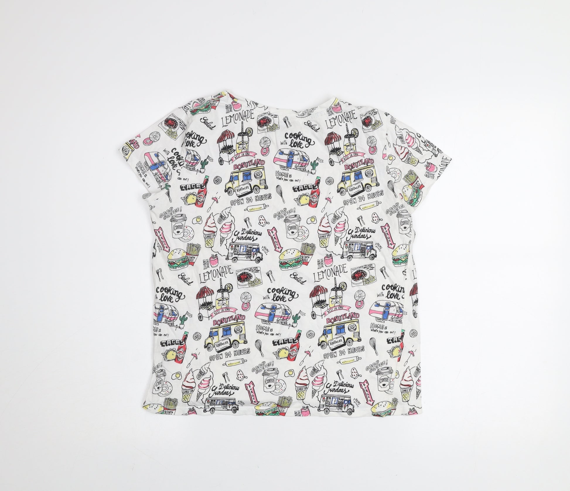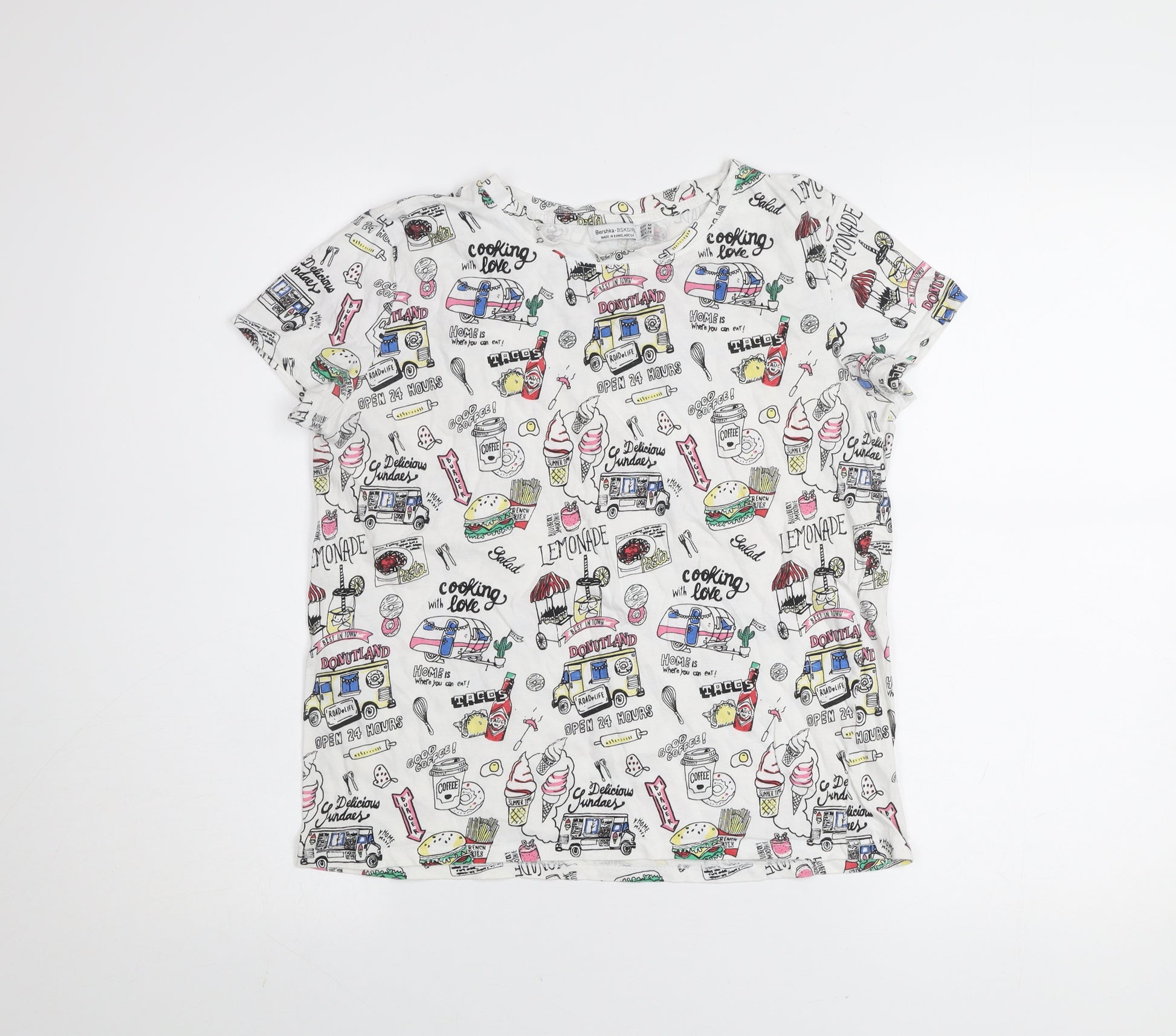 Brighten up any casual wardrobe with this colourful Bershka BSK Girl T-shirt, designed for stylish girls who love to express their fun personality through fashion. Crafted from 100% cotton, this lightweight and breathable tee ensures maximum comfort all day long, whether worn for school, outings with friends, or relaxed weekends. The soft jersey fabric feels gentle against the skin, making it perfect for warmer spring and summer days. Showcasing a lively multicoloured graphic print filled with playful doodles of donuts, ice creams, lemonade stands, and cheerful slogans, this T-shirt captures a sense of youthful energy and creativity. The crew neck design and regular fit provide well-balanced comfort and easy wear, combining both style and practicality. The short sleeves offer versatility, allowing it to be worn alone or layered under a jacket or hoodie for a stylish everyday look. The durable cotton construction provides both quality and breathability, ensuring it withstands everyday adventures while maintaining its bright, fun appearance wash after wash. Ideal for girls aged around 12 years, the Bershka BSK Girl T-shirt delivers a relaxed yet trendy look that's effortless to style with jeans, shorts, or skirts. Whether paired with trainers for a streetwear vibe or dressed up with accessories for a day out, it’s a wardrobe staple that adds charm to any outfit. A great choice for those who appreciate a mix of comfort, playful design, and durability. This preloved item remains in excellent condition with only minimal signs of wear and no visible defects. Perfect for anyone seeking a stylish, affordable, and sustainable addition to a young fashion lover’s wardrobe, this T-shirt balances modern street style with fun nostalgia and everyday practicality.