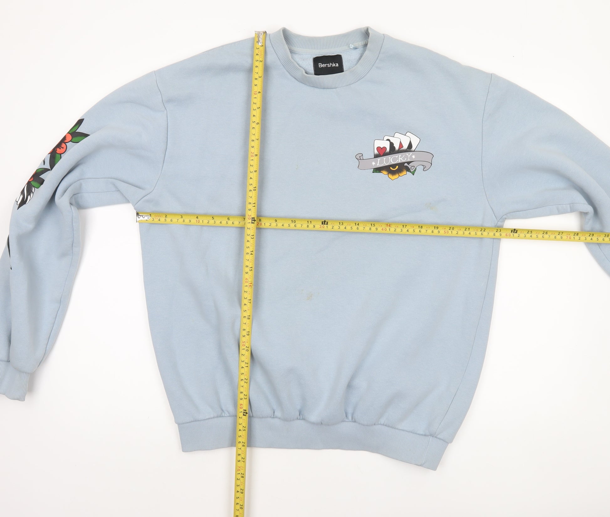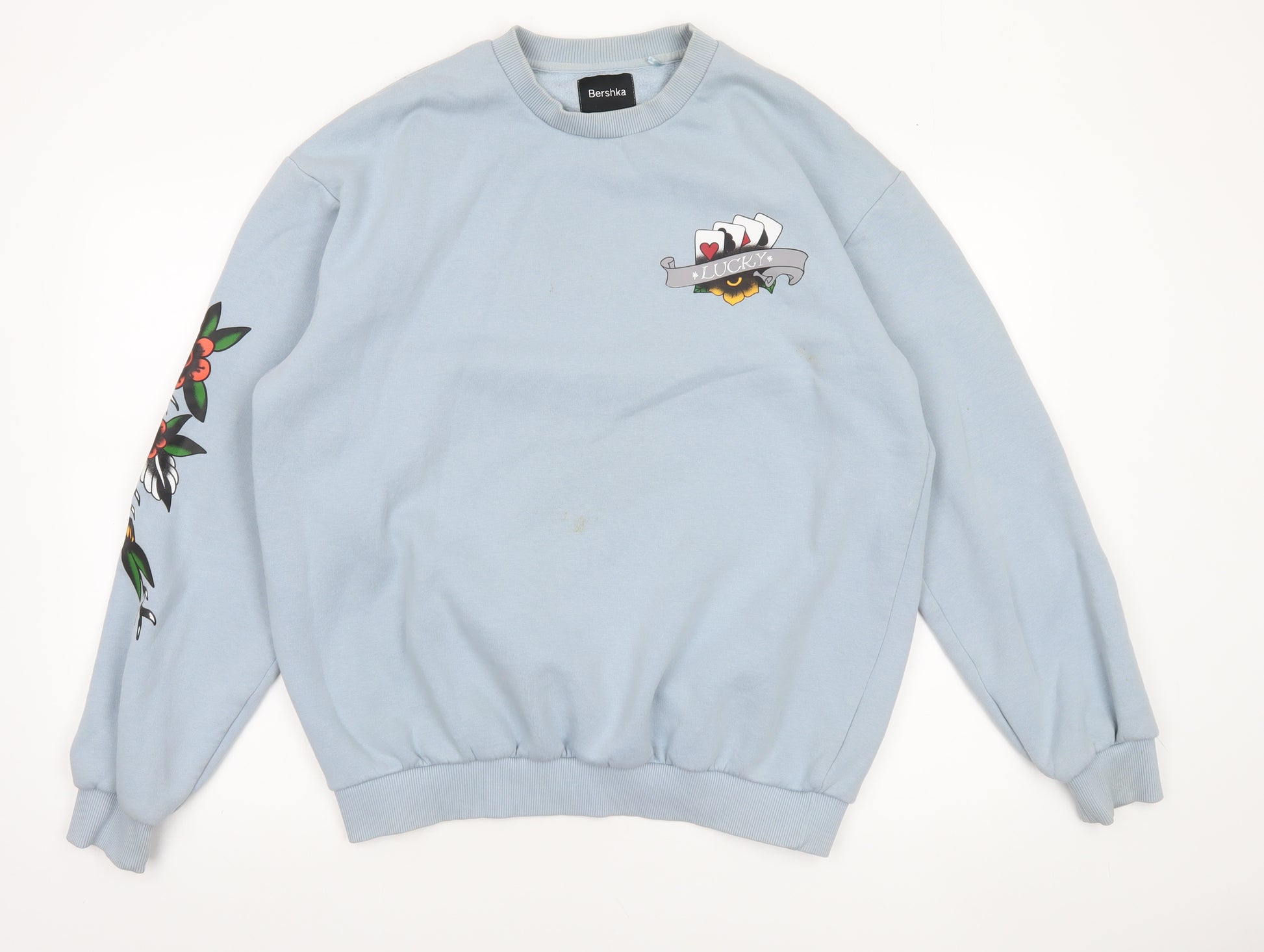 Add a splash of personality and street-inspired flair to your wardrobe with this Bershka men's blue graphic print sweatshirt in size M. Crafted from a soft fleece blend of 63% cotton and 37% polyester, this sweatshirt offers a comfortable fit and a cosy feel — perfect for everyday wear in the cooler seasons. The design features a striking tattoo-inspired motif on the back with a bold panther surrounded by vibrant flowers and banner-style graphics reading “Live Forever” and “Wanderlust,” bringing a confident artistic edge to casual styling. The crew neckline and ribbed cuffs enhance comfort, while the pullover design keeps it simple and easy to wear. The light blue tone provides a clean backdrop for the detailed prints on the chest, back, and sleeves, offering a stylish contrast that stands out without being too flashy. The sweatshirt’s relaxed regular fit makes it ideal for layering with jeans or joggers for laid-back weekends, streetwear looks, or everyday casual outfits. This versatile piece is suitable for autumn, spring, and winter wear and can be easily machine washed for fuss-free maintenance. While the item remains in very good used condition, faint marks are present on the front that do not detract from the overall appeal of the sweatshirt. A great find for anyone who appreciates bold graphics and Bershka’s signature contemporary design. Perfect for casual outings, meet-ups, or adding personality to an off-duty look, this sweatshirt strikes the right balance between comfort and creativity. Refresh your wardrobe and express your individuality effortlessly with this striking Bershka graphic print sweatshirt.