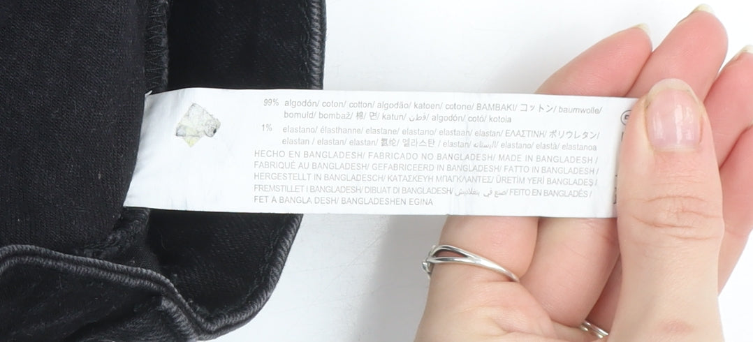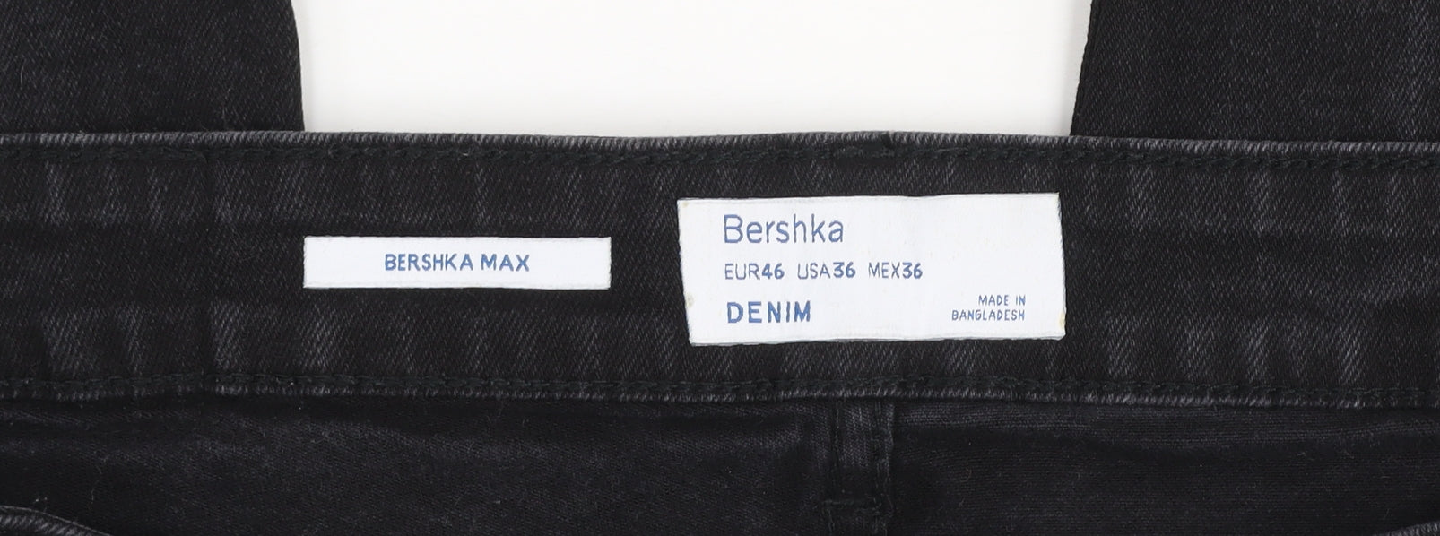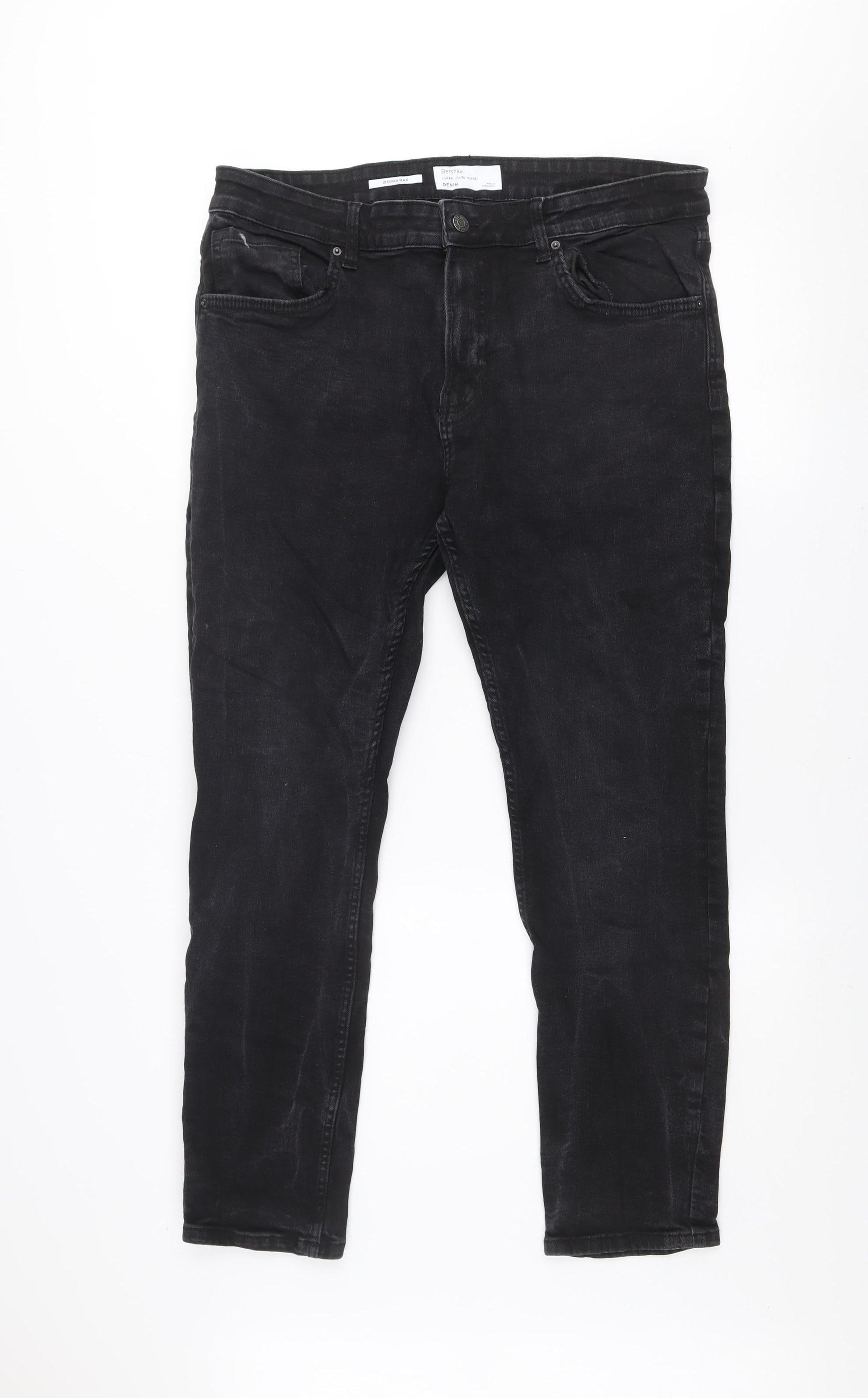 These Bershka Men’s Black Slim Straight Denim Jeans offer a refined yet comfortable fit perfect for both casual and smart-casual occasions. Crafted from high quality 99% cotton and 1% elastane, the jeans feature a subtle stretch that ensures freedom of movement without losing shape throughout the day. The classic black wash with a dark denim finish gives a sleek, modern edge suitable for pairing with anything from plain tees to smart shirts. Designed for everyday wear, the jeans have a mid-rise waist providing a comfortable fit that flatters different body types, while the straight leg presents a timeless silhouette that complements any footwear choice, from trainers to boots.Constructed with sturdy belt loops and a durable zip-and-button fastening, these jeans ensure practical wearability alongside style. The 5-pocket design reinforces the traditional jeans look, offering convenience while retaining a streamlined aesthetic. The premium dark denim fabric not only enhances the jeans’ versatility but also resists fading, making them a dependable option in your wardrobe rotation. Bershka’s attention to fabric quality and design detail ensures these jeans maintain their sleek appeal across seasons. With their breathable cotton base and light stretch, they are comfortable for both autumn and winter styling.Conditioned in excellent used shape, they show minimal signs of wear, maintaining overall quality and appearance. Perfect for everyday workwear, casual weekends, or a night out, these Bershka jeans combine understated style with long-lasting comfort and functionality. Their subtle stretch construction enhances fit retention and ease of movement throughout the day.Ideal for the man seeking classic black jeans with a modern slim profile. Make them your go-to denim piece for a crisp, adaptable look that never goes out of fashion — reliable, polished, and confidently understated.