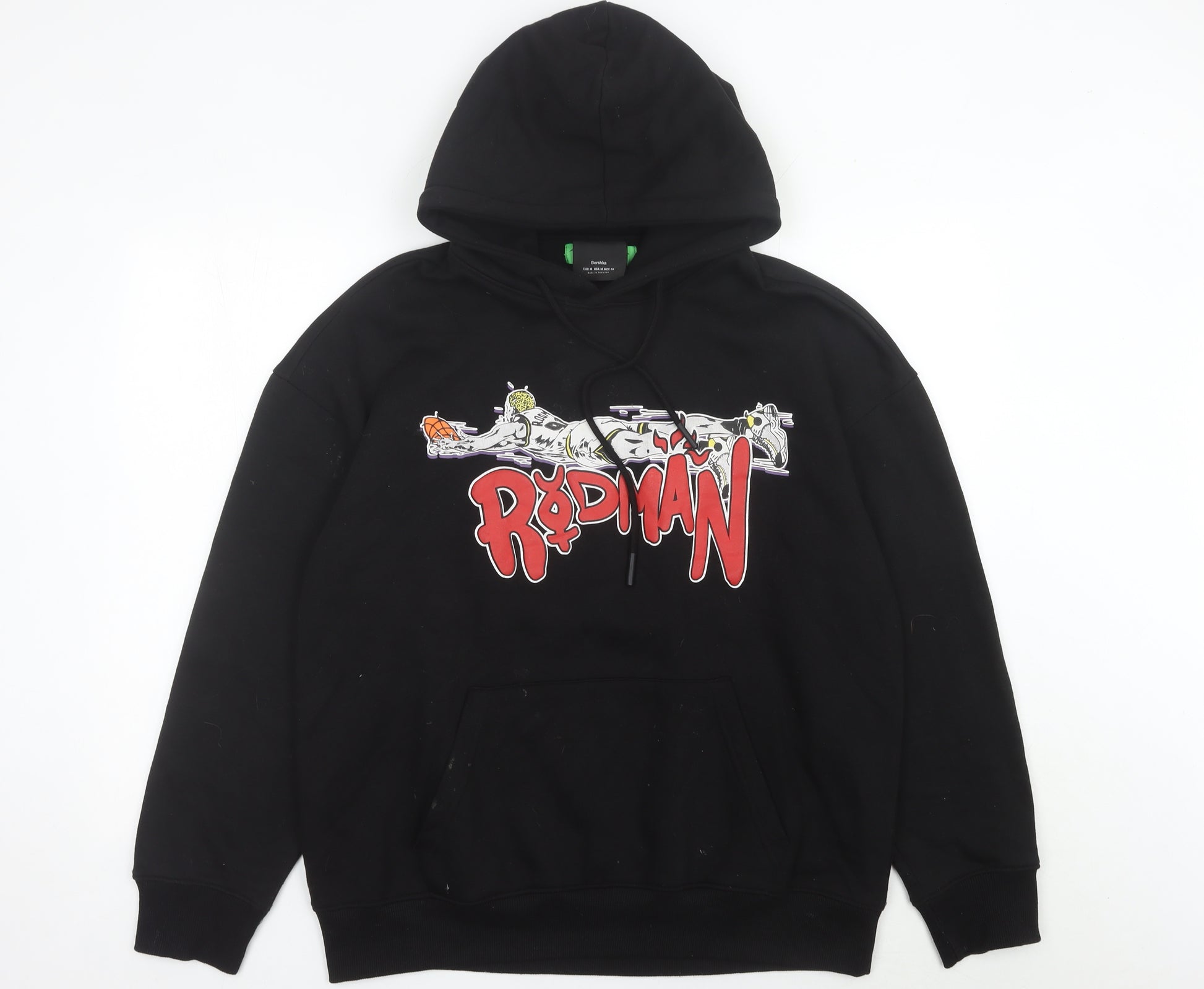 Step out in style and comfort with this Bershka unisex black hoodie, ideal for anyone looking to add a bold streetwear edge to their wardrobe. Designed in a classic pullover style with a spacious hood and kangaroo front pocket, this hoodie offers both practicality and an effortless urban fashion statement. Perfectly versatile for casual everyday wear, it blends style and comfort with ease.Crafted from a 60% cotton and 40% polyester blend, this hoodie ensures softness and breathability while maintaining durability and shape. The fabric mix makes it versatile enough for year-round wear, keeping it lightweight yet warm. The striking graphic design on the front features bold red “Rodman” lettering with illustrated accents, embodying a 90s retro and sports-inspired vibe. On the back, an eye-catching 'Bad As I Wanna Be' slogan with yellow patterned lettering adds a distinct personality to the piece, making it stand out in any crowd.The unisex fit allows styling flexibility across Women, Teens, and Unisex Adults departments, meaning it’s a great option whether you prefer a relaxed or slightly tailored silhouette. With long sleeves, ribbed cuffs and hem, this hoodie provides extra comfort and a secure fit while keeping out the chill during cooler weather.Fashion-forward yet practical, this hoodie features classic accents including the bold graphic print and logo-inspired detailing, making it an excellent pick for casual occasions, streetwear styling, or relaxed travel outfits. Whether paired with jeans, joggers, or layered under a jacket, this iconic piece transitions seamlessly between looks. Its pullover closure and soft interior lining further enhance its wearability, ensuring maximum comfort without compromising design.Given its excellent used condition with minor visible lint, this hoodie has been well kept and maintains strong wearability for many more seasons to come. It is perfectly priced for those seeking a stylish statement hoodie at a fraction of retail pricing, and it appeals strongly to fans of bold graphic prints, retro 90s style, or unique Bershka designs. Add this standout Bershka hoodie to your streetwear lineup and enjoy the perfect balance of style, comfort, and individuality.