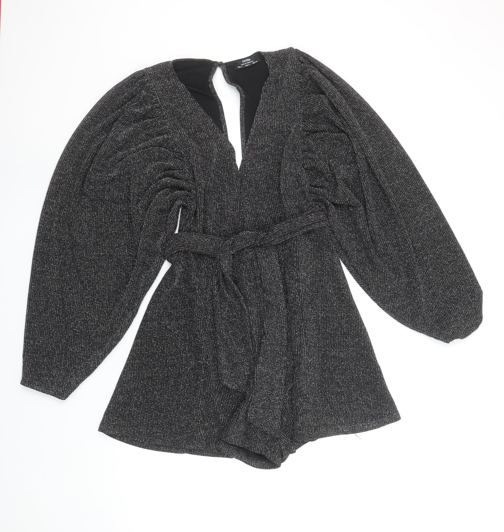 Step into timeless sophistication with this stunning black playsuit by Bershka, designed for women who want both comfort and elegance. This one-piece outfit features a deep V-neckline and softly draped balloon sleeves, making it a striking option for parties and evening occasions. Crafted from a high-quality woven blend of nylon and polyester, it offers a subtle shimmer and smooth texture that feels lightweight and flexible for easy wear. The belted waist defines your silhouette effortlessly, adding a touch of femininity while enhancing your natural curves. The long sleeves make it ideal for cooler seasons, such as autumn and winter, giving you warmth without compromising on style. A convenient back button closure adds a discreet finishing touch to the overall sleek look. Perfect for cocktail events or stylish nights out, this versatile piece can be paired with heels and bold accessories for a glamorous ensemble. Its minimalist design and shimmering texture ensure it stands out without being over the top. The high-quality material blend of 69% nylon and 17% polyester provides durability and a comfortable stretch fit. The condition of this item is excellent, showing minimal to no signs of prior wear. Add this Bershka black playsuit to your wardrobe to enjoy a contemporary twist on chic evening wear that’s effortlessly fashionable, flattering, and easy to style for any festive or semi-formal occasion. Whether you're attending a dinner, a club night, or a seasonal gathering, this playsuit combines modern tailoring with everyday practicality, ensuring you look polished and feel confident every time you wear it.