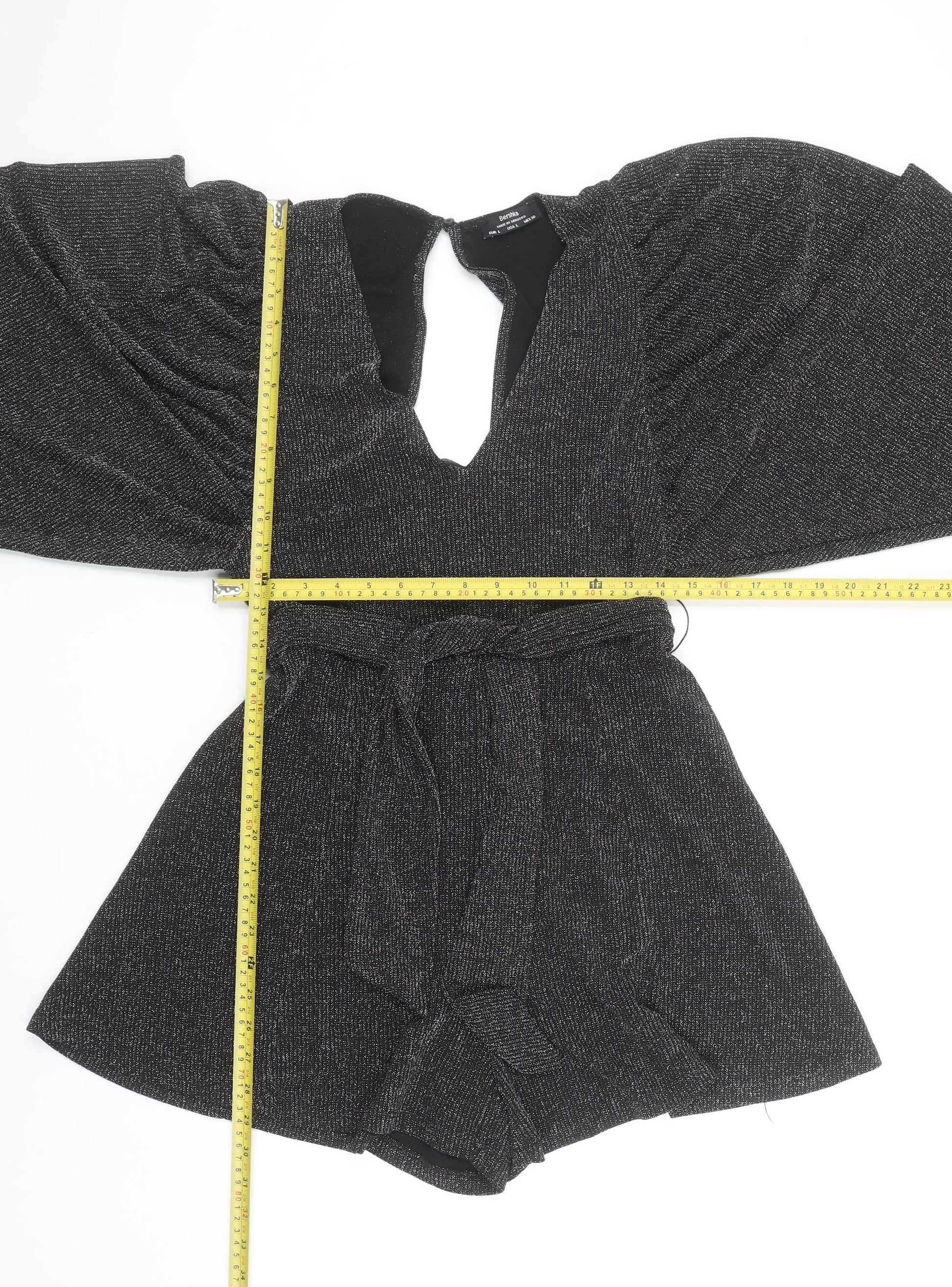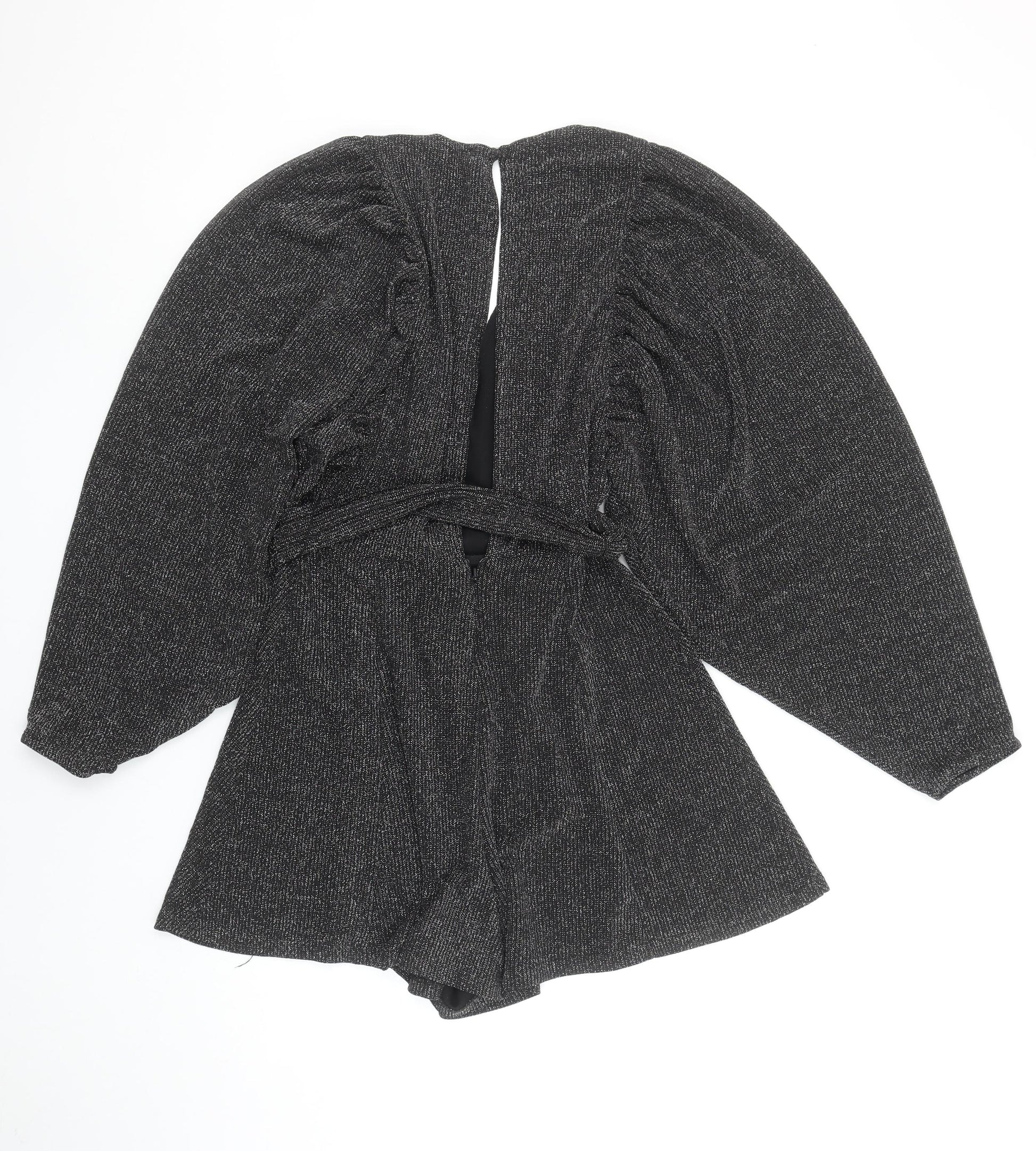Women Black L Long Sleeve V-Neck Belted Playsuit Size 14