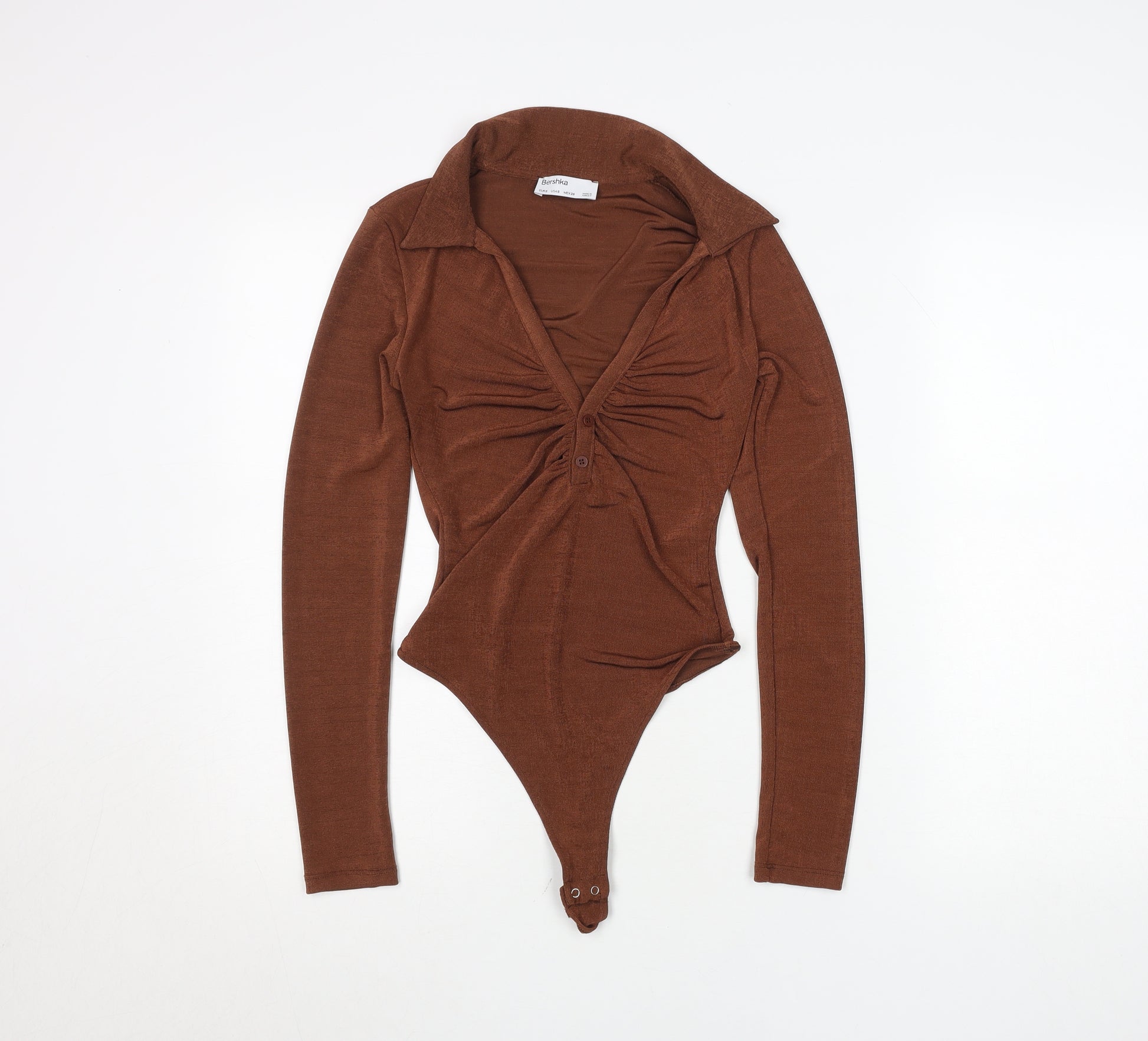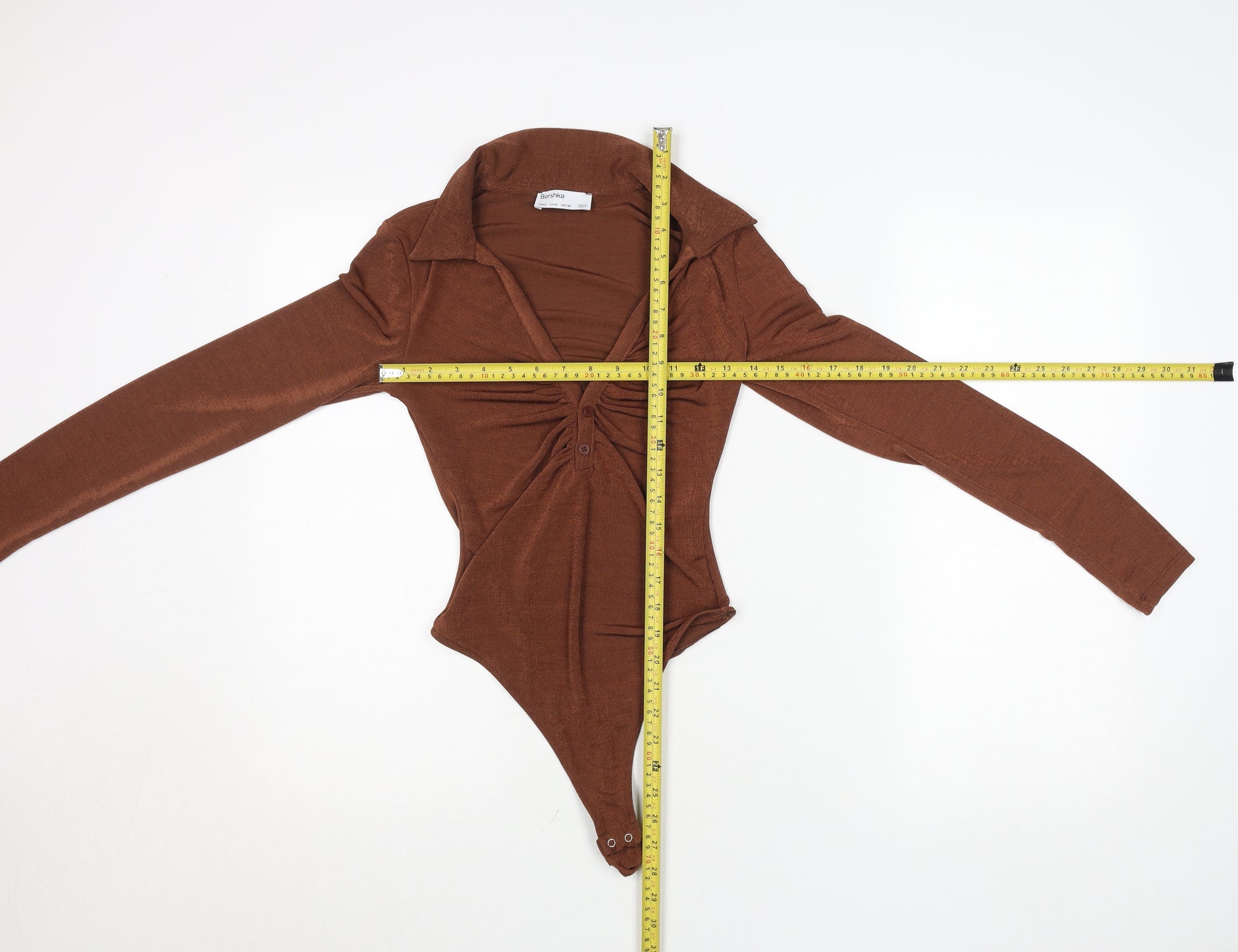 This Bershka women’s brown bodysuit is a sleek and stylish one-piece designed with a flattering slim fit. Crafted in a soft and lightweight jersey blend of viscose, polyester, and elastane, it ensures comfort while maintaining a sculpted silhouette. The long sleeves and collared neckline add a touch of smart-casual sophistication, making it perfect for layering under blazers or statement outfits for any occasion. The ruched front detail and button fastening enhance the shape and create a modern, feminine look. The fabric has a slight stretch, allowing for ease of movement without losing form throughout the day. Finished in a rich chocolate brown tone, this versatile shade complements both neutral and bold colour palettes. Ideal for daily wear, going out, or transitional season styling, the bodysuit offers a polished appearance with minimal effort. Whether paired with high-waisted jeans or a tailored skirt, this Bershka bodysuit delivers effortless elegance. Its practical popper fastening at the base ensures all-day comfort and convenience. Machine washable for easy care, it’s an excellent wardrobe essential that balances comfort and chic appeal. The piece is in excellent pre-owned condition, showing only minimal signs of wear, with the fabric and buttons fully intact. A fashionable staple for smart-casual dressing, this Bershka collared long sleeve bodysuit makes everyday styling simple and refined.