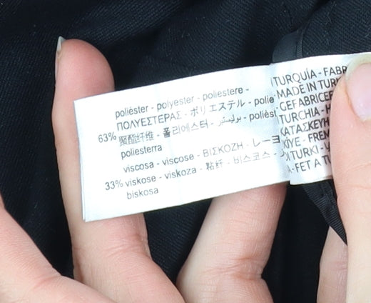 These Bershka women’s black trousers offer a sleek modern profile blended with timeless versatility, ideal for both casual and workwear occasions. Crafted from a quality fabric mix of 63% polyester and 33% viscose, the trousers provide a smooth and slightly structured drape that flatters the figure while maintaining everyday comfort. Their twill texture delivers a subtle sheen for a polished finish, making them perfect for dressing up or down as needed. Designed in a high-rise, flat-front style with a wide-leg silhouette, they create an effortlessly elegant look suitable for office days, social gatherings, or smart-casual weekends. The classic black hue makes them easy to pair with blouses, shirts, or knitwear through multiple seasons — from crisp autumn days to cool spring evenings. Featuring a button and zip fastening for a secure fit, these trousers also incorporate convenient pockets for practicality and understated detailing. The regular fit ensures comfort without compromising on streamlined shape, enhancing their all-day wear appeal. With their lightweight yet durable fabric blend, they remain breathable and easy to care for, maintaining shape and form after washes. Although gently used, these trousers remain in very good condition, showing only a small mark near the thigh area that does not affect their overall wearability or appearance. Perfect for anyone seeking a versatile wardrobe staple that combines comfort and sophisticated style, these Bershka wide-leg trousers will easily complement both casual and professional outfits. Add these trousers to your wardrobe for a refined look that transitions seamlessly from desk to dinner, offering the ideal mix of classic elegance and modern comfort.