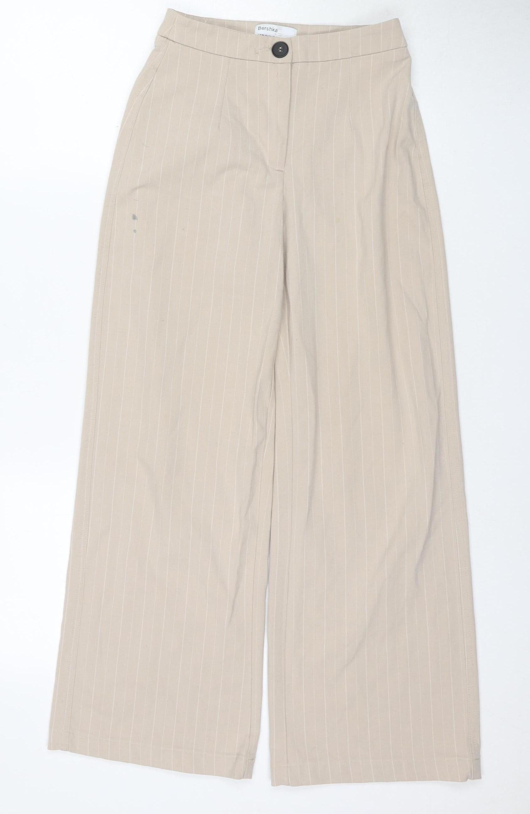Elevate your wardrobe with these chic Bershka Women's Beige Striped Trousers, perfect for both casual and business occasions. Crafted from a soft and breathable blend of polyester, viscose, and elastane, these trousers ensure comfort and style. The regular fit with a straight leg style offers a classic silhouette, making them a versatile addition to any outfit. Featuring a flat front with a complimentary button accent, these trousers boast a modern mid-rise design, providing a comfortable yet fashionable look. The striped pattern in a neutral beige shade is perfect for transitioning between seasons, making these trousers ideal for both autumn and spring. Enhance your style with its breathable material perfect for daily wear. These trousers are machine washable, ensuring easy care and maintenance. The trousers are in very good condition with some minor marks on the fabric, adding a touch of flair to your wardrobe without compromising on quality. Whether you're heading to the office or enjoying a weekend outing, these trousers are a reliable choice for every occasion. Don't miss the chance to own this versatile piece, offering style and comfort in one package. Grab yours now and enjoy the timeless elegance they bring to your clothing collection.
