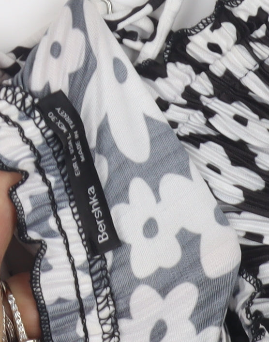 Step into style with this trendy Bershka camisole, designed for the modern woman who loves a blend of comfort and fashion. Featuring a classic black base adorned with charming floral patterns, this camisole is the perfect addition to any summer wardrobe. The lightweight jersey fabric ensures a comfortable wear, while the stretchy material offers a snug yet flexible fit. Designed with a regular fit, this top flatters all body types and is ideal for casual day outings or relaxed evenings. The sleeveless design with delicate spaghetti straps provides breathability and freedom of movement during warmer months. Easy to style, it pairs beautifully with high-waisted jeans or a flowing skirt. Embrace effortless elegance with this versatile piece, perfect for adding a touch of floral flair to your everyday look.