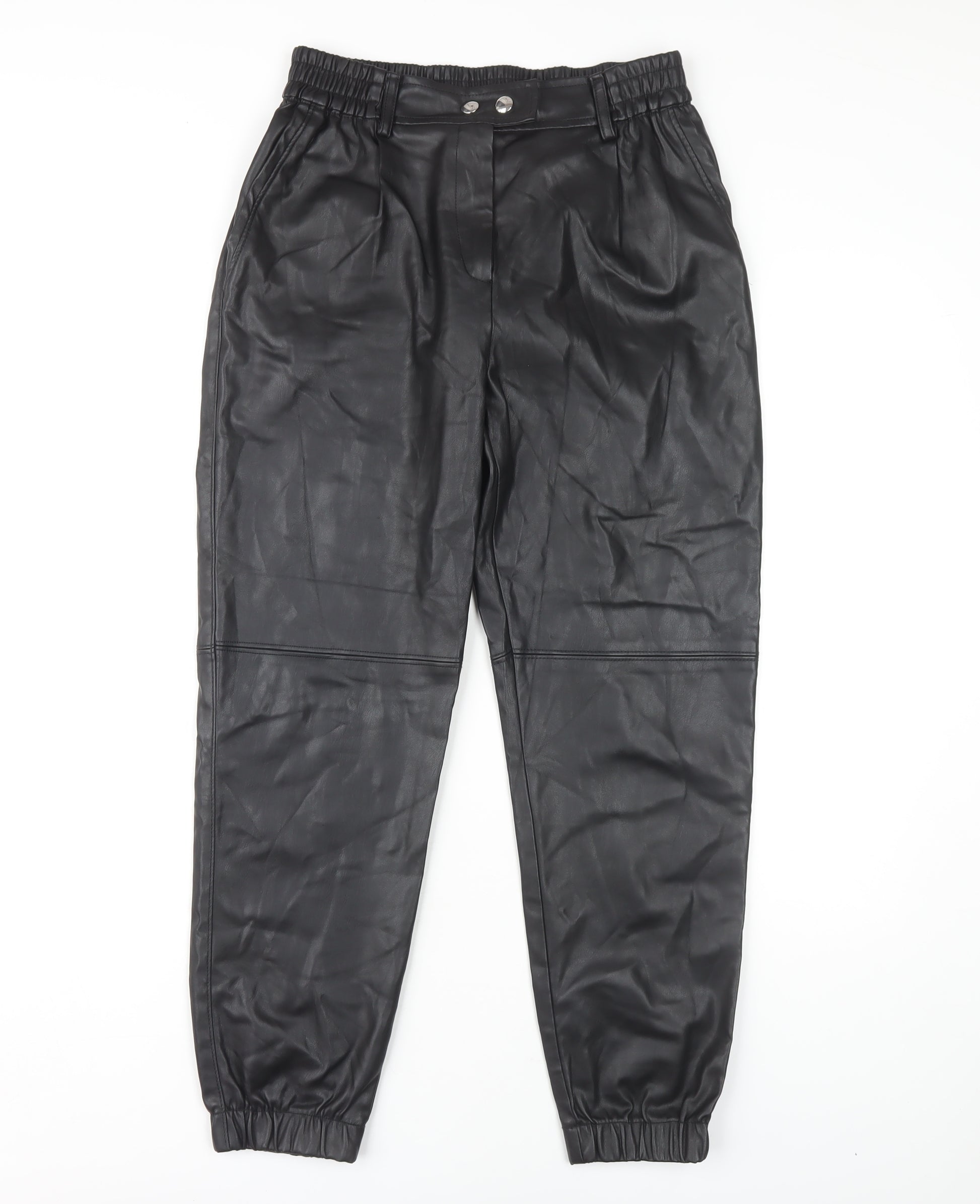 Elevate your casual wardrobe with these stylish black jogger trousers from Bershka. Crafted entirely from polyurethane, these trousers offer a sleek, leather-like finish that is perfect for the modern woman. Designed with a tapered leg style and elastic waist, they provide both comfort and a flattering fit. Ideal for autumn and winter seasons, they can be effortlessly paired with a variety of tops for versatile looks. Whether you're heading out for a casual outing or simply relaxing at home, these joggers are a chic choice. Complete with button accents and a flat front design, they maintain a minimalist yet modern aesthetic. Easy to care for being machine washable, these trousers deliver both style and practicality. Don't miss the chance to add these new with tags trousers to your collection.