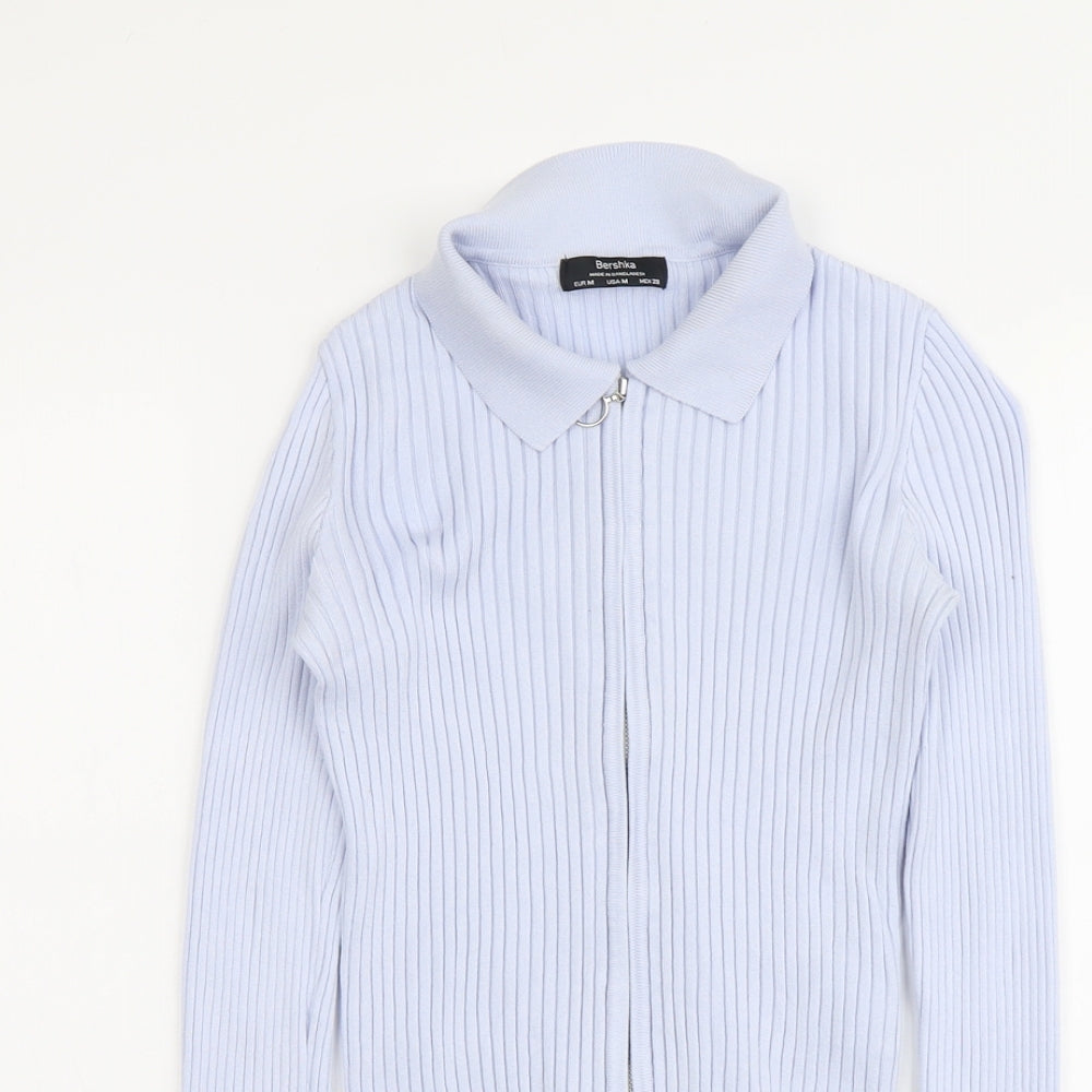 Womens Blue Collared Viscose Full Zip Jumper Size M - Ribbed