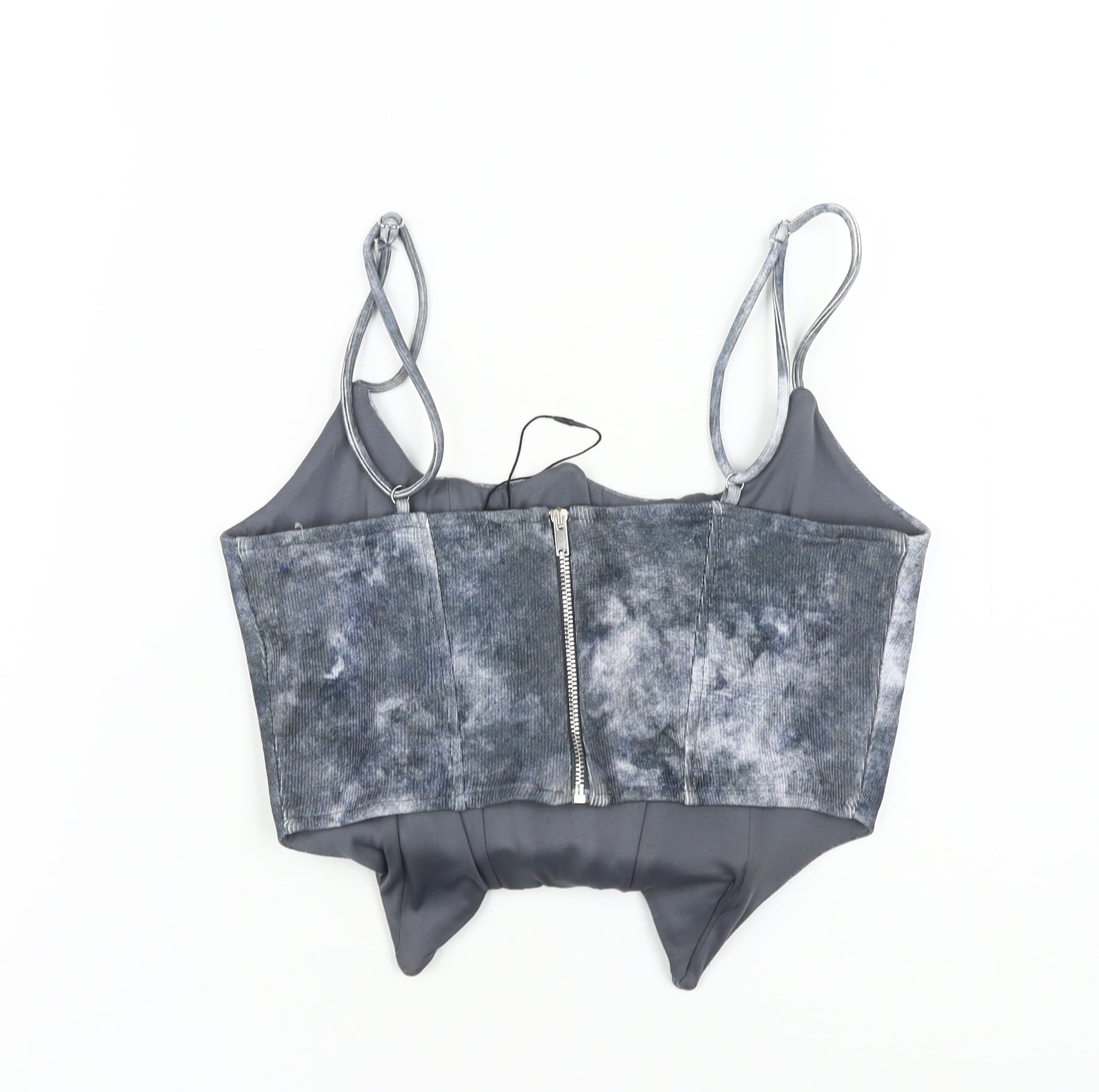 Elevate your summer wardrobe with this stylish Bershka camisole top. Designed for a sleek and modern look, this sleeveless grey top features a scoop neckline and spaghetti straps, making it perfect for warmer seasons. Crafted from a comfortable knit fabric blend of polyester and elastane, it offers both stretch and breathability for all-day comfort. The back zip closure adds a touch of edgy style while ensuring a secure fit. This versatile piece is ideal for casual occasions, pairing effortlessly with jeans, skirts, or shorts for a chic, laid-back ensemble. Although lightly worn, this camisole remains in excellent condition and is ready to be a staple in your collection. Grab this must-have piece at an affordable price and showcase your fashion-forward sense all year round.