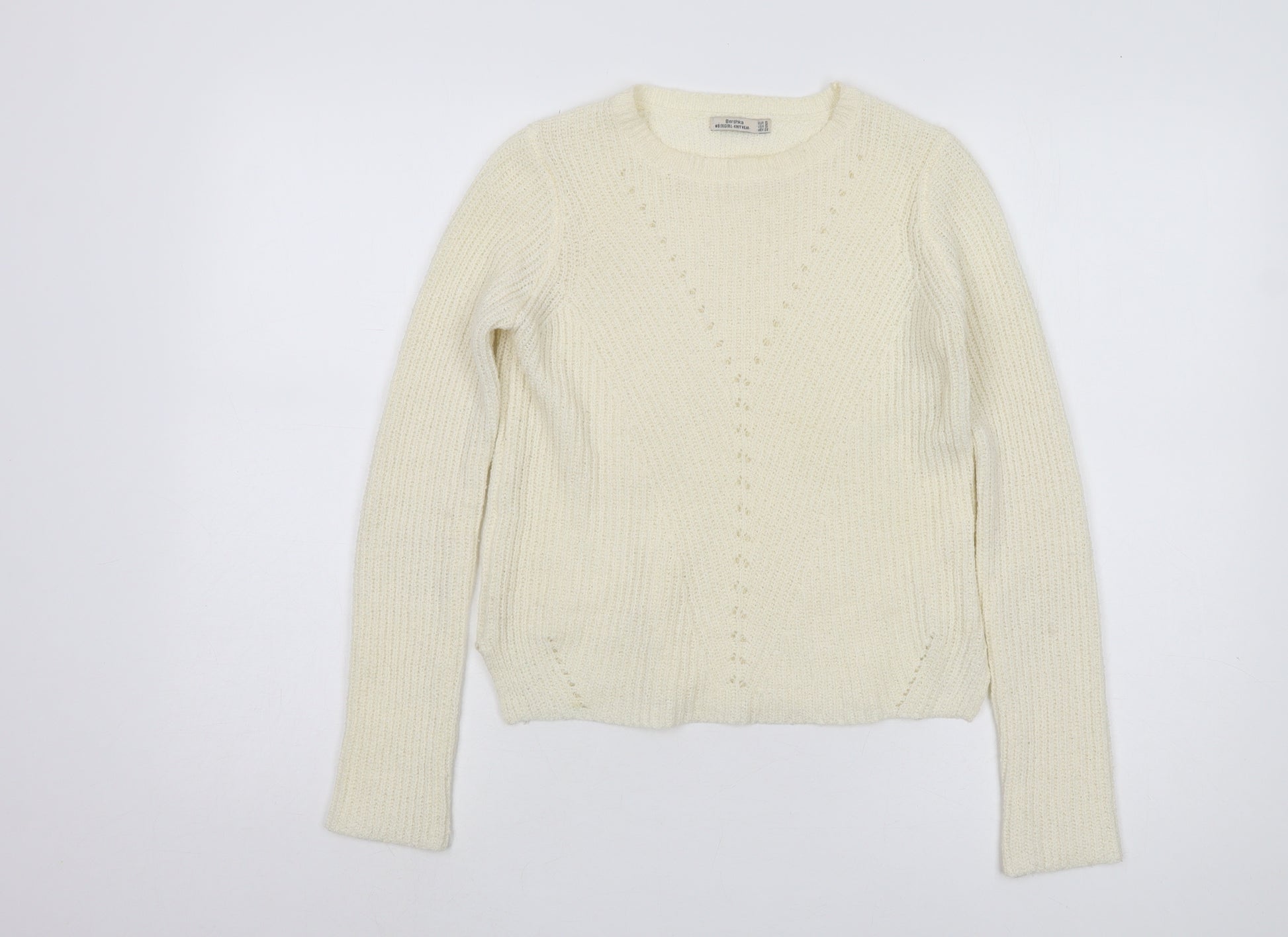 Embrace cosy elegance with this Bershka Women's Ivory Wool Blend Pullover Jumper. Designed for the modern woman, this sweater features a classic round neck and a comfortable regular fit, perfect for everyday casual wear during the autumn and winter seasons. Crafted from a luxurious wool blend, it ensures warmth while maintaining a lightweight feel. The chunky-knit style adds texture and interest, making it a stylish choice for layering. This versatile jumper, in a soft ivory hue, pairs beautifully with jeans or skirts, making it a must-have addition to your wardrobe. Ideal for both work and play, its simple yet sophisticated design will keep you chic and comfortable. Excellent condition with no visible defects, offering timeless appeal at a fantastic price.