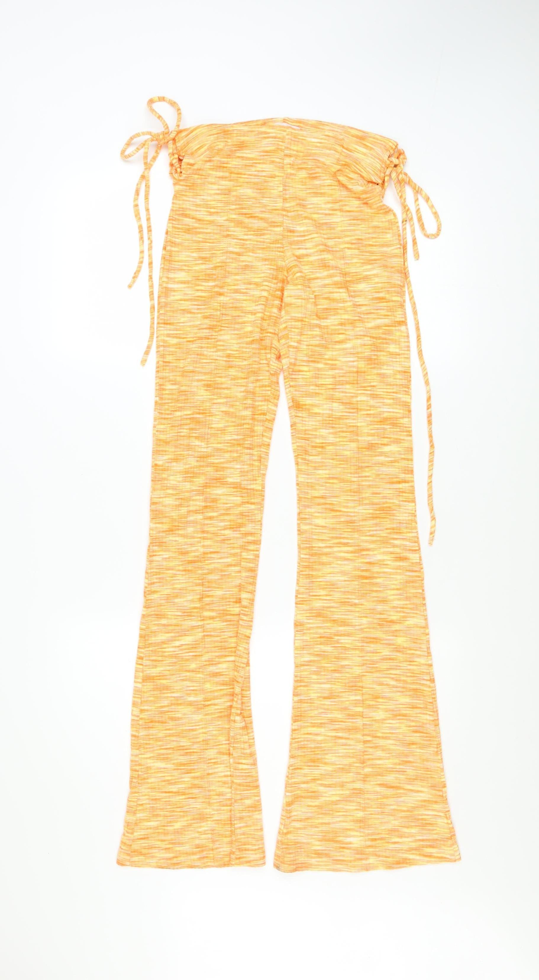 Step into effortless warm-weather style with these vibrant orange flared trousers from Bershka. Perfectly tailored for the woman who loves comfort and fashionable flair, these trousers combine a relaxed fit with a flattering silhouette. Crafted from a soft jersey fabric blend of 91% viscose and 9% elastane, they offer a smooth, lightweight feel with just the right amount of stretch for all-day ease. The mid-rise waist with adjustable drawstring ties ensures a personalised fit, while the subtle ruched detailing at the sides adds a trendy, playful touch. Designed in a cheerful orange marled pattern, these trousers bring an upbeat energy ideal for spring and summer styling. The flared leg creates an elongating effect that pairs effortlessly with crop tops, camis, or relaxed blouses for a versatile casual look. Whether you’re heading to brunch, strolling on holiday, or lounging in style, these trousers deliver flexibility, comfort, and on-trend appeal. Made with machine-washable fabric, maintenance is easy, letting you enjoy them without fuss. With their retro-inspired 70s shape and soft, breathable viscose construction, they make an ideal choice for those who value both fashion and feel-good comfort. A quality piece from Bershka that embodies fun, functionality, and fashion-forward living—these trousers are set to become a statement favourite in your casual wardrobe. In excellent condition, they show minimal signs of previous wear and have been well cared for. Add a pop of sunshine to your every day with these flattering, easy-wearing flared trousers from Bershka that mix effortless chic with all-day comfort.