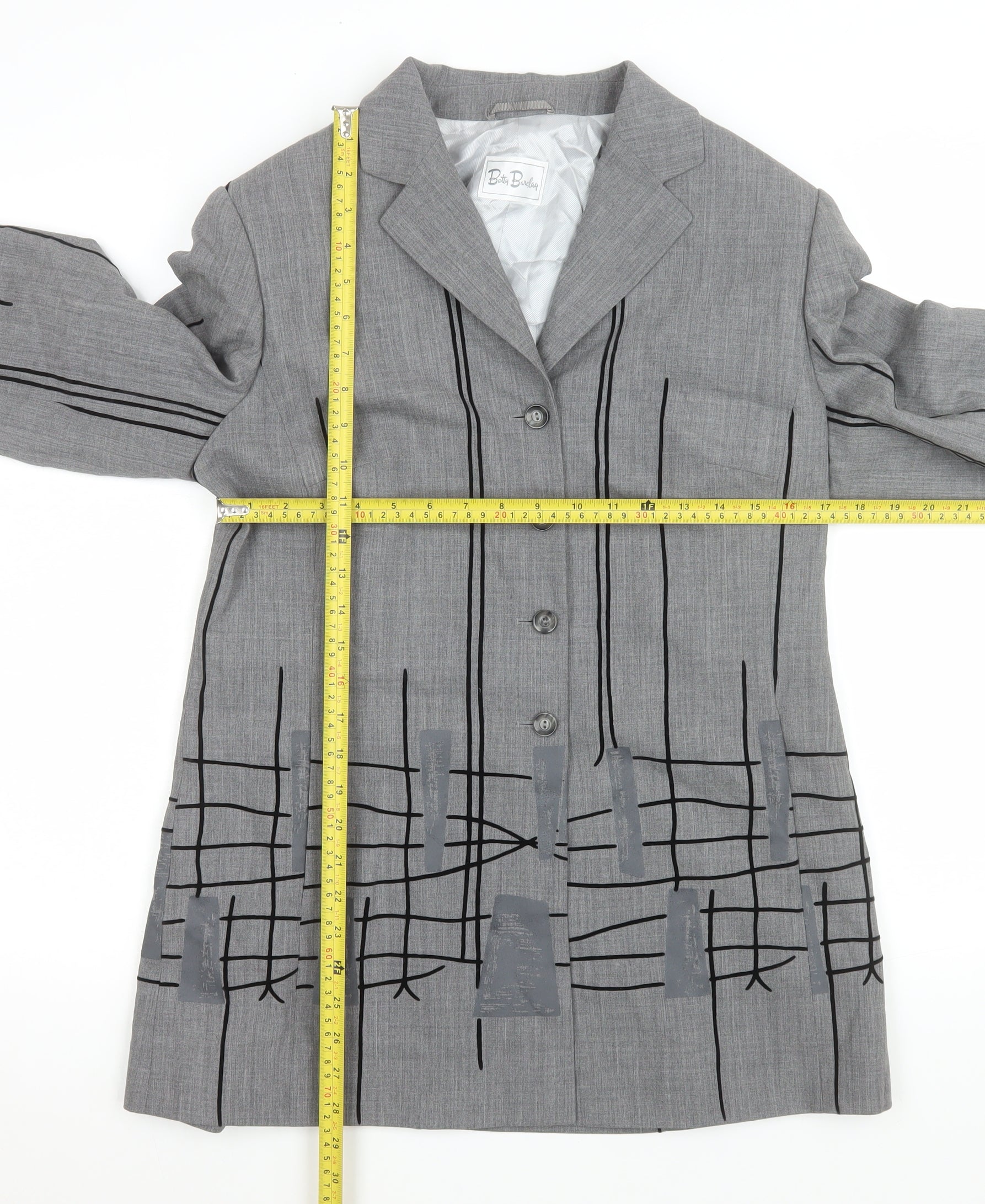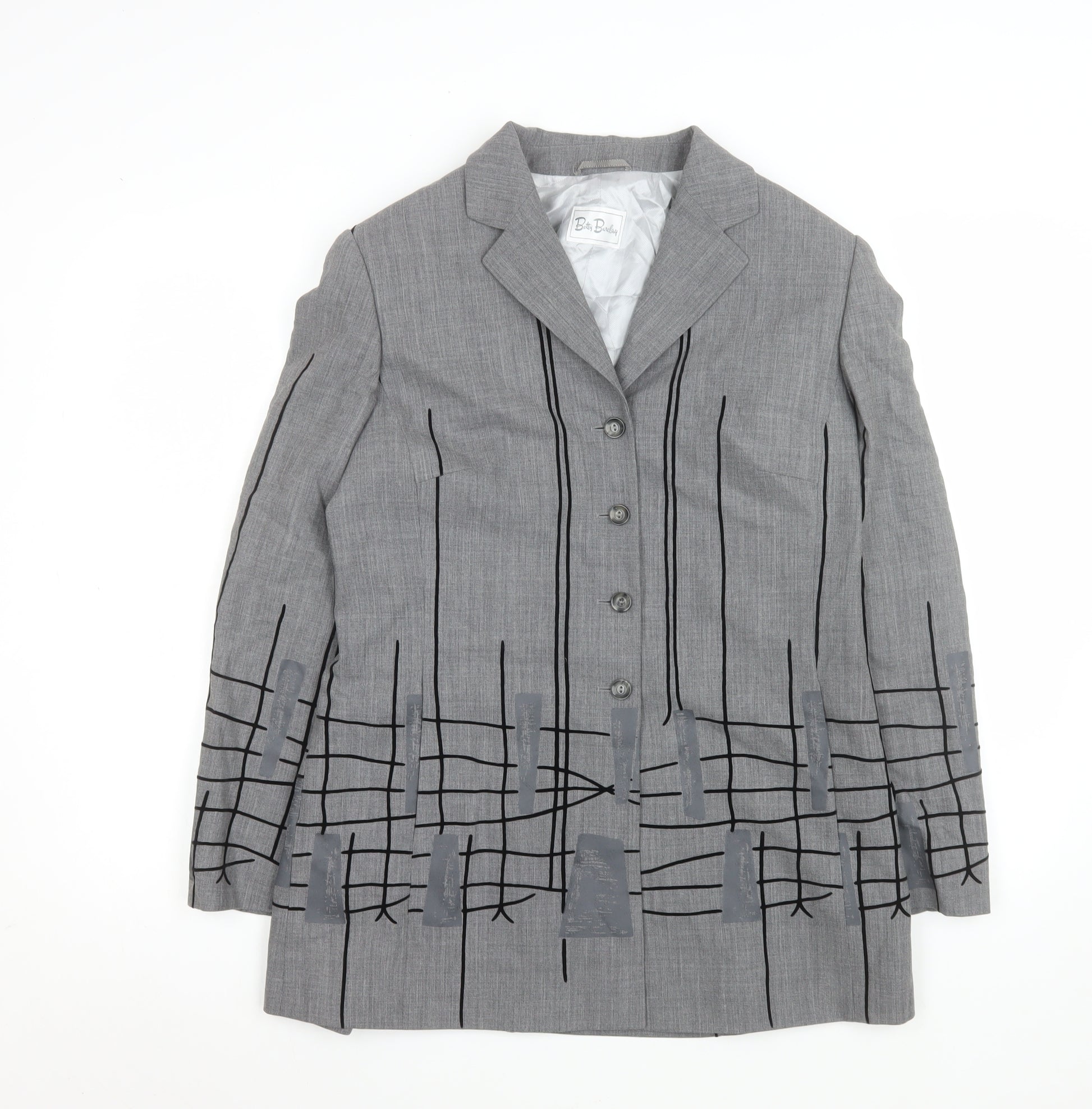 This beautifully tailored Betty Barclay women’s blazer in size UK 14 is a sophisticated addition to any wardrobe. Crafted from 100% pure new wool, this fully lined jacket combines timeless structure with a modern aesthetic. The striking grey fabric features a woven texture with a geometric-style linear black pattern, adding a unique and contemporary twist to classic tailoring. The single-breasted three-button front closure complements the notched lapel, giving it a polished finish suited for business, workwear or semi-formal occasions. Designed for a flattering classic fit, it provides just the right structure while maintaining comfort and movement. The blazer includes long sleeves, full lining in a silky polyester material, and a mid-length cut that enhances its professional silhouette. Perfect for wearing with tailored trousers or over a dress, this piece easily transitions from daytime office wear to evening events. Crafted with premium new wool, it promises durability, warmth, and luxury feel. Light surface wear on one sleeve is visible, consistent with excellent pre-owned condition but notably well-kept and maintained. A quality piece that embodies Betty Barclay’s reputation for refined contemporary style and high-quality craftsmanship. Ideal for those seeking an elegant yet modern wardrobe essential for the cooler seasons of autumn, spring, and winter, this designer blazer will elevate your ensemble effortlessly.